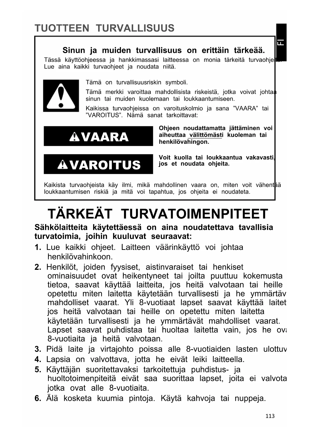 TUOTTEEN TURVALLISUUS Sinun ja muiden turvallisuus on erittäin tärkeää. Tässä käyttöohjeessa ja hankkimassasi laitteessa on monia tärkeitä turvaohjeita. Lue aina kaikki turvaohjeet ja noudata niitä. Tämä on turvallisuusriskin symboli. Tämä merkki varoittaa mahdollisista riskeistä, jotka voivat johtaa sinun tai muiden kuolemaan tai loukkaantumiseen. Kaikissa turvaohjeissa on varoituskolmio ja sana ”VAARA” tai ”VAROITUS”. Nämä sanat tarkoittavat: VAARA Ohjeen noudattamatta jättäminen voi aiheuttaa välittömästi kuoleman tai henkilövahingon. VAROITUS Voit kuolla tai loukkaantua vakavasti, jos et noudata ohjeita. Kaikista turvaohjeista käy ilmi, mikä mahdollinen vaara on, miten voit vähentää loukkaantumisen riskiä ja mitä voi tapahtua, jos ohjeita ei noudateta.