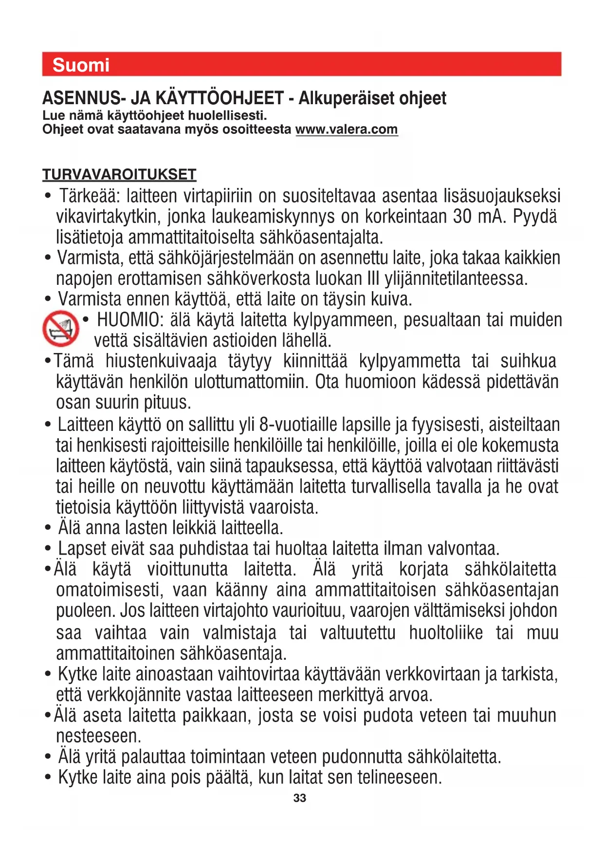 HUOLTO Kun hiustenkuivaaja ei ole käytössä, seinätelineessä olevan kytkimen on oltava pois päältä -asennossa (0). Laite ei vaadi mitään erityisiä huoltotöitä. Puhdista laite vedellä kostutetulla liinalla. HUOMIO: Hiustenkuivaajan puhdistuksessa ei saa missään tapauksessa käyttää puhdistusaineita, liuotinaineita, alkoholia tai muita kemiallisia tuotteita. Puhdista ilmanottoritilä tarvittaessa harjalla tai pölynimurilla. Tärkeää Tämä hiustenkuivaaja vastaa sähkölaitteiden turvallisuusmääräyksiä. Hiustenkuivaajassa on turvatermostaatti. Jos laite ylikuumenee, se kytkeytyy automaattisesti pois päältä. Vähän ajan kuluttua laite jatkaa toimintaa. Tarkista ennen jokaista käyttöä, että laitteen ilmanotto- ja poistoritilät ovat täysin puhtaat. Tämä laite vastaa Euroopan parlamentin ja neuvoston direktiivejä 2014/30/EU, 2014/35/EU, 2011/65/EC, 2015/863/EU, 2009/125/EC sekä asetusta (EC) nro 1275/2008. VALERA on Ligo Electric S.A:n (Sveitsi) rekisteröity tavaramerkki. Symboli , joka on merkitty tuotteeseen tai sen pakkaukseen, osoittaa, että tuotetta ei saa käsitellä talousjätteenä. Tuote on sensijaan luovutettava sopivaan sähkö ja elektroniikkaalaitteiden kierrätyksestä huolehtivaan keräyspisteeseen. Tämän tuotteen asianmukaisen hävittämisen varmistamisella, autetaan estämään sen mahdolliset ympäristöön ja terveyteen kohdistuvat haittavaikutukset, joita voi aiheutua muussa tapauksessa tämän tuotteen epäasianmukaisesta jätekäsittelystä. Tarkempia tietoja tämän tuotteen kierrättämisestä saat kuntasi jäteasiota hoitavalta viranomaiselta tai liikkeestä josta tuote on ostettu. TAKUU VALERA myöntää ostamallesi laitteelle takuun seuraavien ehtojen mukaisesti: