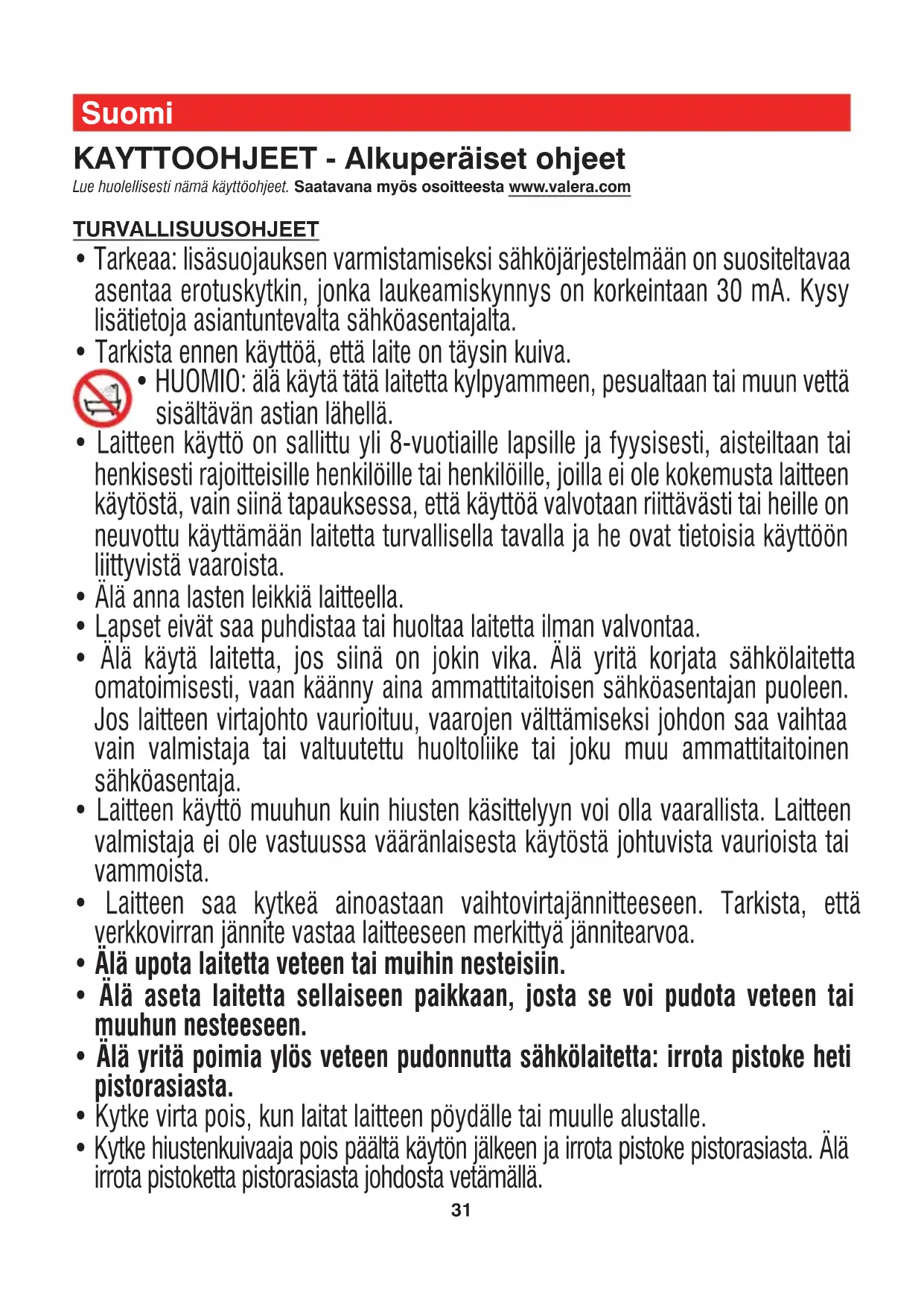 - Älä yritä poimia ylös veteen pudonnutta sähkölaitetta: irrota pistoke heti pistorasiasta.