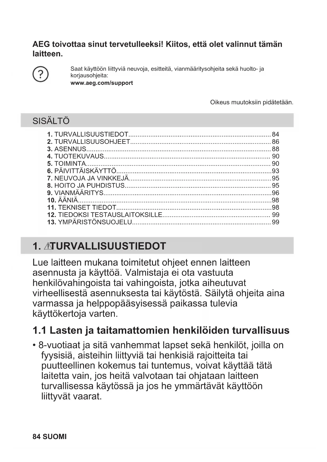 Kierrätä materiaalit, jotka on merkitty merkillä . Kierrätä pakkaus laittamalla se asianmukaiseen kierrätysastiaan. Suojele ympäristöä ja ihmisten terveyttä kierrättämällä sähkö- ja elektroniikkaromut. Älä hävitä merkillä merkittyjä kodinkoneita kotitalousjätteen mukana. Palauta tuote paikalliseen kierrätyskeskukseen tai ota yhteyttä paikalliseen viranomaiseen. SUOMI 99Bienvenue chez AEG ! Nous vous remercions d’avoir choisi l’un de nos appareils. Obtenir des conseils d’utilisation, des brochures, un dépanneur, des informations surle service et les réparations :www.aeg.com/supportSous réserve de modifications.