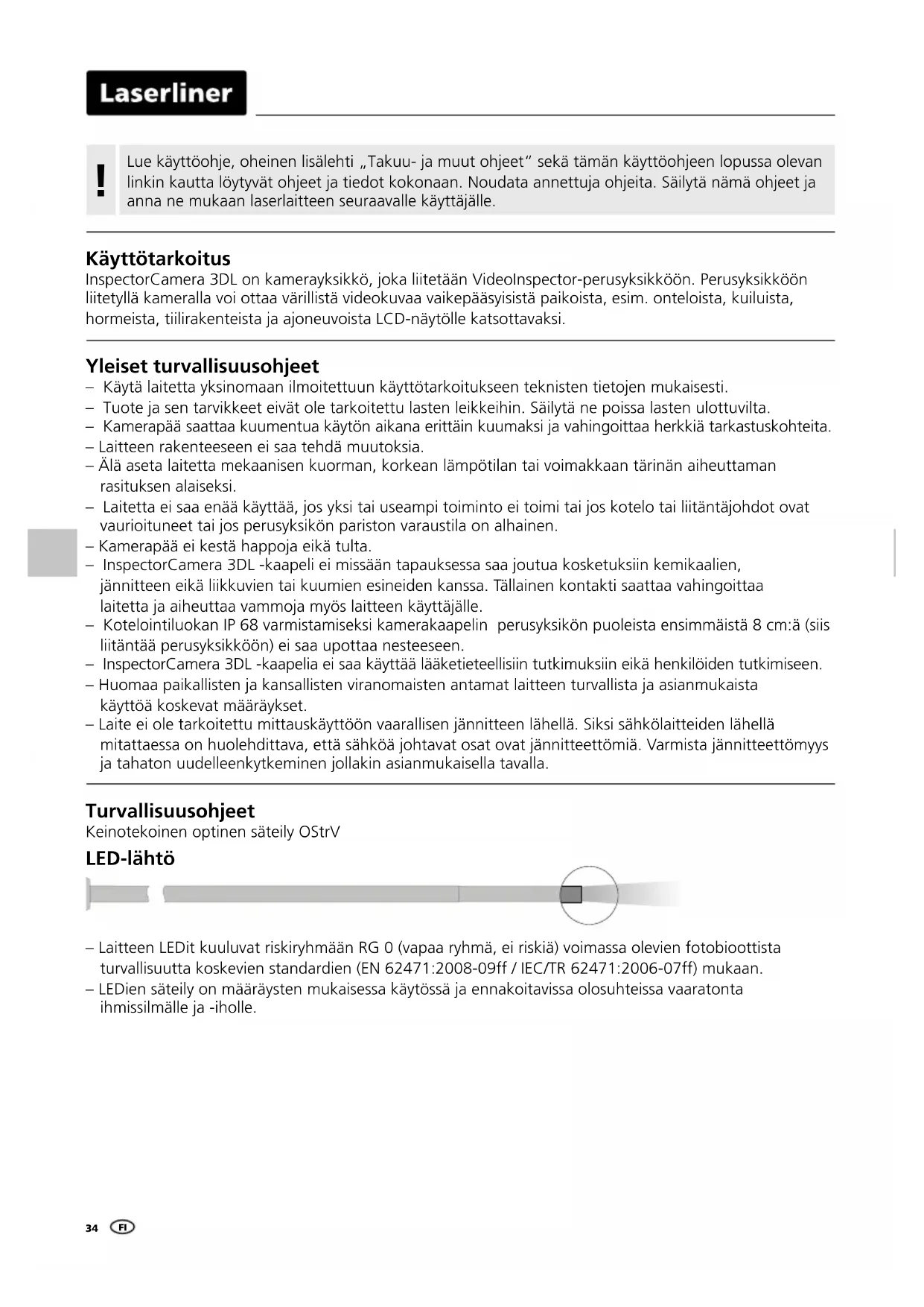 Käyttötarkoitus InspectorCamera 3DL on kamerayksikkö, joka liitetään VideoInspector-perusyksikköön. Perusyksikköön liitetyllä kameralla voi ottaa värillistä videokuvaa vaikepääsyisistä paikoista, esim. onteloista, kuiluista, hormeista, tiilirakenteista ja ajoneuvoista LCD-näytölle katsottavaksi. Yleiset turvallisuusohjeet – Käytä laitetta yksinomaan ilmoitettuun käyttötarkoitukseen teknisten tietojen mukaisesti. – Tuote ja sen tarvikkeet eivät ole tarkoitettu lasten leikkeihin. Säilytä ne poissa lasten ulottuvilta. – Kamerapää saattaa kuumentua käytön aikana erittäin kuumaksi ja vahingoittaa herkkiä tarkastuskohteita. – Laitteen rakenteeseen ei saa tehdä muutoksia. – Älä aseta laitetta mekaanisen kuorman, korkean lämpötilan tai voimakkaan tärinän aiheuttaman rasituksen alaiseksi. – Laitetta ei saa enää käyttää, jos yksi tai useampi toiminto ei toimi tai jos kotelo tai liitäntäjohdot ovat vaurioituneet tai jos perusyksikön pariston varaustila on alhainen. – Kamerapää ei kestä happoja eikä tulta. – InspectorCamera 3DL -kaapeli ei missään tapauksessa saa joutua kosketuksiin kemikaalien, jännitteen eikä liikkuvien tai kuumien esineiden kanssa. Tällainen kontakti saattaa vahingoittaa laitetta ja aiheuttaa vammoja myös laitteen käyttäjälle. – Kotelointiluokan IP 68 varmistamiseksi kamerakaapelin perusyksikön puoleista ensimmäistä 8 cm:ä (siis liitäntää perusyksikköön) ei saa upottaa nesteeseen. – InspectorCamera 3DL -kaapelia ei saa käyttää lääketieteellisiin tutkimuksiin eikä henkilöiden tutkimiseen. – Huomaa paikallisten ja kansallisten viranomaisten antamat laitteen turvallista ja asianmukaista käyttöä koskevat määräykset. – Laite ei ole tarkoitettu mittauskäyttöön vaarallisen jännitteen lähellä. Siksi sähkölaitteiden lähellä mitattaessa on huolehdittava, että sähköä johtavat osat ovat jännitteettömiä. Varmista jännitteettömyys ja tahaton uudelleenkytkeminen jollakin asianmukaisella tavalla. Turvallisuusohjeet Keinotekoinen optinen säteily OStrV LED-lähtö – Laitteen LEDit kuuluvat riskiryhmään RG 0 (vapaa ryhmä, ei riskiä) voimassa olevien fotobioottista turvallisuutta koskevien standardien (EN 62471:2008-09ff / IEC/TR 62471:2006-07ff) mukaan. – LEDien säteily on määräysten mukaisessa käytössä ja ennakoitavissa olosuhteissa vaaratonta ihmissilmälle ja -iholle. Lue käyttöohje, oheinen lisälehti „Takuu- ja muut ohjeet“ sekä tämän käyttöohjeen lopussa olevan linkin kautta löytyvät ohjeet ja tiedot kokonaan. Noudata annettuja ohjeita. Säilytä nämä ohjeet ja anna ne mukaan laserlaitteen seuraavalle käyttäjälle. !InspectorCamera 3DL