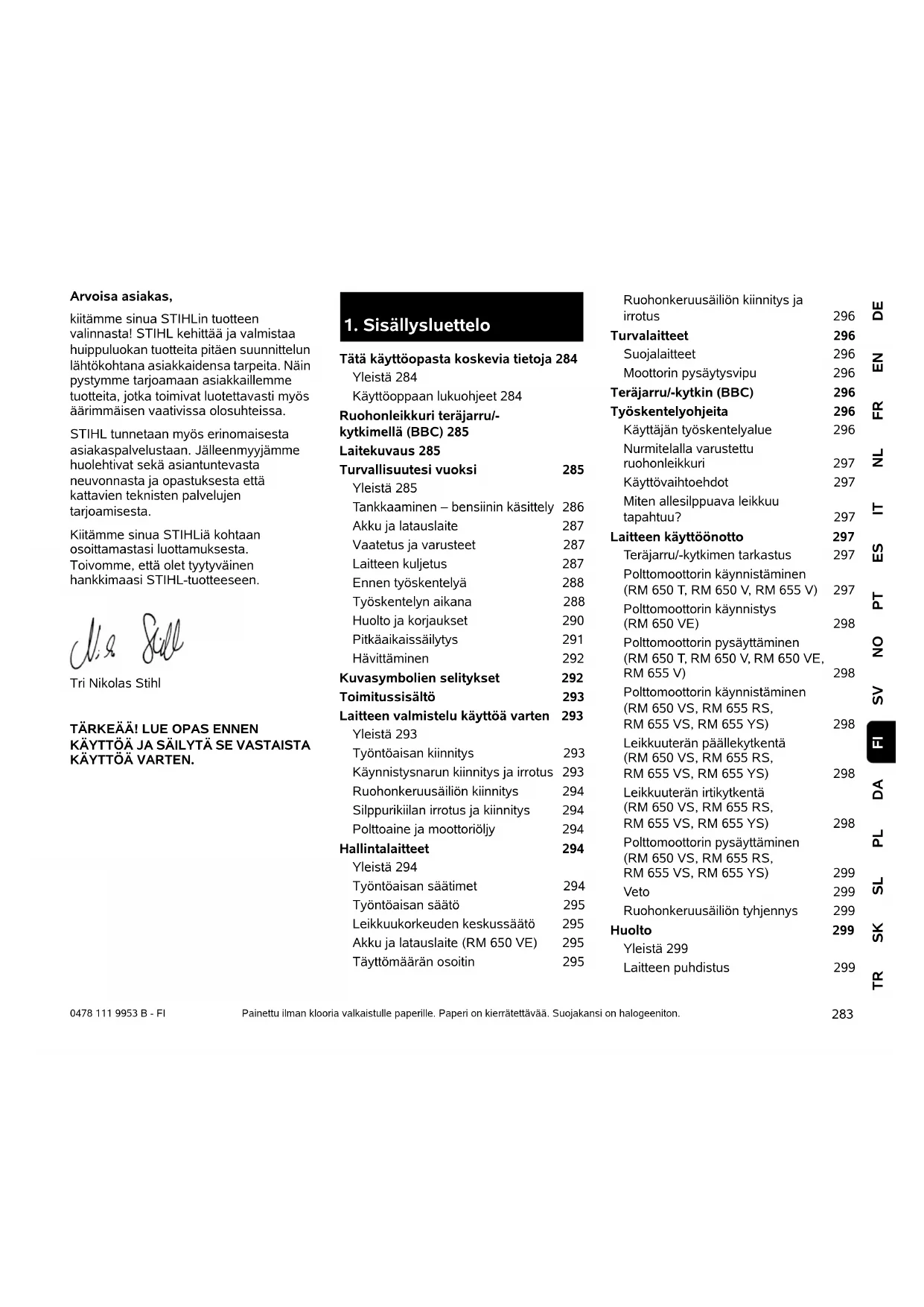 Tätä käyttöopasta koskevia tietoja 284 Yleistä 284 Käyttöoppaan lukuohjeet 284 Ruohonleikkuri teräjarru/- kytkimellä (BBC) 285 Laitekuvaus 285 Turvallisuutesi vuoksi 285 Yleistä 285 Tankkaaminen – bensiinin käsittely 286 Akku ja latauslaite 287 Vaatetus ja varusteet 287 Laitteen kuljetus 287 Ennen työskentelyä 288 Työskentelyn aikana 288 Huolto ja korjaukset 290 Pitkäaikaissäilytys 291 Hävittäminen 292 Kuvasymbolien selitykset 292 Toimitussisältö 293 Laitteen valmistelu käyttöä varten 293 Yleistä 293 Työntöaisan kiinnitys 293 Käynnistysnarun kiinnitys ja irrotus 293 Ruohonkeruusäiliön kiinnitys 294 Silppurikiilan irrotus ja kiinnitys 294 Polttoaine ja moottoriöljy 294 Hallintalaitteet 294 Yleistä 294 Työntöaisan säätimet 294 Työntöaisan säätö 295 Leikkuukorkeuden keskussäätö 295 Akku ja latauslaite (RM 650 VE) 295 Täyttömäärän osoitin 295 Ruohonkeruusäiliön kiinnitys ja irrotus 296 Turvalaitteet 296 Suojalaitteet 296 Moottorin pysäytysvipu 296 Teräjarru/-kytkin (BBC) 296 Työskentelyohjeita 296 Käyttäjän työskentelyalue 296 Nurmitelalla varustettu ruohonleikkuri 297 Käyttövaihtoehdot 297 Miten allesilppuava leikkuu tapahtuu? 297 Laitteen käyttöönotto 297 Teräjarru/-kytkimen tarkastus 297 Polttomoottorin käynnistäminen (RM 650 T, RM 650 V, RM 655 V) 297 Polttomoottorin käynnistys (RM 650 VE) 298 Polttomoottorin pysäyttäminen (RM 650 T, RM 650 V, RM 650 VE, RM 655 V) 298 Polttomoottorin käynnistäminen (RM 650 VS, RM 655 RS, RM 655 VS, RM 655 YS) 298 Leikkuuterän päällekytkentä (RM 650 VS, RM 655 RS, RM 655 VS, RM 655 YS) 298 Leikkuuterän irtikytkentä (RM 650 VS, RM 655 RS, RM 655 VS, RM 655 YS) 298 Polttomoottorin pysäyttäminen (RM 650 VS, RM 655 RS, RM 655 VS, RM 655 YS) 299 Veto 299 Ruohonkeruusäiliön tyhjennys 299 Huolto 299 Yleistä 299 Laitteen puhdistus 2990478 111 9953 B - FI
