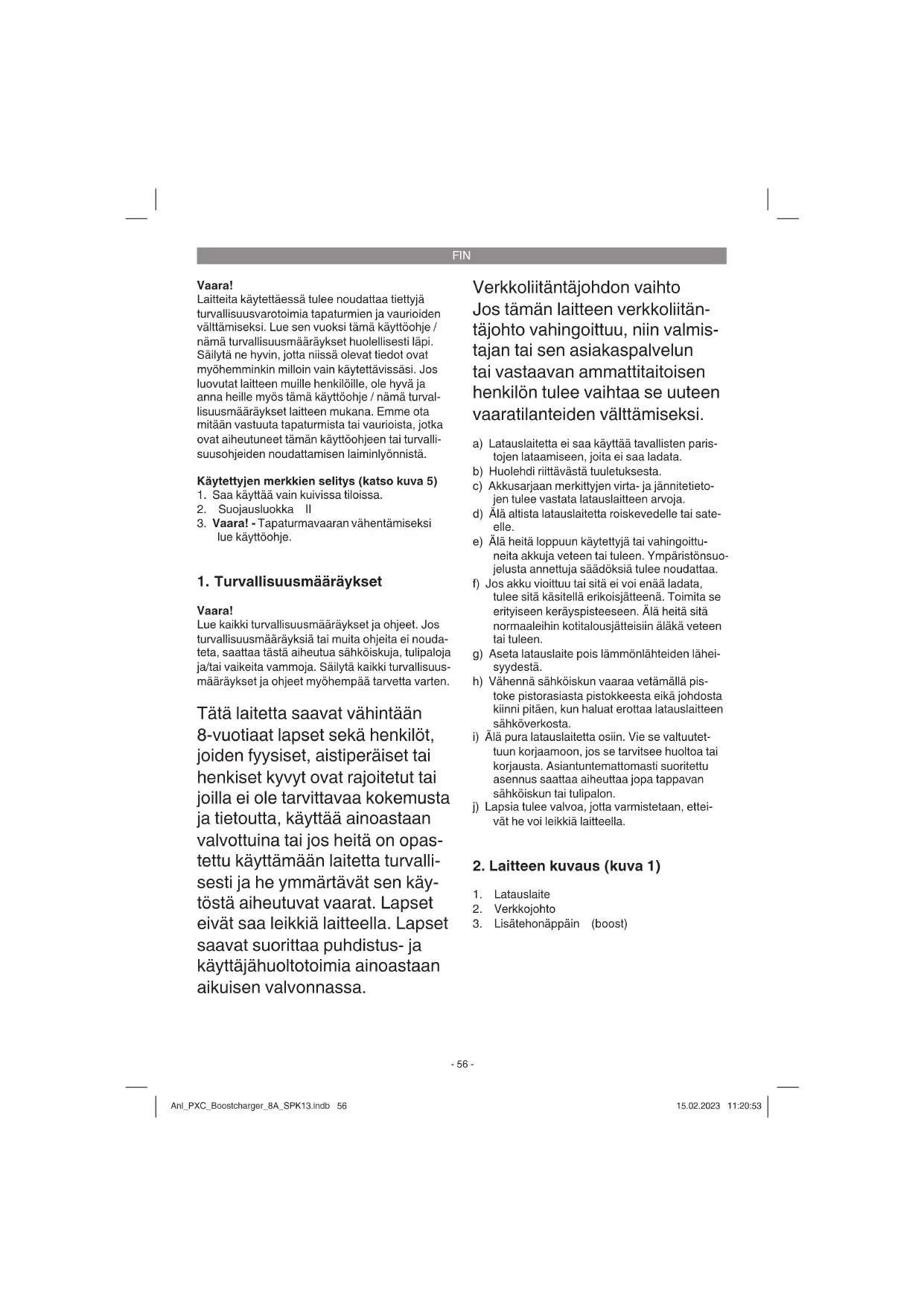 Laitteen sisällä ei ole muita huoltoa tarvitsevia osia. Laitetta ei saa purkaa osiin. Jos laite on vahingoit- tunut, ota yhteyttä toimittajaan tai valmistajaan. Anl_PXC_Boostcharger_8A_SPK13.indb 57Anl_PXC_Boostcharger_8A_SPK13.indb 57 15.02.2023 11:20:5415.02.2023 11:20:54FIN