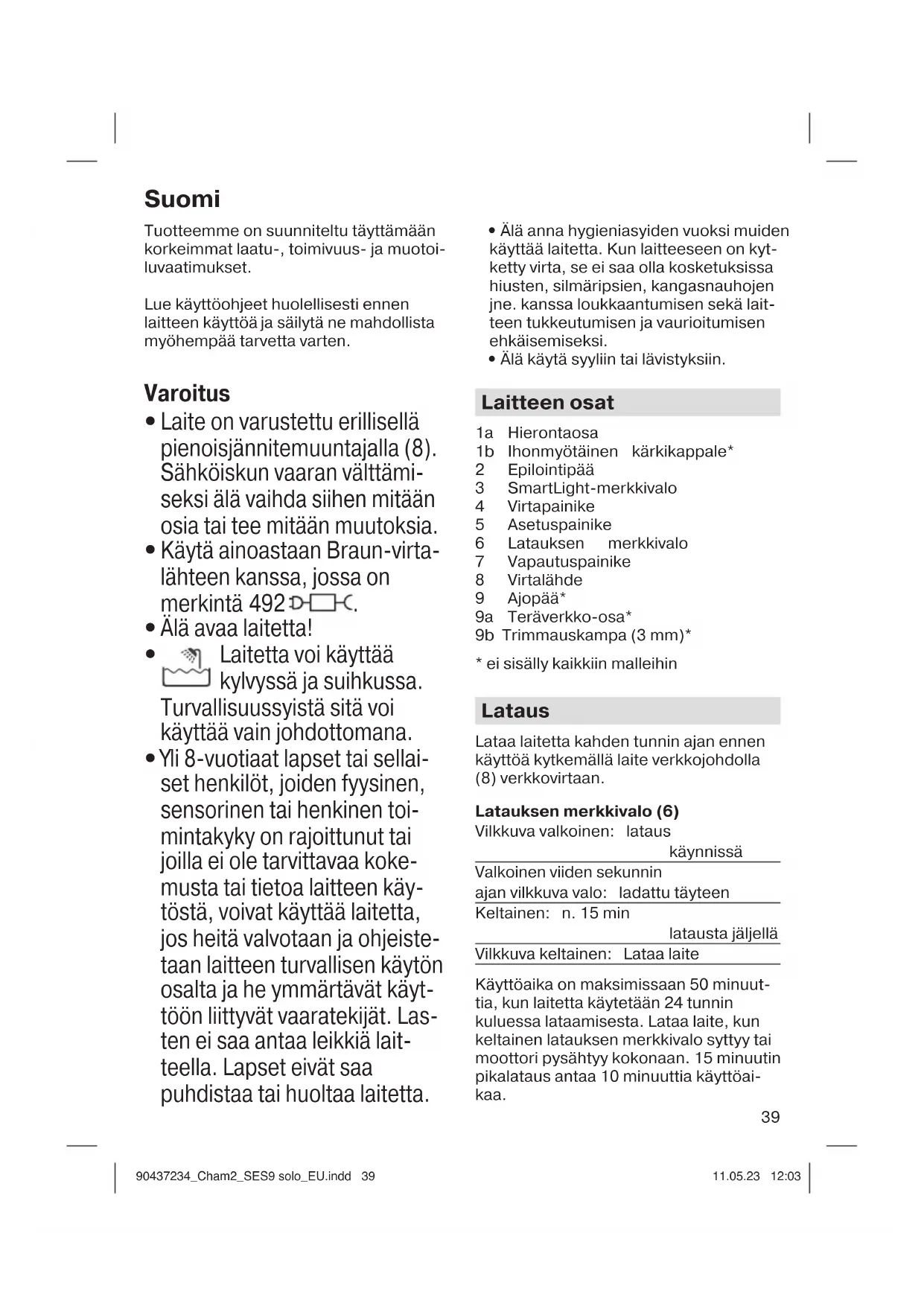 - Kuorinta auttaa ehkäisemään ihokar- vojen kasvua sisäänpäin ja luo optimaali- set olosuhteet epiloinnille. Epilointi Varmista, että epilointipää (2) on puhdas. Mallista riippuen kiinnitä sopiva kärkikap- pale: Hierontaosa (1a): paras mukavuus Ihonmyötäinen kärkikappale (1b): tehok- kaampi käsittely Käyttö kuivana: Ihon tulee olla kuiva, eikä siinä saa olla rasvaa tai voiteita. Käyttö märkänä: Pidä iho hyvin kostutet- tuna, niin laite liukuu parhaalla mahdolli- sella tavalla. Varmista, että epilointipää (2) on puhdas ja varustettu kärkiosalla. Venytä ihoa aina epiloinnin aikana. Ohjaa laitetta valon suuntaan painamatta, hitaalla, jatkuvalla liikkeellä ihokarvojen kasvusuuntaa vastaan. Sääret: Pidä jalka suoraksi ojennettuna, kun poistat ihokarvoja polvitaipeesta. 90437234_Cham2_SES9 solo_EU.indd 4090437234_Cham2_SES9 solo_EU.indd 40 11.05.23 12:0311.05.23 12:0341 Herkät alueet: Ennen käsittelyä, poista tuotteen jäämät (kuten deodorantin) ja kuivaa herkät alueet. Pidä kainaloita epiloidessasi käsi- vartta kohotettuna, jolloin iho venyy, ja ohjaa laitetta eri suuntiin. Iho saattaa olla herkempi epiloinnin jälkeen, joten vältä ihoa ärsyttävien aineiden kuten alkoholia sisältävien deodoranttien käyttöä. Epilointipään puhdistus Käytön jälkeen, sammuta laite ja puhdista epilointipää: Poista kärkikappale (1a/b). Harjaa pinsettiosaa samalla kun käännät sitä manuaalisesti. Poista epilointipää paina- malla vapautuspainiketta (7) . Poista lait- teeseen jääneet ihokarvat kopauttamalla sitä kevyesti. Jos laite on perusteellisemman puhdis- tuksen tarpeessa, pidä epilointipäätä kuuman juoksevan veden alla epilointi- pään ollessa paikoillaan. Irrota sen jäl- keen epilointipää ja ravista sitä poistaak- sesi ylimääräisen veden. Varmista, että se on täysin kuiva, ennen kuin asetat sen takaisin paikoilleen. Yleistä tietoa epiloinnista Kaikki ihokarvanpoistomenetelmät, joissa karvat poistetaan juurineen, voivat aiheuttaa ihoärsytystä (esim. ihon kuti- naa, epämukavan tunteen tai punoitusta) ihon ja ihokarvojen kunnosta riippuen. Kyseessä on normaali reaktio, joka häviää yleensä nopeasti. Reaktio voi kui- tenkin olla voimakkaampi poistettaessa ihokarvoja ensimmäisiä kertoja juurineen tai jos sinulla on herkkä iho. Yleensä ihoreaktiot ja kivun tunne vähe- nevät merkittävästi toistuvassa käytössä. Jos ihossa esiintyy ärsytystä vielä 36 tun- nin kuluttua, suosittelemme yhteydenot- toa lääkäriin. Minimoi mikrovammojen yhteydessä ihoon pääsevistä bakteereista johtuva ihon tulehdusriski puhdistamalla epiloin- tipää ja iho perusteellisesti ennen laitteen käyttöä. Jos et ole varma laitteen soveltuvuudesta itsellesi, ota yhteyttä lääkäriisi. Seuraa- vissa tapauksissa laitetta tulisi käyttää vasta, kun asiasta on keskusteltu lääkä- rin kanssa: ihottuma, haavat, tulehtunut iho, kuten karvan juuritupen tulehdus (märkivät rakkulat), suonikohjut, luomien ympärillä, ihon heikentynyt vastustus- kyky, esim. diabetes, raskaus, Raynaud’n oireyhtymä, verenvuototauti, candida tai heikko vastustuskyky. Parranajo (B) Ajopään (9) avulla voit ajaa sääret, kaina- lot ja bikinialueen nopeasti ja tarkasti. Parhaan tuloksen saamiseksi, käytä ajo- päätä ainoastaan kuivalla iholla. Jos haluat trimmata karvat 3 mm:n pituisiksi, kiinnitä trimmerikampa (9b) trimmeripää- hän ja ohjaa laitetta tasaisesti iholla kam- man aukko karvojen kasvusuuntaa vastaan. Puhdistus Älä puhdista harjalla teräverkkoa, sillä se voi vahingoittua. Poista teräverkko-osa (9a) kuten kuvassa sivulla 5. Kopauta sitä tasaista pintaa vasten. Puhdista ajopää harjalla tai juoksevassa vedessä. Kokoa uudelleen kuivana. Voitele ajo-osa säännöllisesti (1. Teräverkko / 2. trimmerit) HÄVITYS Tässä laitteessa on paristot ja kierrätettäviä elektroniikkaosia. Kun laite on tullut elinkaarensa päähän, älä hävitä laitetta kotitalousjätteiden mukana, vaan säästä ympäristöä viemällä se kierrätyspisteeseen. Tiedot voivat muuttua ilman ennakkoil- moitusta. 90437234_Cham2_SES9 solo_EU.indd 4190437234_Cham2_SES9 solo_EU.indd 41 11.05.23 12:0311.05.23 12:0342 Polski Nasze produkty zostały zaprojektowane tak, aby zaspokoić Państwa najwyższe oczekiwania dotyczące jakości, funkcjo- nalności oraz wzornictwa. Przed rozpoczęciem użytkowania urzą- dzenia prosimy uważnie przeczytać tę instrukcję i zachować ją na przyszłość. Ostrzeżenie
