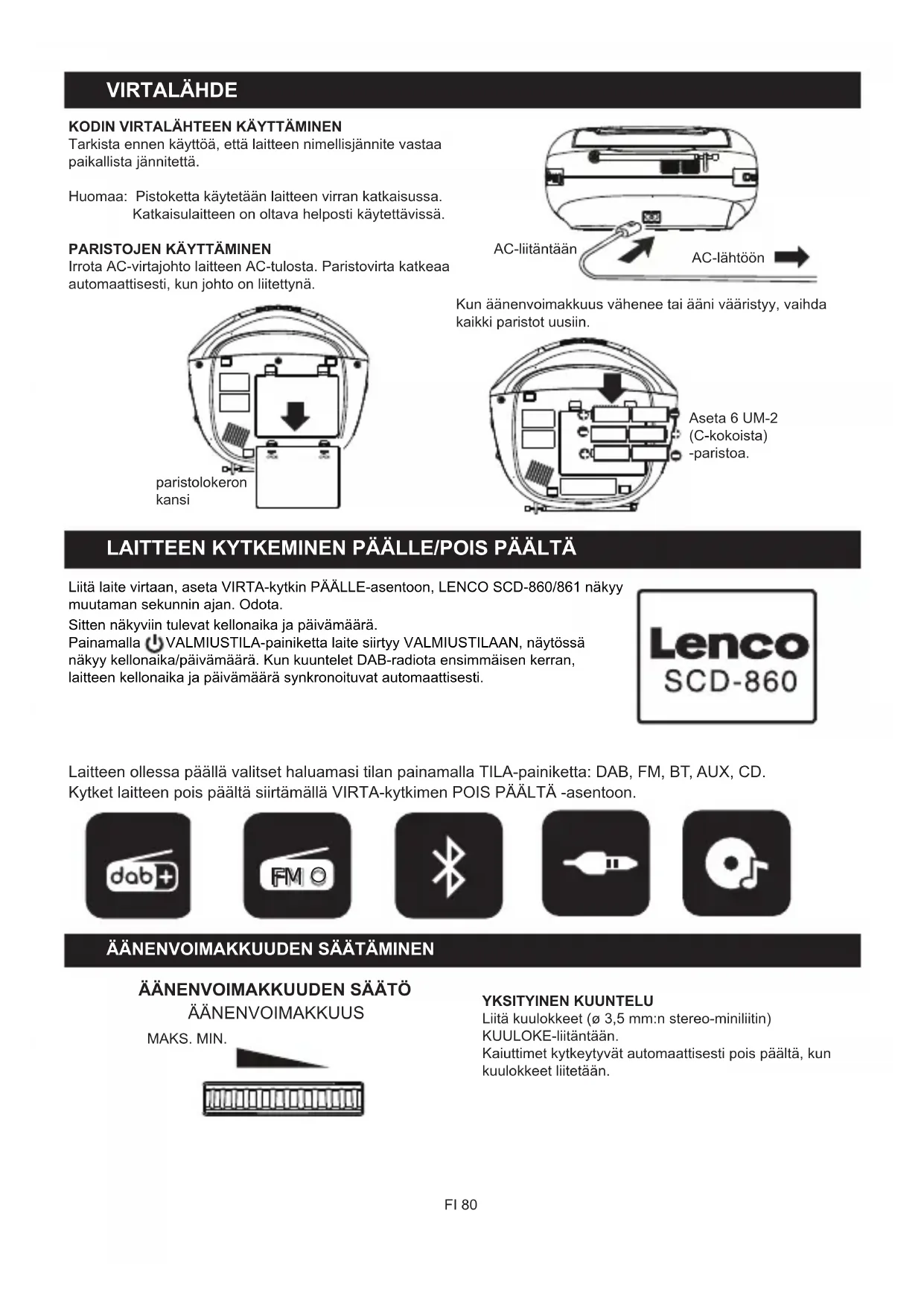 VIRTALÄHDE KODIN VIRTALÄHTEEN KÄYTTÄMINENTarkista ennen käyttöä, että laitteen nimellisjännite vastaa paikallista jännitettä.Huomaa: Pistoketta käytetään laitteen virran katkaisussa. Katkaisulaitteen on oltava helposti käytettävissä.PARISTOJEN KÄYTTÄMINENIrrota AC-virtajohto laitteen AC-tulosta. Paristovirta katkeaa automaattisesti, kun johto on liitettynä.AC-liitäntäänAC-lähtöönparistolokeron kansiKun äänenvoimakkuus vähenee tai ääni vääristyy, vaihda kaikki paristot uusiin.Aseta 6 UM-2 (C-kokoista) -paristoa. LAITTEEN KYTKEMINEN PÄÄLLE/POIS PÄÄLTÄ Liitä laite virtaan, aseta VIRTA-kytkin PÄÄLLE-asentoon, LENCO SCD-860/861 näkyy muutaman sekunnin ajan. Odota.Sitten näkyviin tulevat kellonaika ja päivämäärä.Painamalla VALMIUSTILA-painiketta laite siirtyy VALMIUSTILAAN, näytössä näkyy kellonaika/päivämäärä. Kun kuuntelet DAB-radiota ensimmäisen kerran, laitteen kellonaika ja päivämäärä synkronoituvat automaattisesti. Laitteen ollessa päällä valitset haluamasi tilan painamalla TILA-painiketta: DAB, FM, BT, AUX, CD. Kytket laitteen pois päältä siirtämällä VIRTA-kytkimen POIS PÄÄLTÄ -asentoon.