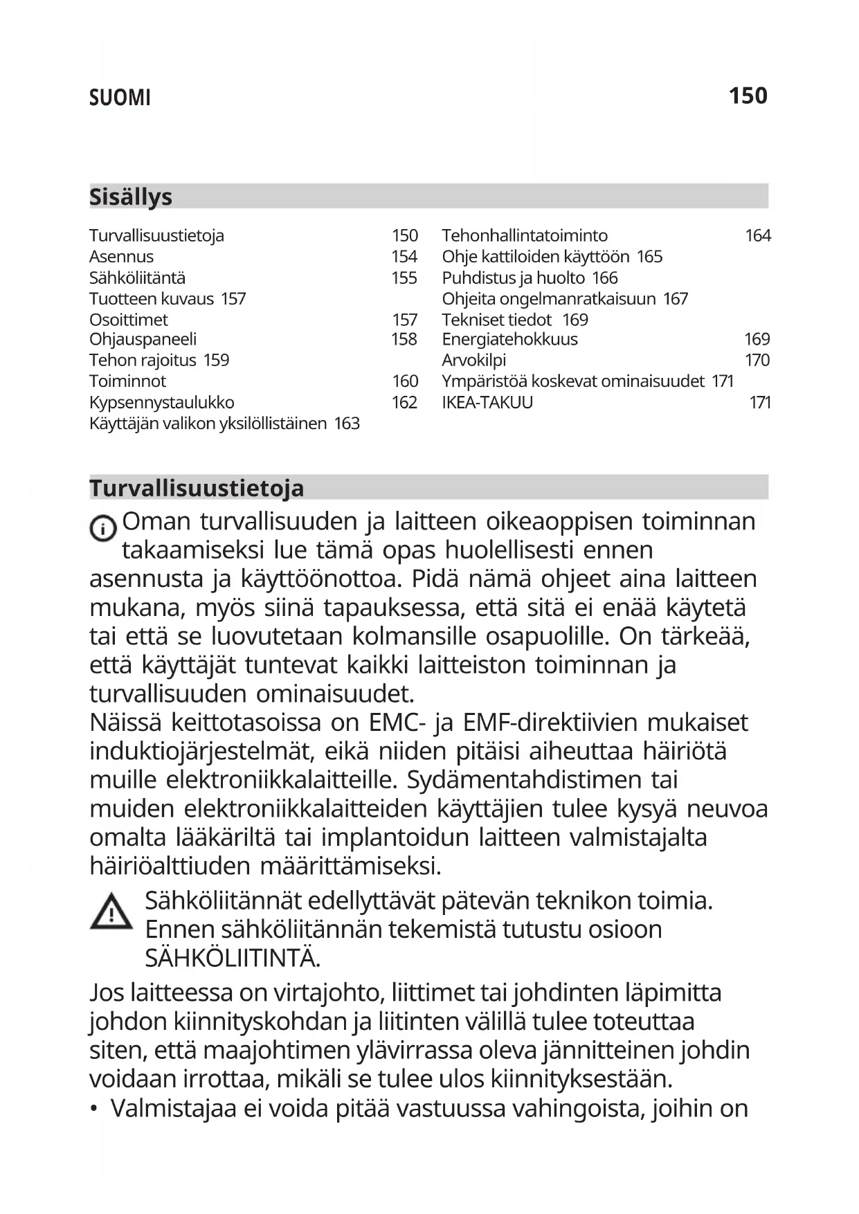 - Valmistajaa ei voida pitää vastuussa vahingoista, joihin on Turvallisuustietoja 150 Asennus 154 Sähköliitäntä 155 Tuotteen kuvaus 157 Osoittimet 157 Ohjauspaneeli 158 Tehon rajoitus 159 Toiminnot 160 Kypsennystaulukko 162 Käyttäjän valikon yksilöllistäinen 163 Tehonhallintatoiminto 164 Ohje kattiloiden käyttöön 165 Puhdistus ja huolto 166 Ohjeita ongelmanratkaisuun 167 Tekniset tiedot 169 Energiatehokkuus 169 Arvokilpi 170 Ympäristöä koskevat ominaisuudet 171 IKEA-TAKUU 171151 SUOMI syynä virheellinen asennus tai käyttö.