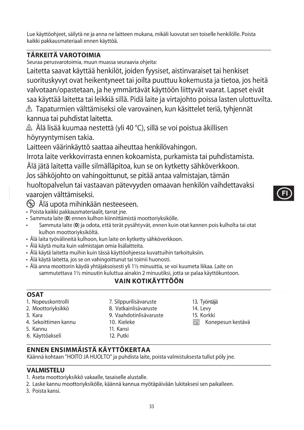 Seuraa perusvarotoimia, muun muassa seuraavia ohjeita: Laitetta saavat käyttää henkilöt, joiden fyysiset, aistinvaraiset tai henkiset suorituskyvyt ovat heikentyneet tai joilta puuttuu kokemusta ja tietoa, jos heitä valvotaan/opastetaan, ja he ymmärtävät käyttöön liittyvät vaarat. Lapset eivät saa käyttää laitetta tai leikkiä sillä. Pidä laite ja virtajohto poissa lasten ulottuvilta. c Tapaturmien välttämiseksi ole varovainen, kun käsittelet teriä, tyhjennät kannua tai puhdistat laitetta. h Älä lisää kuumaa nestettä (yli 40 °C), sillä se voi poistua äkillisen höyryyntymisen takia. Laitteen väärinkäyttö saattaa aiheuttaa henkilövahingon. Irrota laite verkkovirrasta ennen kokoamista, purkamista tai puhdistamista. Älä jätä laitetta vaille silmälläpitoa, kun se on kytketty sähköverkkoon. Jos sähköjohto on vahingoittunut, se pitää antaa valmistajan, tämän huoltopalvelun tai vastaavan pätevyyden omaavan henkilön vaihdettavaksi vaarojen välttämiseksi.