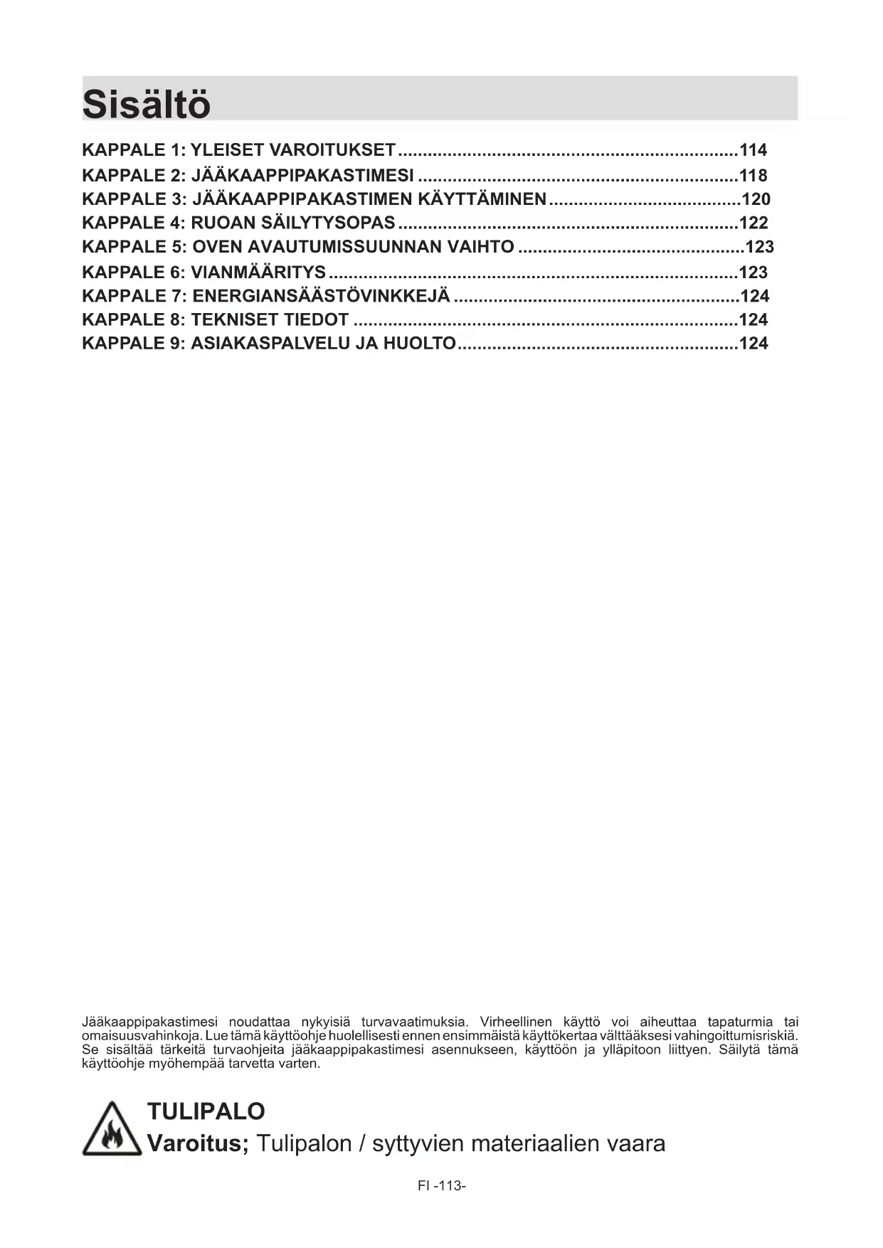 Jääkaappipakastimesi noudattaa nykyisiä turvavaatimuksia. Virheellinen käyttö voi aiheuttaa tapaturmia tai omaisuusvahinkoja. Lue tämä käyttöohje huolellisesti ennen ensimmäistä käyttökertaa välttääksesi vahingoittumisriskiä. Se sisältää tärkeitä turvaohjeita jääkaappipakastimesi asennukseen, käyttöön ja ylläpitoon liittyen. Säilytä tämä käyttöohje myöhempää tarvetta varten. TULIPALO Varoitus; Tulipalon / syttyvien materiaalien vaaraFI -114-