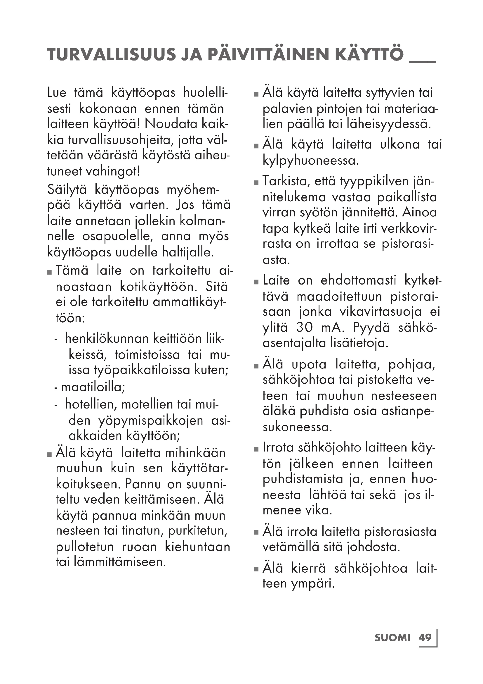 Älä käytä laitetta kosteilla tai märillä käsillä. TURVALLISUUS JA PÄIVITTÄINEN KÄYTTÖ ___51 SUOMI