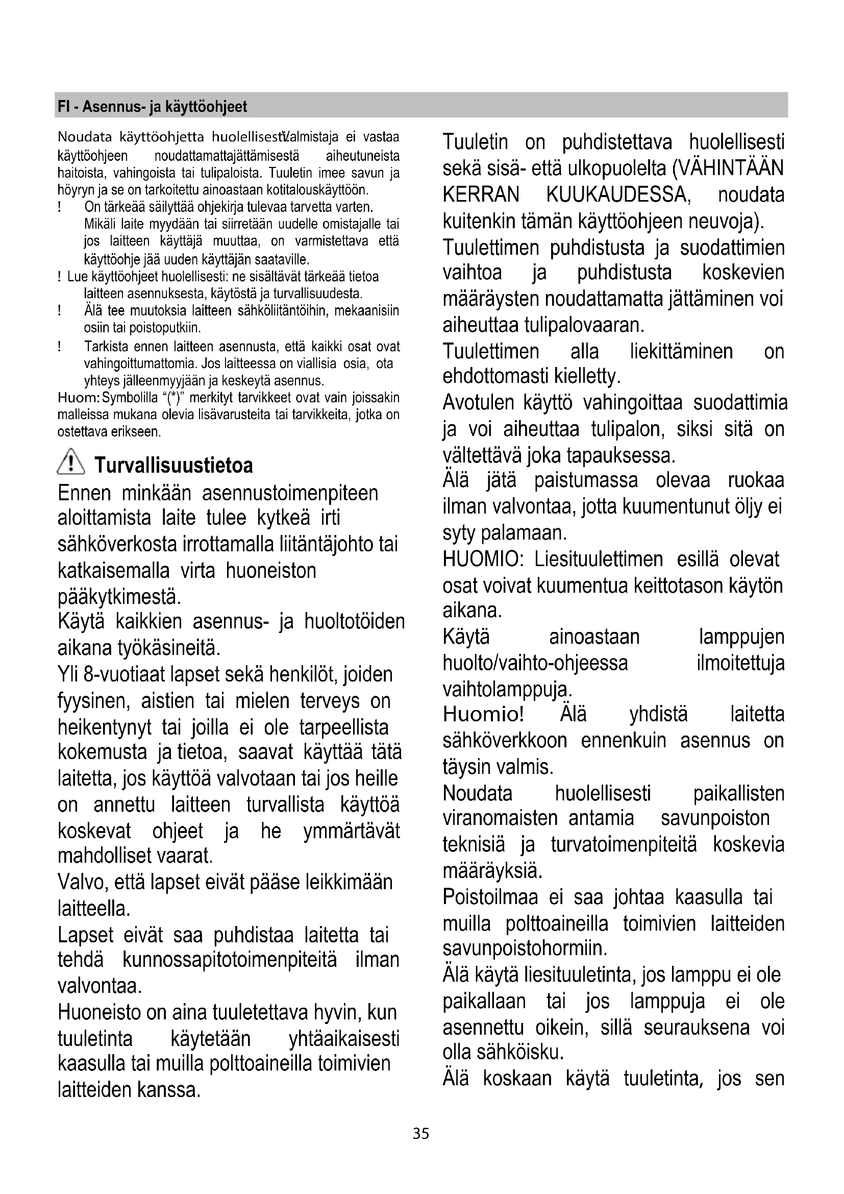Funksjon Viften er utstyrt med et kontrollpanel med viftehastighetsvalg og en lysbryter for å kontrollere kokeområdets lys. Bruk største hastighet ved høy dampkonsentrasjon på kjøkkenet. Vi anbefaler å slå på viften 5 minutter før du begynner å lage mat, og la den fortsette å virke i enda cirka 15 minutter etter du er ferdig med matlagingen. Vedlikehold Rengjøring Til rengjøring skal det KUN benyttes en klut fuktet med et nøytralt rengjøringsmiddel. VERKTØY ELLER APPARATER SKAL IKKE BRUKES TIL RENGJØRING! Unngå bruk av slipende eller etsende produkter. ALKOHOL SKAL IKKE BRUKES! Fettfilteret Fanger kokefettpartikler. Fettfilteret må rengjøres en gang i måneden uten bruk av aggressive rengjøringsmidler, for hånd eller i oppvaskmaskin ved lav temperatur og med kort syklus. Ved vask i oppvaskmaskin kan fettfilteret i metall miste fargen, men dets filterkarakteristikker endres absolutt ikke. For å demontere fettfilteret må man dra i fjærhåndtaket. Fig. 1 Kullfilter (kun med resirkulering av luften) Fig. 2 Holder tilbake ubehagelige lukter fra matlaging. Kulllteret må skiftes ut hver 4. måned ved middels bruk av ventilatoren, og oftere hvis ventilatoren brukes mye. Det kan IKKE vaskes eller benyttes om igjen Ta vekk fettfiltrene. Monter filtrene så de dekker motoren. Kontroller at boltene R på filtergitteret korrisponderer med hullene S, vri så etter klokken helt til gitteret er blokkert. Gå frem i motsatt rekkefølge for å demontere filtrene. Sett på plass fettfiltrene. Utskifting av lyspærer Fig. 1 Koble ventilatoren fra strømnettet. Merk! Forsikre deg om at lyspæren er kald før du tar i den. Skift ut den utbrente lyspæren med en av samme type, som spesifisert på typeskiltet eller i nærheten av selve lyspæren på kjøkkenhetten. For å få tilgang til lamperommet må man ta vekk dekselet A. Dersom belysningen ikke skulle virke, kontroller at lyspærene er satt korrekt på plass før du henvender deg til teknisk assistanse.35 FI - Asennus- ja käyttöohjeet Noudata käyttöohjetta huolellisesti. Valmistaja ei vastaa käyttöohjeen noudattamattajättämisestä aiheutuneista haitoista, vahingoista tai tulipaloista. Tuuletin imee savun ja höyryn ja se on tarkoitettu ainoastaan kotitalouskäyttöön. ! On tärkeää säilyttää ohjekirja tulevaa tarvetta varten. Mikäli laite myydään tai siirretään uudelle omistajalle tai jos laitteen käyttäjä muuttaa, on varmistettava että käyttöohje jää uuden käyttäjän saataville. ! Lue käyttöohjeet huolellisesti: ne sisältävät tärkeää tietoa laitteen asennuksesta, käytöstä ja turvallisuudesta. ! Älä tee muutoksia laitteen sähköliitäntöihin, mekaanisiin osiin tai poistoputkiin. ! Tarkista ennen laitteen asennusta, että kaikki osat ovat vahingoittumattomia. Jos laitteessa on viallisia osia, ota yhteys jälleenmyyjään ja keskeytä asennus. Huom: Symbolilla “(*)” merkityt tarvikkeet ovat vain joissakin malleissa mukana olevia lisävarusteita tai tarvikkeita, jotka on ostettava erikseen. Turvallisuustietoa Ennen minkään asennustoimenpiteen aloittamista laite tulee kytkeä irti sähköverkosta irrottamalla liitäntäjohto tai katkaisemalla virta huoneiston pääkytkimestä. Käytä kaikkien asennus- ja huoltotöiden aikana työkäsineitä. Yli 8-vuotiaat lapset sekä henkilöt, joiden fyysinen, aistien tai mielen terveys on heikentynyt tai joilla ei ole tarpeellista kokemusta ja tietoa, saavat käyttää tätä laitetta, jos käyttöä valvotaan tai jos heille on annettu laitteen turvallista käyttöä koskevat ohjeet ja he ymmärtävät mahdolliset vaarat. Valvo, että lapset eivät pääse leikkimään laitteella. Lapset eivät saa puhdistaa laitetta tai tehdä kunnossapitotoimenpiteitä ilman valvontaa. Huoneisto on aina tuuletettava hyvin, kun tuuletinta käytetään yhtäaikaisesti kaasulla tai muilla polttoaineilla toimivien laitteiden kanssa. Tuuletin on puhdistettava huolellisesti sekä sisä- että ulkopuolelta (VÄHINTÄÄN KERRAN KUUKAUDESSA, noudata kuitenkin tämän käyttöohjeen neuvoja). Tuulettimen puhdistusta ja suodattimien vaihtoa ja puhdistusta koskevien määräysten noudattamatta jättäminen voi aiheuttaa tulipalovaaran. Tuulettimen alla liekittäminen on ehdottomasti kielletty. Avotulen käyttö vahingoittaa suodattimia ja voi aiheuttaa tulipalon, siksi sitä on vältettävä joka tapauksessa. Älä jätä paistumassa olevaa ruokaa ilman valvontaa, jotta kuumentunut öljy ei syty palamaan. HUOMIO: Liesituulettimen esillä olevat osat voivat kuumentua keittotason käytön aikana. Käytä ainoastaan lamppujen huolto/vaihto-ohjeessa ilmoitettuja vaihtolamppuja. Huomio! Älä yhdistä laitetta sähköverkkoon ennenkuin asennus