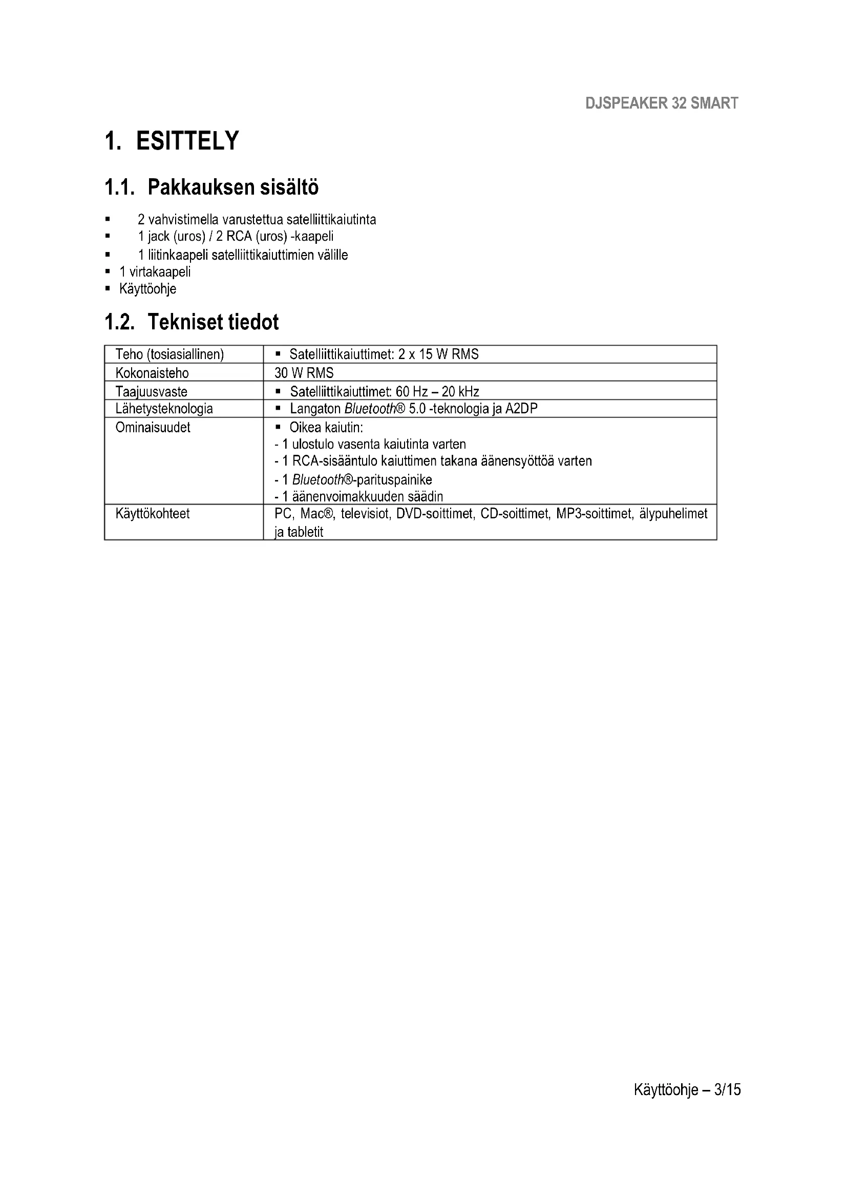 1.1. Pakkauksen sisältö 2 vahvistimella varustettua satelliittikaiutinta 1 jack (uros) / 2 RCA (uros) -kaapeli 1 liitinkaapeli satelliittikaiuttimien välille 1 virtakaapeli Käyttöohje 1.2. Tekniset tiedot Teho (tosiasiallinen) Satelliittikaiuttimet: 2 x 15 W RMS Kokonaisteho 30 W RMS Taajuusvaste Satelliittikaiuttimet: 60 Hz – 20 kHz Lähetysteknologia Langaton Bluetooth® 5.0 -teknologia ja A2DP Ominaisuudet Oikea kaiutin: - 1 ulostulo vasenta kaiutinta varten - 1 RCA-sisääntulo kaiuttimen takana äänensyöttöä varten - 1 Bluetooth®-parituspainike - 1 äänenvoimakkuuden säädin Käyttökohteet PC, Mac®, televisiot, DVD-soittimet, CD-soittimet, MP3-soittimet, älypuhelimet ja tabletitDJSPEAKER 32 SMART 4/15 – Käyttöohje 1.3. Suositukset - Aseta satelliittikaiuttimet tasaiselle pinnalle estääksesi niitä putoamasta. - Älä ikinä avaa kaiutinsettiä, sillä voit vahingoittaa sen sisäisiä komponentteja. - Tämä kaiutinsetti on tarkoitettu lauhkeaan ympäristöön. - Välttääksesi tulen tai sähköiskun riskiä pidä kaiutinsetti erossa: - sateesta tai kosteista paikoista, mukaan lukien nesteistä (vesi, kemialliset tuotteet tai muut nesteet) - lämmön lähteistä, kuten lämmityslaitteista, liesistä tai muista lämpöä tuottavista laitteista (mukaan lukien vahvistimet) - suorasta auringonvalosta. - Älä altista kaiutinsettiä vesipisaroille tai räiskeille. - Älä ikinä aseta nestettä sisältäviä astioita (lasi, maljakko...) kaiutinsetin päälle. - Irrota virtakaapeli, jos et aio käyttää kaiutinsettiä pitempään aikaan. Irrota virtakaapeli tarttumalla liittimeen ja vetämällä siitä, älä koskaan vedä johdosta. - Varmista, että kaiutinsetin pistokkeeseen liitetty virtajohto on helposti saatavilla. - Irrota kaiutinsetti ennen puhdistamista. Käytä kosteaa kangasta ja vältä käyttämästä aerosolilla täytettyjä puhdistimia. - Kaiutinsetistä poistetaan virta virtajohdolla, joten sen täytyy olla aina helposti saatavilla. - Merkinnät sijaitsevat kaiuttimien takana.