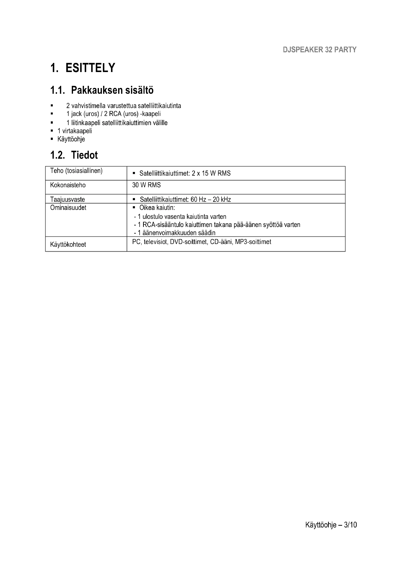 1.1. Pakkauksen sisältö 2 vahvistimella varustettua satelliittikaiutinta 1 jack (uros) / 2 RCA (uros) -kaapeli 1 liitinkaapeli satelliittikaiuttimien välille 1 virtakaapeli Käyttöohje 1.2. Tiedot Teho (tosiasiallinen) Satelliittikaiuttimet: 2 x 15 W RMS Kokonaisteho 30 W RMS Taajuusvaste Satelliittikaiuttimet: 60 Hz – 20 kHz Ominaisuudet Oikea kaiutin: - 1 ulostulo vasenta kaiutinta varten - 1 RCA-sisääntulo kaiuttimen takana pää-äänen syöttöä varten - 1 äänenvoimakkuuden säädin Käyttökohteet PC, televisiot, DVD-soittimet, CD-ääni, MP3-soittimetDJSPEAKER 32 PARTY 4/10 – Käyttöohje 1.3. Suositukset - Aseta satelliittikaiuttimet tasaiselle pinnalle estääksesi niitä putoamasta. - Älä ikinä avaa kaiutinsettiä, sillä voit vahingoittaa sen sisäisiä komponentteja. - Tämä kaiutinsetti on tarkoitettu lauhkeaan ympäristöön. - Välttääksesi tulen tai sähköiskun riskiä pidä kaiutinsetti erossa: - sateesta tai kosteista paikoista, mukaan lukien nesteistä (vesi, kemialliset tuotteet tai muut nesteet), - lämmön lähteistä, kuten lämmityslaitteista, liesistä tai muista lämpöä tuottavista laitteista (mukaan lukien vahvistimet), - suorasta auringonvalosta. - Älä altista kaiutinsettiä vesipisaroille tai räiskeille. - Älä ikinä aseta nestettä sisältäviä astioita (lasi, maljakko...) kaiutinsetin päälle. - Irrota virtakaapeli, jos et aio käyttää kaiutinsettiä pitempään aikaan. Irrota virtakaapeli tarttumalla liittimeen ja vetämällä siitä, älä koskaan vedä johdosta. - Varmista, että kaiutinsetin pistokkeeseen liitetty virtajohto on helposti saatavilla. - Irrota kaiutinsetti ennen puhdistamista. Käytä kosteaa kangasta ja vältä käyttämästä aerosolilla täytettyjä puhdistimia. - Kaiutinsetin virtajohdolla laitteesta poistetaan virta, joten sen täytyy olla aina helposti saatavilla. - Merkinnät sijaitsevat kaiuttimien takana.