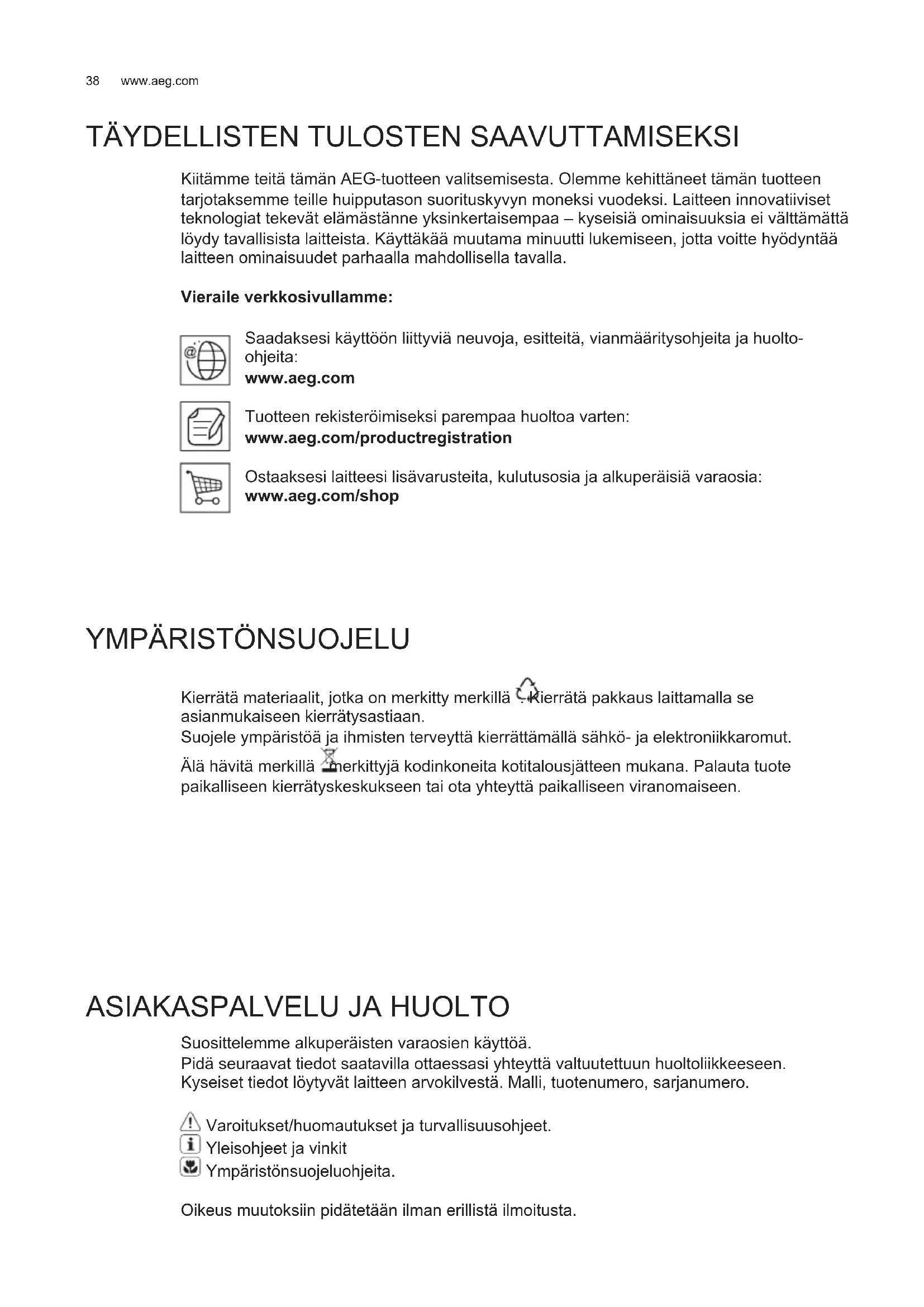 Kiitämme teitä tämän AEG-tuotteen valitsemisesta. Olemme kehittäneet tämän tuotteen tarjotaksemme teille huipputason suorituskyvyn moneksi vuodeksi. Laitteen innovatiiviset teknologiat tekevät elämästänne yksinkertaisempaa – kyseisiä ominaisuuksia ei välttämättä löydy tavallisista laitteista. Käyttäkää muutama minuutti lukemiseen, jotta voitte hyödyntää laitteen ominaisuudet parhaalla mahdollisella tavalla. Vieraile verkkosivullamme: Saadaksesi käyttöön liittyviä neuvoja, esitteitä, vianmääritysohjeita ja huolto- ohjeita: www.aeg.com Tuotteen rekisteröimiseksi parempaa huoltoa varten: www.aeg.com/productregistration Ostaaksesi laitteesi lisävarusteita, kulutusosia ja alkuperäisiä varaosia: www.aeg.com/shop