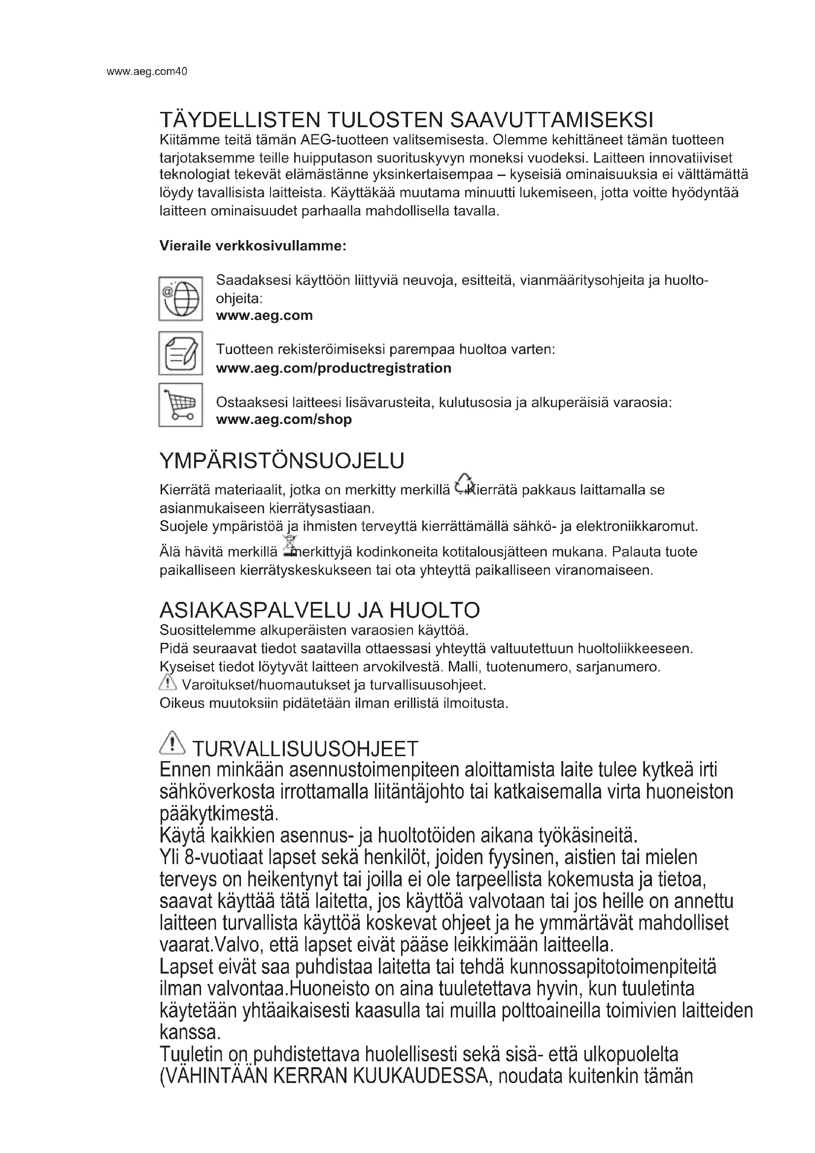 Kiitämme teitä tämän AEG-tuotteen valitsemisesta. Olemme kehittäneet tämän tuotteen tarjotaksemme teille huipputason suorituskyvyn moneksi vuodeksi. Laitteen innovatiiviset teknologiat tekevät elämästänne yksinkertaisempaa – kyseisiä ominaisuuksia ei välttämättä löydy tavallisista laitteista. Käyttäkää muutama minuutti lukemiseen, jotta voitte hyödyntää laitteen ominaisuudet parhaalla mahdollisella tavalla. Vieraile verkkosivullamme: Saadaksesi käyttöön liittyviä neuvoja, esitteitä, vianmääritysohjeita ja huolto- ohjeita: www.aeg.com Tuotteen rekisteröimiseksi parempaa huoltoa varten: www.aeg.com/productregistration Ostaaksesi laitteesi lisävarusteita, kulutusosia ja alkuperäisiä varaosia: www.aeg.com/shop