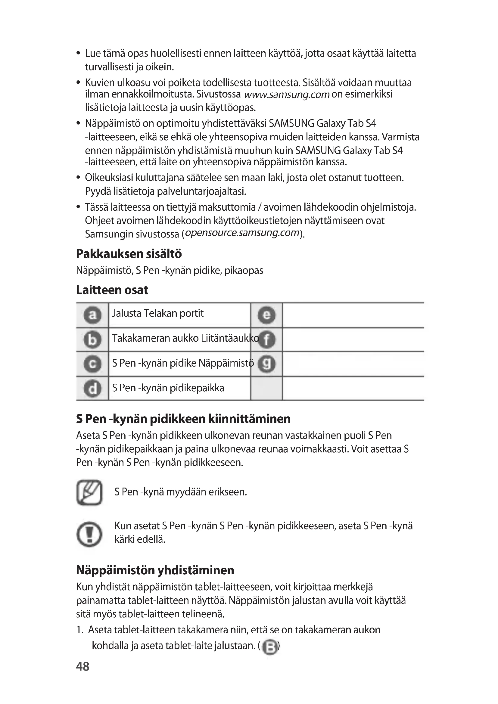 Näppäimistö on optimoitu yhdistettäväksi SAMSUNG Galaxy Tab S4 -laitteeseen, eikä se ehkä ole yhteensopiva muiden laitteiden kanssa. Varmista ennen näppäimistön yhdistämistä muuhun kuin SAMSUNG Galaxy Tab S4 -laitteeseen, että laite on yhteensopiva näppäimistön kanssa.