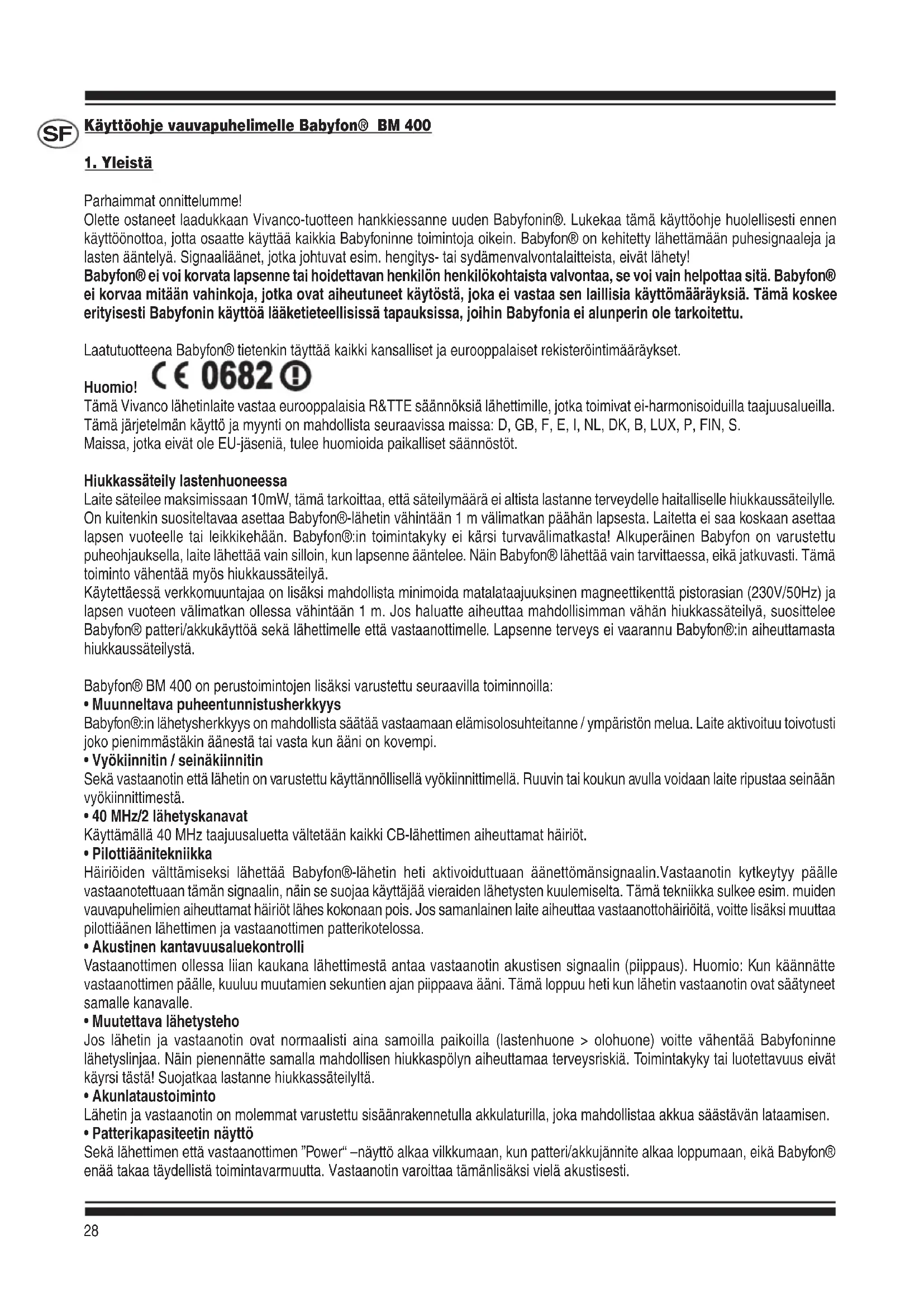 Parhaimmat onnittelumme! Olette ostaneet laadukkaan Vivanco-tuotteen hankkiessanne uuden Babyfonin®. Lukekaa tämä käyttöohje huolellisesti ennen käyttöönottoa, jotta osaatte käyttää kaikkia Babyfoninne toimintoja oikein. Babyfon® on kehitetty lähettämään puhesignaaleja ja lasten ääntelyä. Signaaliäänet, jotka johtuvat esim. hengitys- tai sydämenvalvontalaitteista, eivät lähety! Babyfon® ei voi korvata lapsenne tai hoidettavan henkilön henkilökohtaista valvontaa, se voi vain helpottaa sitä. Babyfon® ei korvaa mitään vahinkoja, jotka ovat aiheutuneet käytöstä, joka ei vastaa sen laillisia käyttömääräyksiä. Tämä koskee erityisesti Babyfonin käyttöä lääketieteellisissä tapauksissa, joihin Babyfonia ei alunperin ole tarkoitettu. Laatutuotteena Babyfon® tietenkin täyttää kaikki kansalliset ja eurooppalaiset rekisteröintimääräykset. Huomio! Tämä Vivanco lähetinlaite vastaa eurooppalaisia R&TTE säännöksiä lähettimille, jotka toimivat ei-harmonisoiduilla taajuusalueilla. Tämä järjetelmän käyttö ja myynti on mahdollista seuraavissa maissa: D, GB, F, E, I, NL, DK, B, LUX, P, FIN, S. Maissa, jotka eivät ole EU-jäseniä, tulee huomioida paikalliset säännöstöt. Hiukkassäteily lastenhuoneessa Laite säteilee maksimissaan 10mW, tämä tarkoittaa, että säteilymäärä ei altista lastanne terveydelle haitalliselle hiukkaussäteilylle. On kuitenkin suositeltavaa asettaa Babyfon®-lähetin vähintään 1 m välimatkan päähän lapsesta. Laitetta ei saa koskaan asettaa lapsen vuoteelle tai leikkikehään. Babyfon®:in toimintakyky ei kärsi turvavälimatkasta! Alkuperäinen Babyfon on varustettu puheohjauksella, laite lähettää vain silloin, kun lapsenne ääntelee. Näin Babyfon® lähettää vain tarvittaessa, eikä jatkuvasti. Tämä toiminto vähentää myös hiukkaussäteilyä. Käytettäessä verkkomuuntajaa on lisäksi mahdollista minimoida matalataajuuksinen magneettikenttä pistorasian (230V/50Hz) ja lapsen vuoteen välimatkan ollessa vähintään 1 m. Jos haluatte aiheuttaa mahdollisimman vähän hiukkassäteilyä, suosittelee Babyfon® patteri/akkukäyttöä sekä lähettimelle että vastaanottimelle. Lapsenne terveys ei vaarannu Babyfon®:in aiheuttamasta hiukkaussäteilystä. Babyfon® BM 400 on perustoimintojen lisäksi varustettu seuraavilla toiminnoilla: