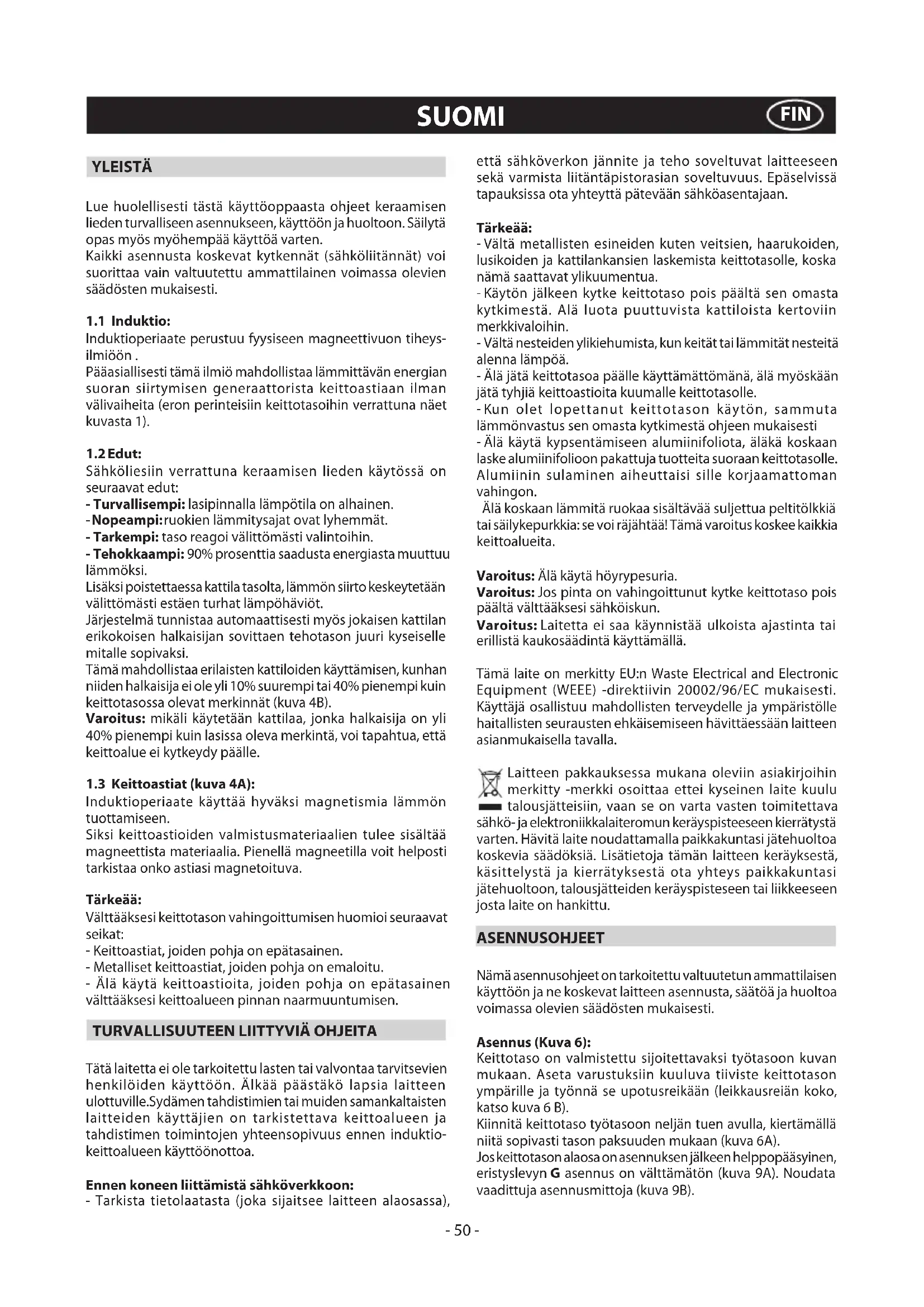 Sähköliesiin verrattuna keraamisen lieden käytössä on seuraavat edut: -Turvallisempi:lasipinnalla lämpötila on alhainen. - Nopeampi: ruokien lämmitysajat ovat lyhemmät. -Tarkempi:taso reagoi välittömästi valintoihin. -Tehokkaampi:90% prosenttia saadusta energiasta muuttuu lämmöksi. Lisäksi poistettaessa kattila tasolta, lämmön siirto keskeytetään välittömästi estäen turhat lämpöhäviöt. Järjestelmä tunnistaa automaattisesti myös jokaisen kattilan erikokoisen halkaisijan sovittaen tehotason juuri kyseiselle mitalle sopivaksi. Tämä mahdollistaa erilaisten kattiloiden käyttämisen, kunhan niiden halkaisija ei ole yli 10% suurempi tai 40% pienempi kuin keittotasossa olevat merkinnät (kuva 4B). Varoitus: mikäli käytetään kattilaa, jonka halkaisija on yli 40% pienempi kuin lasissa oleva merkintä, voi tapahtua, että keittoalue ei kytkeydy päälle. 1.3Keittoastiat(kuva4A): Induktioperiaate käyttää hyväksi magnetismia lämmön tuottamiseen. Siksi keittoastioiden valmistusmateriaalien tulee sisältää magneettista materiaalia. Pienellä magneetilla voit helposti tarkistaa onko astiasi magnetoituva. Tärkeää: Välttääksesi keittotason vahingoittumisen huomioi seuraavat seikat: - Keittoastiat, joiden pohja on epätasainen. - Metalliset keittoastiat, joiden pohja on emaloitu. - Älä käytä keittoastioita, joiden pohja on epätasainen välttääksesi keittoalueen pinnan naarmuuntumisen.