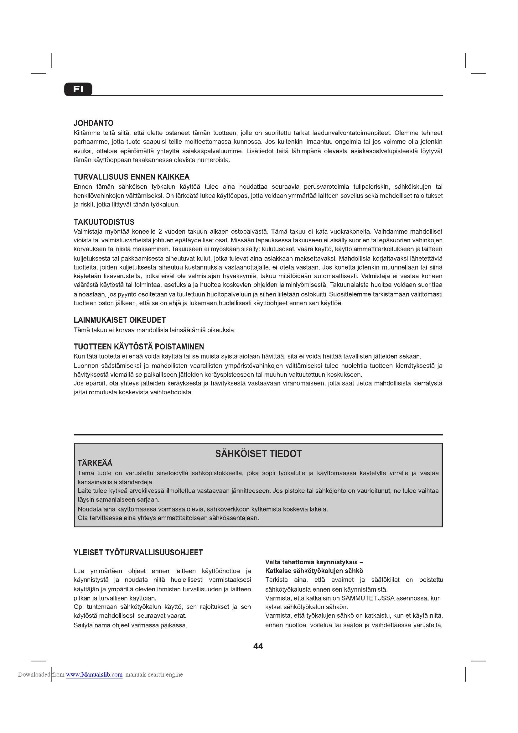 Ennen tämän sähköisen työkalun käyttöä tulee aina noudattaa seuraavia perusvarotoimia tulipaloriskin, sähköiskujen tai henkilövahinkojenvälttämiseksi.Ontärkeätälukeakäyttöopas,jottavoidaanymmärtäälaitteensovellussekämahdollisetrajoitukset jariskit,jotkaliittyvättähäntyökaluun. TAKUUTODISTUS Valmistajamyöntää koneelle 2vuodentakuun alkaenostopäivästä.Tämätakuuei katavuokrakoneita.Vaihdamme mahdolliset vioistataivalmistusvirheistäjohtuenepätäydellisetosat.Missääntapauksessatakuuseeneisisällysuorientaiepäsuorienvahinkojen korvauksentainiistämaksaminen.Takuuseeneimyöskäänsisälly:kulutusosat,vääräkäyttö,käyttöammattitarkoitukseenjalaitteen kuljetuksestataipakkaamisestaaiheutuvatkulut,jotkatulevatainaasiakkaanmaksettavaksi.Mahdollisiakorjattavaksilähetettäviä tuotteita,joidenkuljetuksestaaiheutuukustannuksiavastaanottajalle,eiotetavastaan.Joskonettajotenkinmuunnellaantaisiinä käytetäänlisävarusteita, jotkaeivätole valmistajan hyväksymiä,takuu mitätöidään automaattisesti.Valmistaja ei vastaakoneen väärästäkäytöstätaitoimintaa,asetuksiajahuoltoakoskevienohjeidenlaiminlyömisestä.Takuunalaistahuoltoavoidaansuorittaa ainoastaan,jospyyntöosoitetaanvaltuutettuunhuoltopalveluunjasiihenliitetäänostokuitti.Suosittelemmetarkistamaanvälittömästi tuotteenostonjälkeen,ettäseonehjäjalukemaanhuolellisestikäyttöohjeetennensenkäyttöä. LAINMUKAISET OIKEUDET Tämätakuueikorvaamahdollisialainsäätämiäoikeuksia.