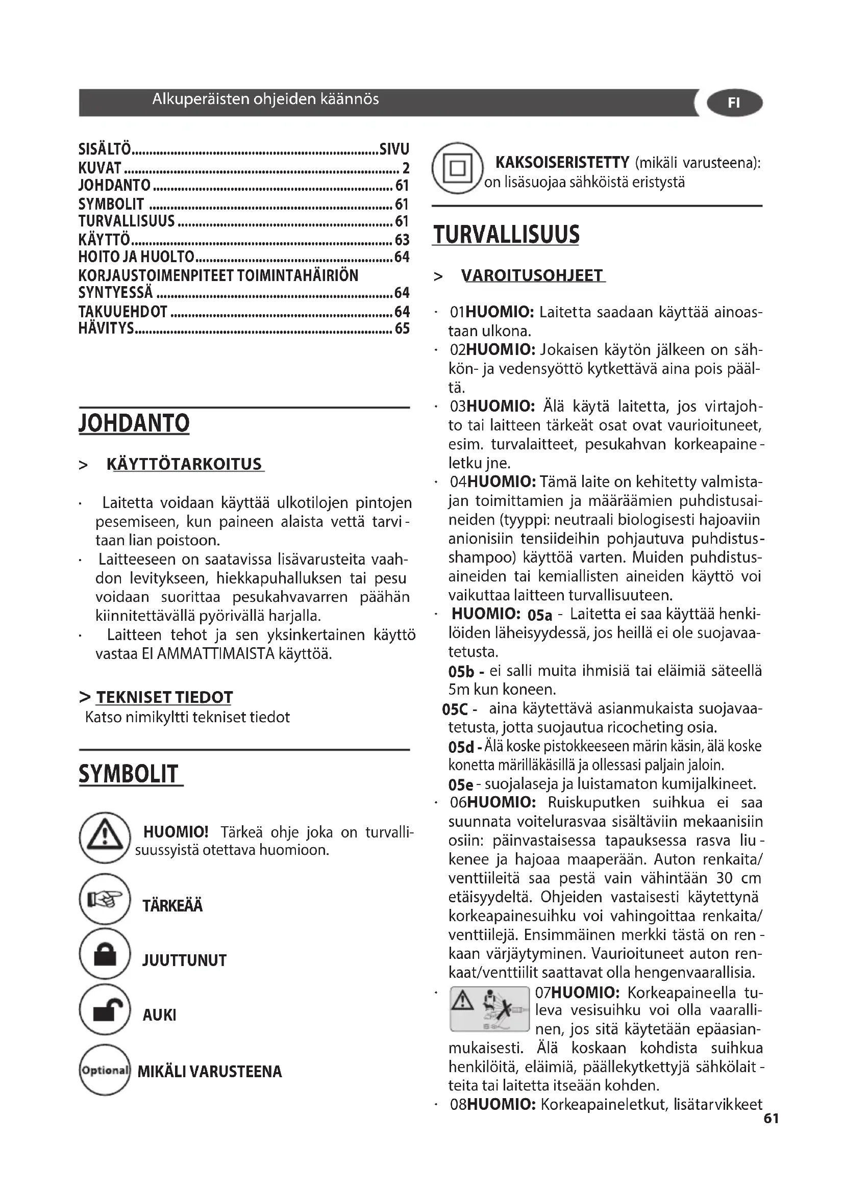 03HUOMIO: Älä käytä laitetta, jos virtajoh- to tai laitteen tärkeät osat ovat vaurioituneet, esim. turvalaitteet, pesukahvan korkeapaine
