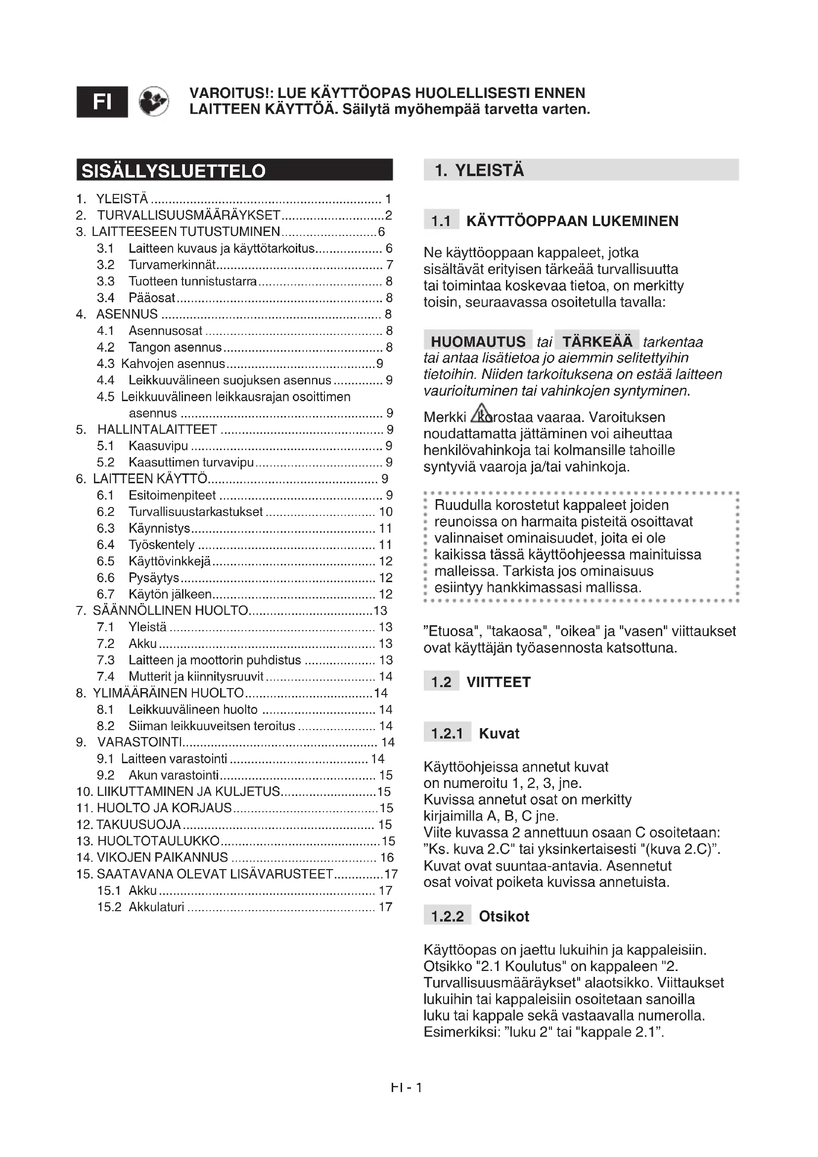 Käyttöopas on jaettu lukuihin ja kappaleisiin. Otsikko "2.1 Koulutus" on kappaleen "2. Turvallisuusmääräykset" alaotsikko. Viittaukset lukuihin tai kappaleisiin osoitetaan sanoilla luku tai kappale sekä vastaavalla numerolla. Esimerkiksi: ”luku 2" tai "kappale 2.1”. SISÄLLYSLUETTELO