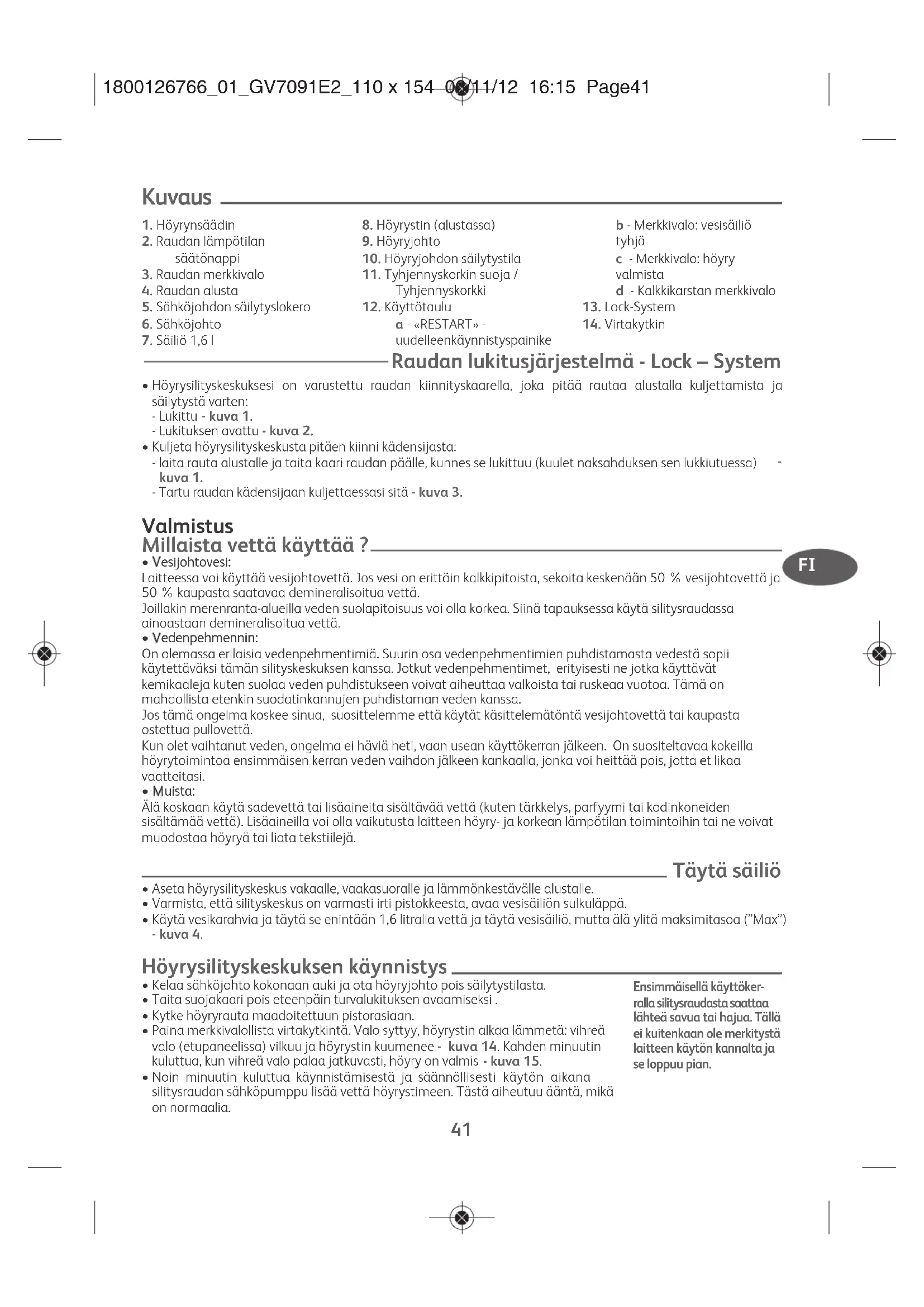 Höyrysilityskeskus ei käynnisty tai silitysraudan merkkivalo ja käyttövalitsimen merkkivalo eivät pala. Laitteeseen ei ole kytketty virtaa. Tarkista, että virtajohto on kunnolla kytketty pistorasiaan ja paina merkkivalollista virran- katkaisijaa (sijaitsee alustan sivulla). Pohjan rei’istä vuotaa vettä. Käytät höyryä, vaikka silitysrauta ei ole tar- peeksi kuuma. Vettä on tiivistynyt putkiin, koska höyryä käytetään ensimmäistä kertaa tai viimei- sestä käyttökerrasta on kulunut kauan. Tarkasta termostaatin säätö ja höyryn vir- taus. Odota, että raudan merkkivalo sam- muu, ennen kuin käytät höyrynsäädintä. Paina höyrypainiketta poissa silityslaudan lä- heisyydestä, kunnes raudasta tulee höyryä. Vesijälkiä ilmestyy kankaisiin. Silityslaudan päällys vettynyt, koska se ei sovi käytettäväksi höyrysilityskeskuksen kanssa. Tarkista, että lauta on tarkoitukseen sopiva (ritilälauta, joka estää kondensaation). Silitysraudan pohjan rei’istä valuu vaaleaa nestettä. Höyrystimestä irtoaa kalkkikarstaa, sillä sitä ei ole huuhdeltu säännöllisesti. Huuhtele höyrysäiliö ( katso § “kalkinpoisto höyrygeneraattorista”). Silitysraudan pohjan rei’istä vuotaa ruskeaa nestettä, joka likaa silitettävän vaatteen. Olet käyttänyt kemiallista kalkinpoistoai- netta tai lisäaineita säiliön vedessä. Älä lisää mitään aineita vesisäiliöön (katso suosituksia käytettävästä vedestä). Ota yh- teys valtuutettuun huoltokeskukseen. Silitysraudan pohja on likai- nen tai ruskea ja likaa silitettä- vän vaatteen. Raudan lämpötila on liian korkea. Pyykkiä ei ole huuhdeltu riittävän hyvin tai olet silittänyt uusia vaatteita ennen pese- mistä. Käytät tärkkiä. Säädä raudan lämpötila ohjeiden mukaisesti. Varmista että pyykki on kunnolla huuhdeltu, jotta pesuaineen jäämät tai muut kemikaalit eivät pala kiinni uuteen vaatteeseen. Sirottele tärkki silitettävän vaatteen nurjalle puolelle. Höyryä tulee vähän tai ei ol- lenkaan. Punainen “vesisäiliö”-merkkivalo vilkkuu. Pohjan lämpö on asetettu maksimiin. Täytä vesisäiliö ja paina ”RESTART” -paini- ketta, kunnes merkkivalo sammuu. Höyrytys toimii, mutta höyry on niin kuumaa, että se näkyy huonommin. Korkin ympäriltä tulee höyryä. Pohjatulppa on huonosti kiinni. Korkin tiiviste on vahingoittunut. Laite on viallinen. Kiristä pohjatulppa. Ota yhteyttä valtuutettuun huoltokeskuk- seen. Älä käytä rautaa enää ja ota yhteyttä valtuu- tettuun huoltokeskukseen. Punainen “tyhjä vesisäiliö” - merkkivalo vilkkuu. Et ole painanut ”RESTART” -painiketta. Paina ohjauspaneelissa olevaa “RESTART”- käynnistyspainiketta, kunnes merkkivalo sam- muu. Laitteen alta tulee höyryä tai vettä. Et ole painanut ”RESTART” -painiketta. Älä käytä höyrysilityskeskusta enää ja ota yh- teyttä valtuutettuun huoltokeskukseen. “Kalkinpoisto”-merkkivalo vilk- kuu. Et ole painanut uudelleenkäynnistysnäp- päintä (RESTART). Paina ohjauspaneelissa olevaa “RESTART”- käynnistyspainiketta, kunnes merkkivalo sam- muu. ONKO SINULLA ONGELMA HÖYRYSILITYSKESKUKSEN KANSSA? 1800126766_01_GV7091E2_110 x 154 06/11/12 16:15 Page44Ütünün tabanlık üzerine kilitlenme sistemi - Lock System !"#$%&'($")*"+*,-*%./,(*"01-$+-&2&"/3/'"456$,"7*'*,$.8,9'9:9'"0/-/.-*(*-/"1-$,$0"9.9'9'".$4$'&"9:*,/'*".$0&-($;& 6$-0$;&"45-5'($0.$<&,"= >"?/-/.-*(*"> şekil 1 >"@3($">"şekil 2 !"A56$,"7*'*,$.8,9'9:9"9.9'9'";$B&'<$'".5.$,$0".$%&($0"/3/'= >"C.9+9D"456$,"7*'*,$.8,9'9:9'"9.9".$4$'-&2&"9:*,/'*"+*,-*%./,/'")*"0/-/.-*'*'*"0$<$,"9.9+9".5.($"6$-0$;&'$ 4$;.&,&'"E4/,"FG0-/0GH";*;/"<5+5-5,I">" şekil 1. >"A56$,"7*'*,$.8,9'9:9".$%&($0"/3/'"9.9+9";$B&'<$'".5.5'">"şekil 3. HAZIRLAMA Hangi türde su kullanılmalıdır?