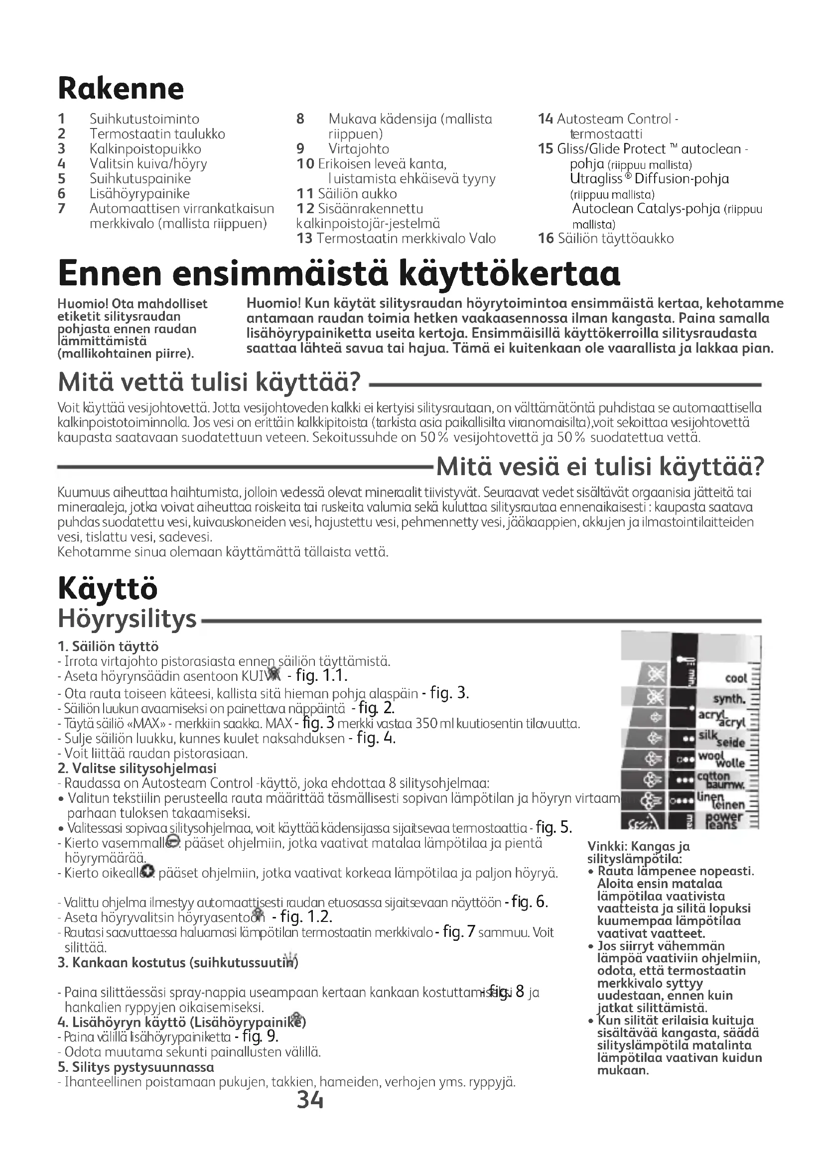 iffusion-pohja(riippuu mallista)Autoclean Catalys-pohja (riippuumallista)16 Säiliön täyttöaukko Ennen ensimmäistä käyttökertaa Huomio! Kun käytät silitysraudan höyrytoimintoa ensimmäistä kertaa, kehotammeantamaan raudan toimia hetken vaakaasennossa ilman kangasta. Paina samallalisähöyrypainiketta useita kertoja. Ensimmäisillä käyttökerroilla silitysraudastasaattaa lähteä savua tai hajua. Tämä ei kuitenkaan ole vaarallista ja lakkaa pian. Mitä vettä tulisi käyttää? Voit käyttää vesijohtovettä. Jotta vesijohtoveden kalkki ei kertyisi silitysrautaan, on välttämätöntä puhdistaa se automaattisella kalkinpoistotoiminnolla. Jos vesi on erittäin kalkkipitoista (tarkista asia paikallisilta viranomaisilta),voit sekoittaa vesijohtovettä kaupasta saatavaan suodatettuun veteen. Sekoitussuhde on 50% vesijohtovettä ja 50% suodatettua vettä. Mitä vesiä ei tulisi käyttää? Kuumuus aiheuttaa haihtumista, jolloin vedessä olevat mineraalit tiivistyvät. Seuraavat vedet sisältävät orgaanisia jätteitä tai mineraaleja, jotka voivat aiheuttaa roiskeita tai ruskeita valumia sekä kuluttaa silitysrautaa ennenaikaisesti : kaupasta saatava puhdas suodatettu vesi, kuivauskoneiden vesi, hajustettu vesi, pehmennetty vesi, jääkaappien, akkujen ja ilmastointilaitteiden vesi, tislattu vesi, sadevesi.Kehotamme sinua olemaan käyttämättä tällaista vettä. Käyttö Höyrysilitys 1. Säiliön täyttö- Irrota virtajohto pistorasiasta ennen säiliön täyttämistä.- Aseta höyrynsäädin asentoon KUIVA - fig. 1.1.- Ota rauta toiseen käteesi, kallista sitä hieman pohja alaspäin - fig. 3. - Säiliön luukun avaamiseksi on painettava näppäintä - fig. 2. - Täytä säiliö «MAX» - merkkiin saakka. MAX - fig. 3 merkki vastaa 350 ml kuutiosentin tilavuutta. - Sulje säiliön luukku, kunnes kuulet naksahduksen - fig. 4.- Voit liittää raudan pistorasiaan.2. Valitse silitysohjelmasi- Raudassa on Autosteam Control -käyttö, joka ehdottaa 8 silitysohjelmaa:• Valitun tekstiilin perusteella rauta määrittää täsmällisesti sopivan lämpötilan ja höyryn virtaamanparhaan tuloksen takaamiseksi.