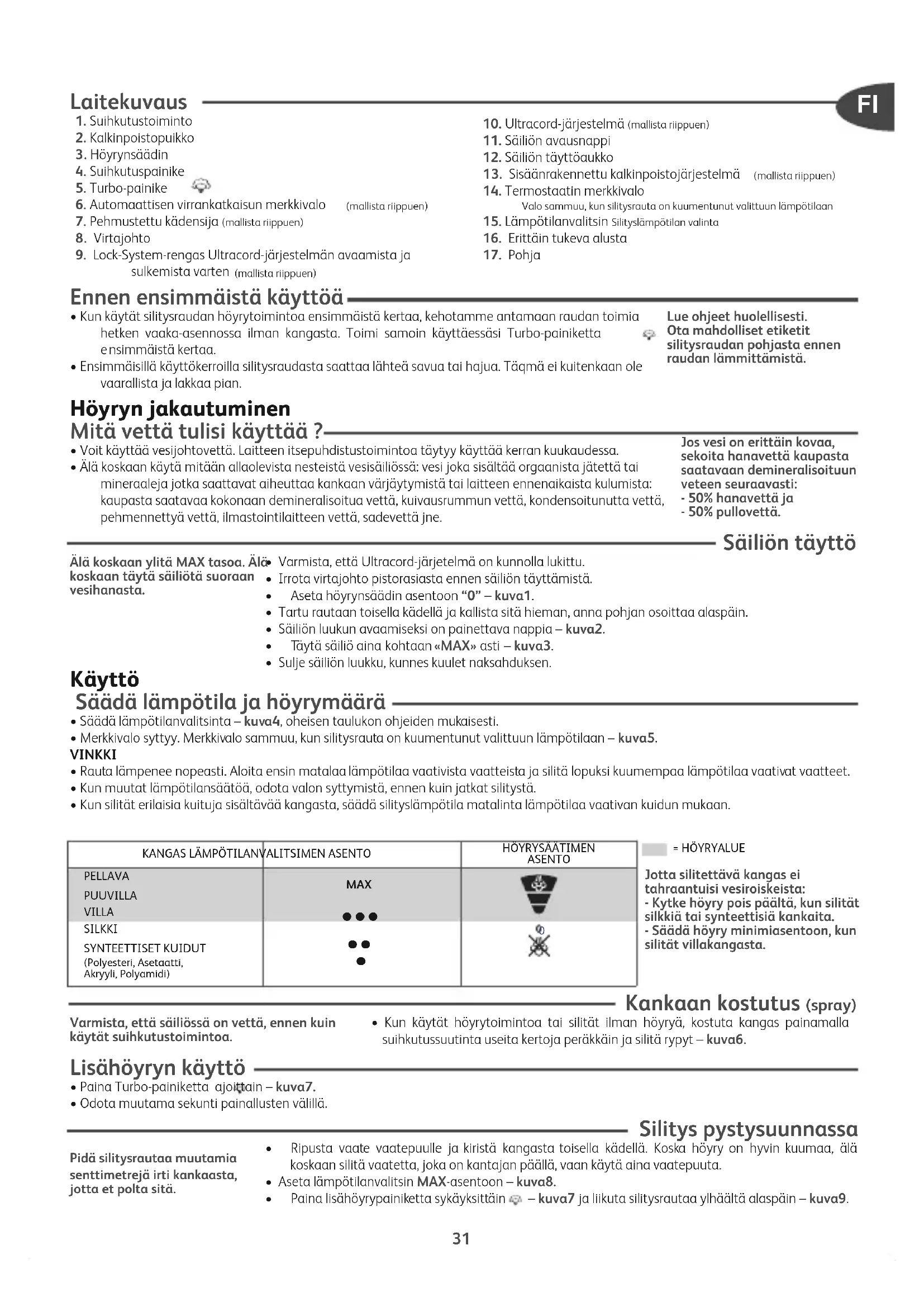 os vesi on erittäin kovaa, sekoita hanavettä kaupasta saatavaan demineralisoituun veteen seuraavasti: - 50% hanavettä ja - 50% pullovettä. Lue ohjeet huolellisesti. Ota mahdolliset etiketit silitysraudan pohjasta ennen raudan lämmittämistä. KANGAS LÄMPÖTILANVALITSIMEN ASENTOHÖYRYSÄÄTIMENASENTOPELLAVAPUUVILLAVILLASILKKISYNTEETTISET KUIDUT(Polyesteri, Asetaatti,Akryyli, Polyamidi) MAX