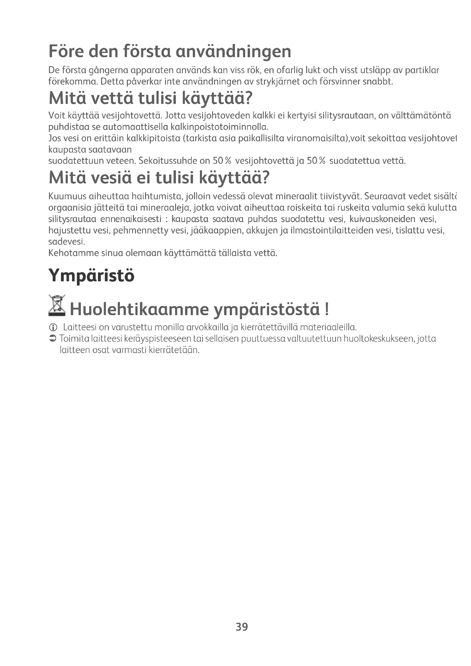 1800129033 FV38XX E0 FTI5_110x154 30/04/13 11:20 Page3839 Före den första användningen De första gångerna apparaten används kan viss rök, en ofarlig lukt och visst utsläpp av partiklar förekomma. Detta påverkar inte användningen av strykjärnet och försvinner snabbt. Mitä vettä tulisi käyttää? Voit käyttää vesijohtovettä. Jotta vesijohtoveden kalkki ei kertyisi silitysrautaan, on välttämätöntä puhdistaa se automaattisella kalkinpoistotoiminnolla. Jos vesi on erittäin kalkkipitoista (tarkista asia paikallisilta viranomaisilta),voit sekoittaa vesijohtovettä kaupasta saatavaan suodatettuun veteen. Sekoitussuhde on 50% vesijohtovettä ja 50% suodatettua vettä. Mitä vesiä ei tulisi käyttää? Kuumuus aiheuttaa haihtumista, jolloin vedessä olevat mineraalit tiivistyvät. Seuraavat vedet sisältävät orgaanisia jätteitä tai mineraaleja, jotka voivat aiheuttaa roiskeita tai ruskeita valumia sekä kuluttaa silitysrautaa ennenaikaisesti : kaupasta saatava puhdas suodatettu vesi, kuivauskoneiden vesi, hajustettu vesi, pehmennetty vesi, jääkaappien, akkujen ja ilmastointilaitteiden vesi, tislattu vesi, sadevesi. Kehotamme sinua olemaan käyttämättä tällaista vettä. Ympäristö Huolehtikaamme ympäristöstä ! Laitteesi on varustettu monilla arvokkailla ja kierrätettävillä materiaaleilla. Toimita laitteesi keräyspisteeseen tai sellaisen puuttuessa valtuutettuun huoltokeskukseen, jotta laitteen osat varmasti kierrätetään. 1800129033 FV38XX E0 FTI5_110x154 30/04/13 11:20 Page39ONGELMA MAHDOLLISIA SYITÄ RATKAISU Pohjan rei’istä vuotaavettä.Rauta valuttaa silityksenalussa.Valitussa lämpötilassa eimuodostu höyryä.Höyrytoiminto on käytössä, muttarauta ei ole riittävän kuuma.Lisähöyrypainiketta painetaan liianusein.Liikaa höyryä.Olet laittanut silitysraudansäilytyspaikkaan vaakatasoon,mutta sitä ole tyhjennetty eikähöyrynsäädintä ole asetettuasentoon .Olet vetänyt kalkinpoistokapselinpois raudan täyttöä varten.Säädä termostaatti höyrymäärän mukaan (•• - MAX).Odota, että merkkivalo sammuu.Odota hetki käyttöjen välillä.Säädä höyrymäärä pienemmäksi Katso lisätietoja kappaleesta « Silitysraudansäilytys » Älä ota kalkinpoistokapselia pois raudantäytön aikana.Pohjan rei’istä valuuruskeaa nestettä, jokalikaa silitettävänkankaan.Olet käyttänyt kemiallistakalkinpoistoainetta.Et käytä oikeanlaista vettä.Pohjan aukkoihin on kerääntynytkankaan kuituja, jotka hiiltyvät. Vaatetta ei ole huuhdeltu riittävänhyvin tai olet silittänyt uuttavaatetta ennen sen pesemistä.Älä lisää säiliön veteen kalkinpoistoainetta.Suorita raudan itsepuhdistus ja katso kohdasta“Mitä vettä voin käyttää?”Suorita raudan itsepuhdistus ja puhdista pohjakostealla sienellä. Tyhjennä pohjan reiätsäännöllisesti.Varmista että pyykki on kunnolla huuhdeltujottei pesuaineen jäämät tai muut kemikaalitpala kiiinni uuteen vaatteeseen. Pohja on likainen tairuskea ja voi tahratasilitettävän kankaan.Lämpötila on liian korkea.Käytät tärkkiä Puhdista pohja yllä olevan ohjeen mukaisesti.Valitse oikea lämpötila lämpötilataulukosta.Puhdista pohja yllä olevan ohjeen mukaisesti.Sirottele tärkki kankaan nurjalle puolelle. Höyryä syntyy vähän taiei ollenkaan.Vesisäiliö on tyhjä.Kalkinpoistopuikko on likainen.Silitysrauta on kalkkeutunut.Silitysrautaa on käytetty liiankauan kuivana.Täytä säiliö.Puhdista kalkinpoistopuikkoPuhdista kalkinpoistopuikko ja teeautomaattinen puhdistus.Tee automaattinen puhdistus.Pohja onnaarmuuntunut taipilaantunut.Silitysrauta on laskettusilityslaudan metallialustalle.Laita rauta aina pystyasentoon.Silitysrauta muodostaahöyryä säiliön täytönlopuksi.Höyrynsäädin ei ole asennossa .Vesisäiliö on liian täynnä. Varmista, että höyrynsäädin on asennossa .Älä koskaan ylitä max tasoa.Spray ei suihkuta vettä Vesisäiliö ei ole riittävän täynnä.Täytä vesisäiliö