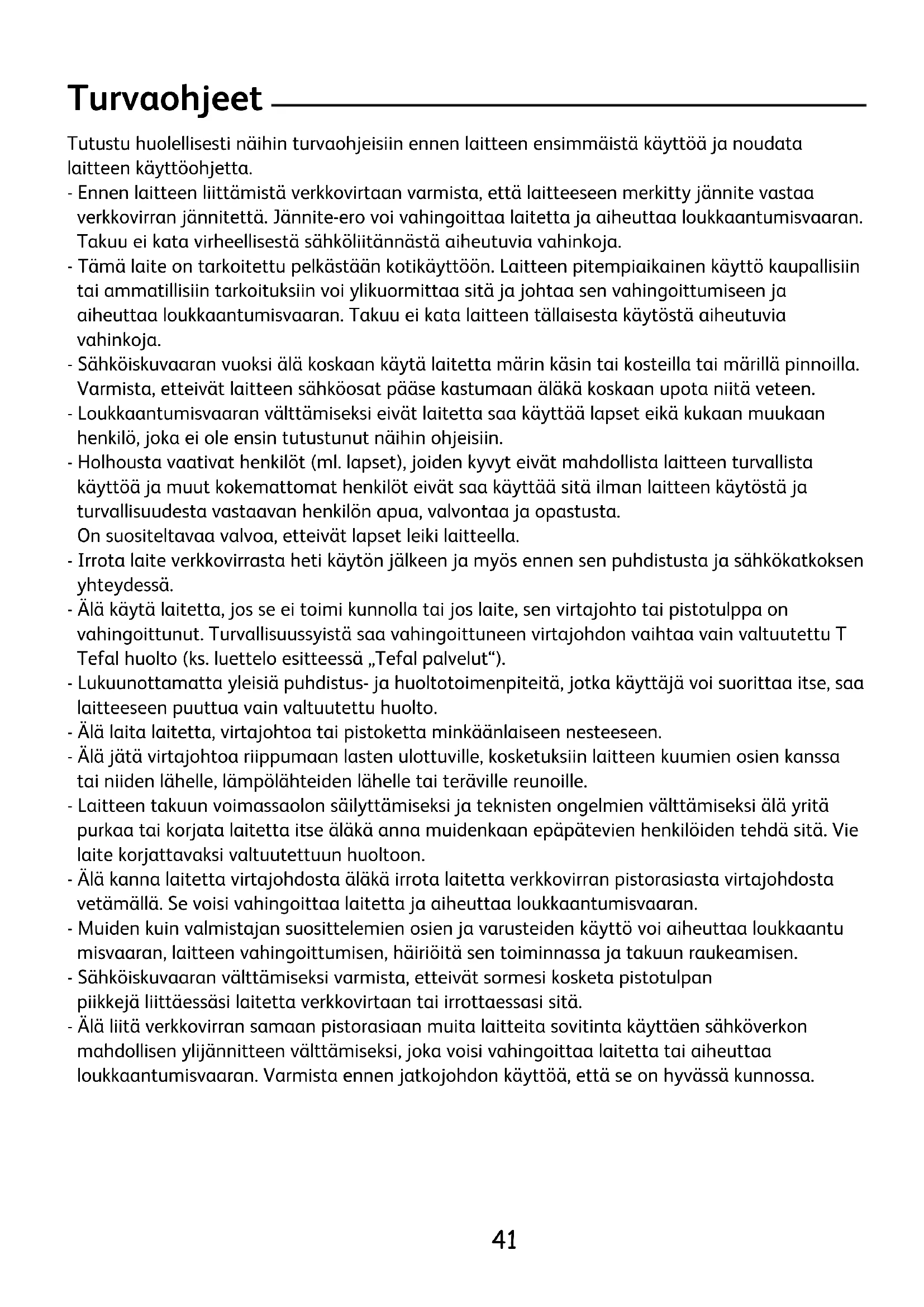 TA DEL I MILJØVERN! Apparatet inneholder mange gjenvinnbare og resirkulerbare materialer. Ta det med til et oppsamlingssted eller av mangel på dette til et godkjent servicesenter slik at avfallet kan behandles. Resirkulering av elektriske eller elektroniske produkter BATTEUR_PREP-LINE_2544991_8141 N°1 01/12/10 16:46 Page4041 Turvaohjeet Tutustu huolellisesti näihin turvaohjeisiin ennen laitteen ensimmäistä käyttöä ja noudata laitteen käyttöohjetta. - Ennen laitteen liittämistä verkkovirtaan varmista, että laitteeseen merkitty jännite vastaa verkkovirran jännitettä. Jännite-ero voi vahingoittaa laitetta ja aiheuttaa loukkaantumisvaaran. Takuu ei kata virheellisestä sähköliitännästä aiheutuvia vahinkoja. - Tämä laite on tarkoitettu pelkästään kotikäyttöön. Laitteen pitempiaikainen käyttö kaupallisiin tai ammatillisiin tarkoituksiin voi ylikuormittaa sitä ja johtaa sen vahingoittumiseen ja aiheuttaa loukkaantumisvaaran. Takuu ei kata laitteen tällaisesta käytöstä aiheutuvia vahinkoja. - Sähköiskuvaaran vuoksi älä koskaan käytä laitetta märin käsin tai kosteilla tai märillä pinnoilla. Varmista, etteivät laitteen sähköosat pääse kastumaan äläkä koskaan upota niitä veteen. - Loukkaantumisvaaran välttämiseksi eivät laitetta saa käyttää lapset eikä kukaan muukaan henkilö, joka ei ole ensin tutustunut näihin ohjeisiin. - Holhousta vaativat henkilöt (ml. lapset), joiden kyvyt eivät mahdollista laitteen turvallista käyttöä ja muut kokemattomat henkilöt eivät saa käyttää sitä ilman laitteen käytöstä ja turvallisuudesta vastaavan henkilön apua, valvontaa ja opastusta. On suositeltavaa valvoa, etteivät lapset leiki laitteella. - Irrota laite verkkovirrasta heti käytön jälkeen ja myös ennen sen puhdistusta ja sähkökatkoksen yhteydessä. - Älä käytä laitetta, jos se ei toimi kunnolla tai jos laite, sen virtajohto tai pistotulppa on vahingoittunut. Turvallisuussyistä saa vahingoittuneen virtajohdon vaihtaa vain valtuutettu T Tefal huolto (ks. luettelo esitteessä „Tefal palvelut“). - Lukuunottamatta yleisiä puhdistus- ja huoltotoimenpiteitä, jotka käyttäjä voi suorittaa itse, saa laitteeseen puuttua vain valtuutettu huolto. - Älä laita laitetta, virtajohtoa tai pistoketta minkäänlaiseen nesteeseen. - Älä jätä virtajohtoa riippumaan lasten ulottuville, kosketuksiin laitteen kuumien osien kanssa tai niiden lähelle, lämpölähteiden lähelle tai teräville reunoille. - Laitteen takuun voimassaolon säilyttämiseksi ja teknisten ongelmien välttämiseksi älä yritä purkaa tai korjata laitetta itse äläkä anna muidenkaan epäpätevien henkilöiden tehdä sitä. Vie laite korjattavaksi valtuutettuun huoltoon. - Älä kanna laitetta virtajohdosta äläkä irrota laitetta verkkovirran pistorasiasta virtajohdosta vetämällä. Se voisi vahingoittaa laitetta ja aiheuttaa loukkaantumisvaaran. - Muiden kuin valmistajan suosittelemien osien ja varusteiden käyttö voi aiheuttaa loukkaantu misvaaran, laitteen vahingoittumisen, häiriöitä sen toiminnassa ja takuun raukeamisen. - Sähköiskuvaaran välttämiseksi varmista, etteivät sormesi kosketa pistotulpan piikkejä liittäessäsi laitetta verkkovirtaan tai irrottaessasi sitä. - Älä liitä verkkovirran samaan pistorasiaan muita laitteita sovitinta käyttäen sähköverkon mahdollisen ylijännitteen välttämiseksi, joka voisi vahingoittaa laitetta tai aiheuttaa loukkaantumisvaaran. Varmista ennen jatkojohdon käyttöä, että se on hyvässä kunnossa. BATTEUR_PREP-LINE_2544991_8141 N°1 01/12/10 16:46 Page4142 - Loukkaantumisvaaran välttämiseksi varmista, etteivät hiukset, vaatteet tai muut esineet voi tarttua laitteen pyöriviin osiin. - Älä kosketa vispilöitä tai taikinakoukkuja äläkä työnnä laitteeseen mitään esinettä (veistä, haarukkaa, lusikkaa yms.), mikä voisi aiheuttaa loukkaantumisvaaran itsellesi ja muille tai vahingoittaa laitetta. Kaavinta voidaan käyttää vain kun laitetta ei käytetä. - Laitteen vahingoittumisen välttämiseksi älä laita sitä tai sen varusteita pakastimeen tai tavalliseen tai mikroaaltouuniin. - Laitteen varusteet on tarkoitettu ruokien valmistukseen. Älä käytä niitä muiden aineiden sekoitukseen. - Pysäytä laite ja irrota se verkkovirrasta ennen sen puhdistusta ja ennen varusteiden liittämistä tai irrottamista, tai jos lähdet sen luota lyhyeksikin ajaksi varsinkin lasten läsnäollessa. Varotoimenpiteet käytön Aikana A. Vispilät ohuille aineksille B. Nopeuden valintakytkin C. Irrotuspainike (vispilöiden ja taikinakoukkujen irottamiseen) D. Taikinakoukut paksulle taikinalle E. Painike Turbo F. Sauvasekoitin (vain tuotteessa no. 8142) G. Mitta-astia (vain tuotteessa no. 8142) H. Levyvispilät (eivät kuulu toimitukseen. Saatavissa valtuutetuilta myyjiltä, tilausno. SA192377)