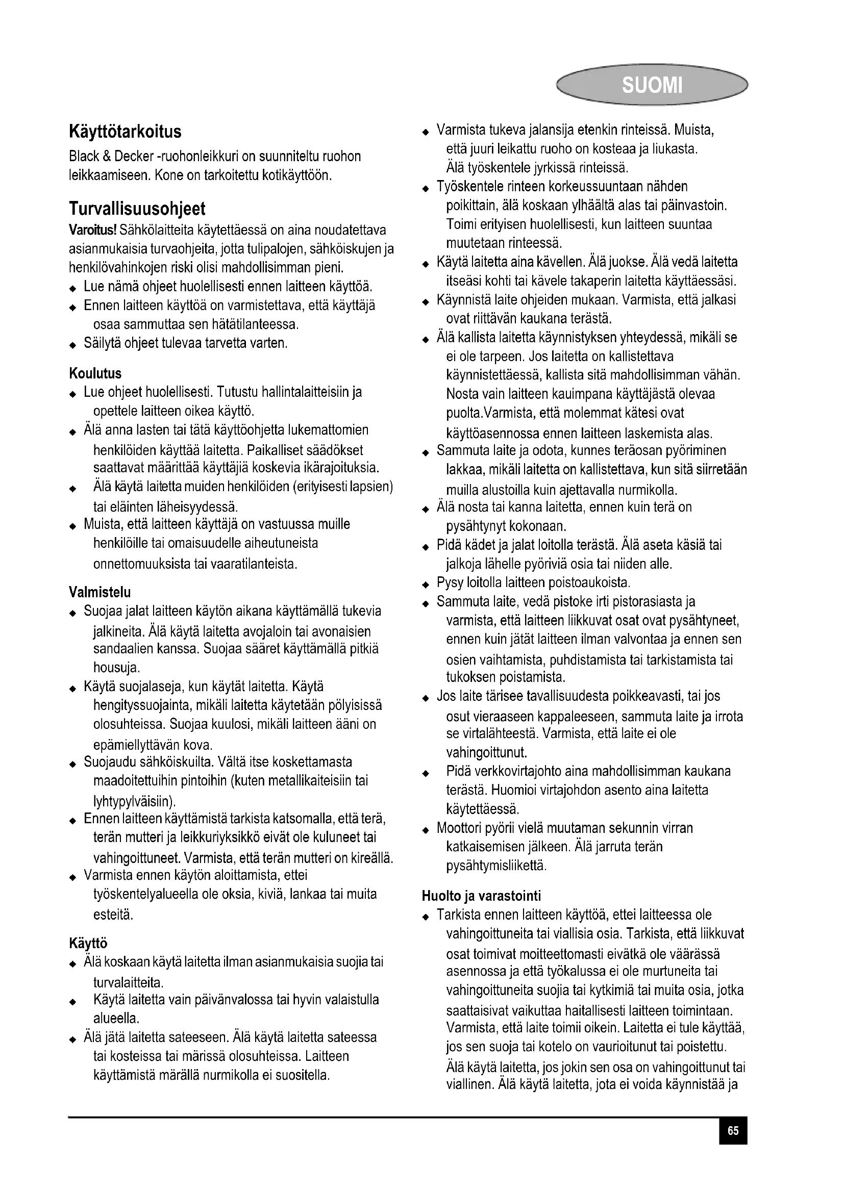 11,464 DANSK Garanti Black & Decker garanterer, at produktet er fri for materielle skader og/eller fabrikationsfejl ved levering til kunden. Garantien er et tillæg til forbrugerens lovsikrede rettigheder og påvirker ikke disse. Garantien gælder inden for medlemsstaterne af den Europæiske Union og i det Europæiske Frihandelsområde. Hvis et Black & Decker-produkt går i stykker på grund af materiel skade og/eller fabrikationsfejl eller på anden måde ikke fungerer i overensstemmelse med specifikationen inden for 24 måneder fra købsdatoen, påtager Black & Decker sig at reparere eller ombytte produktet med mindst mulig ulempe for kunden. Garantien gælder ikke for fejl og mangler, der er sket i forbindelse med: Produktet har været anvendt erhvervsmæssigt eller til udlejning. Produktet har været anvendt forkert eller er ikke vedligeholdt. Produktet er beskadiget af fremmedlegemer, substanser eller pga. uheld. Garantien gælder ikke, hvis reparationer er udført af nogen anden end et autoriseret Black & Decker- værksted. For at udnytte garantien skal produktet og købskvitteringen indleveres til forhandleren eller til et autoriseret værksted. Kontakt det lokale Black & Decker-kontor på den adresse, som er opgivet i denne vejledning, for at få oplysninger om det nærmeste autoriserede værksted. En liste over alle autoriserede Black & Decker-serviceværksteder samt servicevilkår er tilgængelig på internettet på adressen: www.2helpU.com Gå venligst ind på vores website www.blackanddecker.dk for at registrere dit nye produkt og for at blive holdt ajour om nye produkter og specialtilbud. Der findes yderligere oplysninger om mærket Black & Decker og vores produktsortiment på adressen www.blackanddecker.dk.65 SUOMI Suomi Käyttötarkoitus Black & Decker -ruohonleikkuri on suunniteltu ruohon leikkaamiseen. Kone on tarkoitettu kotikäyttöön. Turvallisuusohjeet Varoitus! Sähkölaitteita käytettäessä on aina noudatettava asianmukaisia turvaohjeita, jotta tulipalojen, sähköiskujen ja henkilövahinkojen riski olisi mahdollisimman pieni. Lue nämä ohjeet huolellisesti ennen laitteen käyttöä. Ennen laitteen käyttöä on varmistettava, että käyttäjä osaa sammuttaa sen hätätilanteessa. Säilytä ohjeet tulevaa tarvetta varten. Koulutus Lue ohjeet huolellisesti. Tutustu hallintalaitteisiin ja opettele laitteen oikea käyttö. Älä anna lasten tai tätä käyttöohjetta lukemattomien henkilöiden käyttää laitetta. Paikalliset säädökset saattavat määrittää käyttäjiä koskevia ikärajoituksia. Älä käytä laitetta muiden henkilöiden (erityisesti lapsien) tai eläinten läheisyydessä. Muista, että laitteen käyttäjä on vastuussa muille henkilöille tai omaisuudelle aiheutuneista onnettomuuksista tai vaaratilanteista. Valmistelu Suojaa jalat laitteen käytön aikana käyttämällä tukevia jalkineita. Älä käytä laitetta avojaloin tai avonaisien sandaalien kanssa. Suojaa sääret käyttämällä pitkiä housuja. Käytä suojalaseja, kun käytät laitetta. Käytä hengityssuojainta, mikäli laitetta käytetään pölyisissä olosuhteissa. Suojaa kuulosi, mikäli laitteen ääni on epämiellyttävän kova. Suojaudu sähköiskuilta. Vältä itse koskettamasta maadoitettuihin pintoihin (kuten metallikaiteisiin tai lyhtypylväisiin). Ennen laitteen käyttämistä tarkista katsomalla, että terä, terän mutteri ja leikkuriyksikkö eivät ole kuluneet tai vahingoittuneet. Varmista, että terän mutteri on kireällä. Varmista ennen käytön aloittamista, ettei työskentelyalueella ole oksia, kiviä, lankaa tai muita esteitä. Käyttö Älä koskaan käytä laitetta ilman asianmukaisia suojia tai turvalaitteita. Käytä laitetta vain päivänvalossa tai hyvin valaistulla alueella. Älä jätä laitetta sateeseen. Älä käytä laitetta sateessa tai kosteissa tai märissä olosuhteissa. Laitteen käyttämistä märällä nurmikolla ei suositella. Varmista tukeva jalansija etenkin rinteissä. Muista, että juuri leikattu ruoho on kosteaa ja liukasta. Älä työskentele jyrkissä rinteissä. Työskentele rinteen korkeussuuntaan nähden poikittain, älä koskaan ylhäältä alas tai päinvastoin. Toimi erityisen huolellisesti, kun laitteen suuntaa muutetaan rinteessä. Käytä laitetta aina kävellen. Älä juokse. Älä vedä laitetta itseäsi kohti tai kävele takaperin laitetta käyttäessäsi. Käynnistä laite ohjeiden mukaan. Varmista, että jalkasi ovat riittävän kaukana terästä. Älä kallista laitetta käynnistyksen yhteydessä, mikäli se ei ole tarpeen. Jos laitetta on kallistettava käynnistettäessä, kallista sitä mahdollisimman vähän. Nosta vain laitteen kauimpana käyttäjästä olevaa puolta.Varmista, että molemmat kätesi ovat käyttöasennossa ennen laitteen laskemista alas. Sammuta laite ja odota, kunnes teräosan pyöriminen lakkaa, mikäli laitetta on kallistettava, kun sitä siirretään muilla alustoilla kuin ajettavalla nurmikolla. Älä nosta tai kanna laitetta, ennen kuin terä on pysähtynyt kokonaan. Pidä kädet ja jalat loitolla terästä. Älä aseta käsiä tai jalkoja lähelle pyöriviä osia tai niiden alle. Pysy loitolla laitteen poistoaukoista. Sammuta laite, vedä pistoke irti pistorasiasta ja varmista, että laitteen liikkuvat osat ovat pysähtyneet, ennen kuin jätät laitteen ilman valvontaa ja ennen sen osien vaihtamista, puhdistamista tai tarkistamista tai tukoksen poistamista. Jos laite tärisee tavallisuudesta poikkeavasti, tai jos osut vieraaseen kappaleeseen, sammuta laite ja irrota se virtalähteestä. Varmista, että laite ei ole vahingoittunut. Pidä verkkovirtajohto aina mahdollisimman kaukana terästä. Huomioi virtajohdon asento aina laitetta käytettäessä. Moottori pyörii vielä muutaman sekunnin virran katkaisemisen jälkeen. Älä jarruta terän pysähtymisliikettä. Huolto ja varastointi Tarkista ennen laitteen käyttöä, ettei laitteessa ole vahingoittuneita tai viallisia osia. Tarkista, et