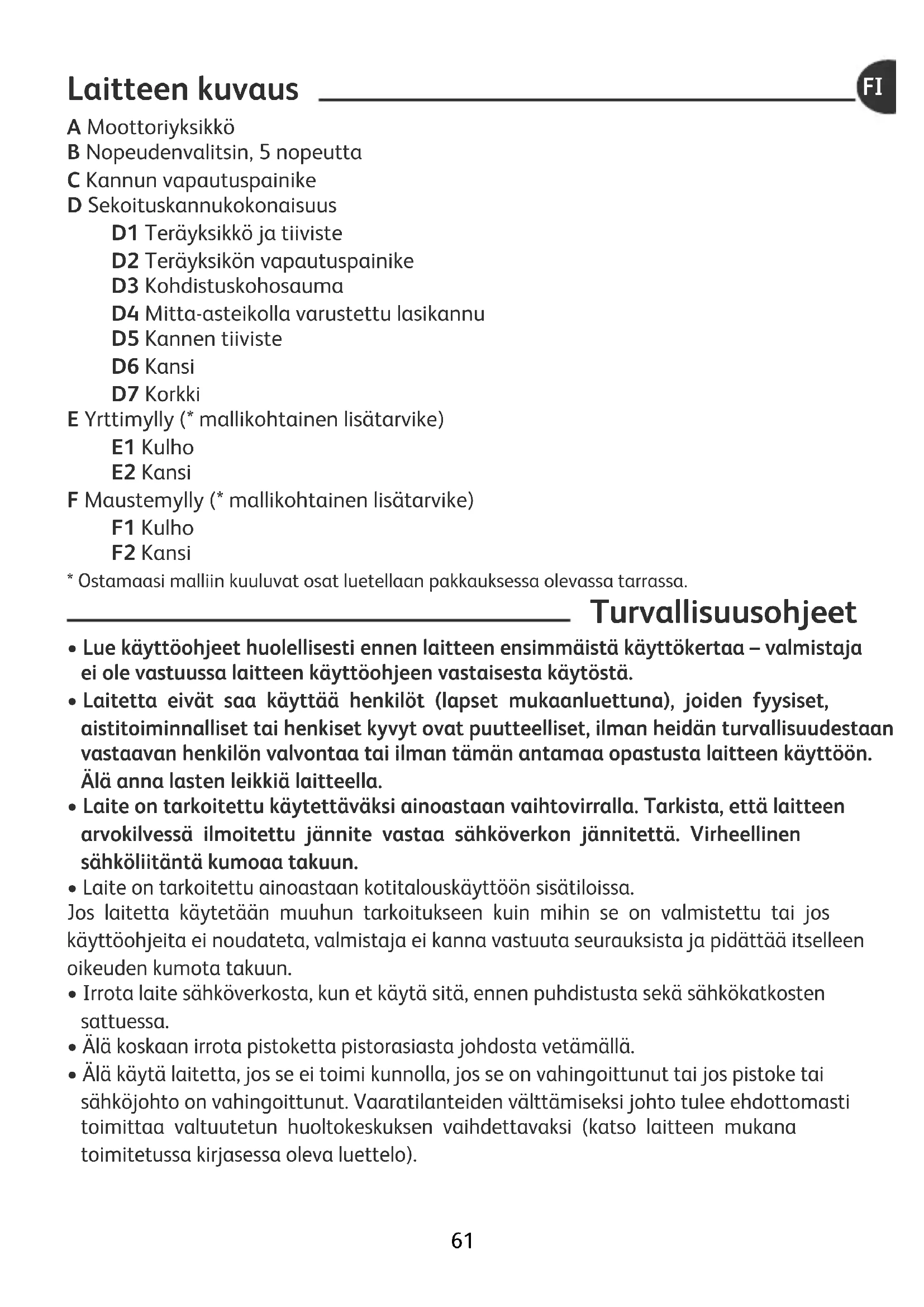- Ostamaasi malliin kuuluvat osat luetellaan pakkauksessa olevassa tarrassa. Turvallisuusohjeet