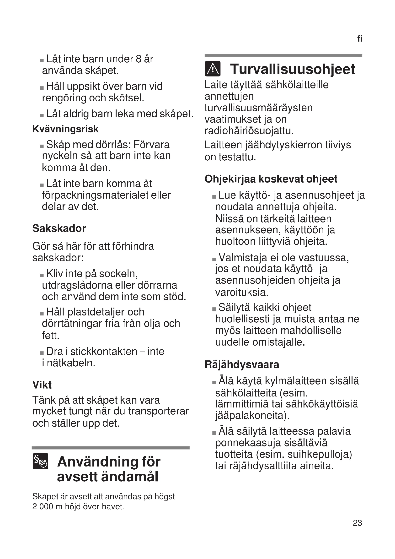 ■ Säilytä pulloja, joissa on korkeaprosenttista alkoholia, vain pystyasennossa ja tiiviisti suljettuna. Sähköiskun vaara Väärin tehdyistä asennuksista ja korjauksista saattaa käyttäjälle aiheutua vakavia turvallisuusriskejä. ■ Kun verkkoliitäntäjohto on vioittunut: Irrota laite heti verkkovirrasta. ■ Laitteen korjaukset saa tehdä vain valmistaja, valtuutettu huoltoliike tai vastaavan pätevyyden omaava henkilö. ■ Käytä vain valmistajan alkuperäisosia. ■ Valmistaja takaa, että turvallisuusvaatimukset on täytetty käytettäessä alkuperäisosia. ■ Verkkoliitäntäjohdon jatkojohdon saa hankkia vain valtuutetusta huoltopalvelusta. Jäätymisvamman vaara ■ Älä laita pakastinosasta otettuja pakasteita heti suuhun. ■ Varo ettei iho altistu pidemmäksi aikaa pakasteille, jäälle tai pakastinosan putkille. Loukkaantumisvaara Hiilihappoisia juomia sisältävät astiat saattavat rikkoutua. Älä säilytä pakastinosassa hiilihappoisia juomia sisältäviä astioita. Kylmäaineen aiheuttamat vaarat Jäähdytyskierron putkissa on jonkin verran ympäristöystävällistä mutta herkästi syttyvää kylmäainetta R600a. Se ei vahingoita otsonikerrosta eikä lisää kasvihuoneilmiötä. Ulos vuotava kylmäaine saattaa aiheuttaa silmävammoja tai syttyä tuleen. ■ Varo, että putket eivät vaurioidu. Putkien vauriotapauksessa: ■ Vältä avotulta ja pidä sytytyslähteet loitolla. ■ Tuuleta huone. ■ Kytke laite pois päältä ja irrota pistotulppa pistorasiasta. ■ Soita huoltoon. Näin vältät lapsiin ja apua tarvitseviin henkilöihin kohdistuvat riskit Vaaralle alttiina ovat: ■ lapset,25
