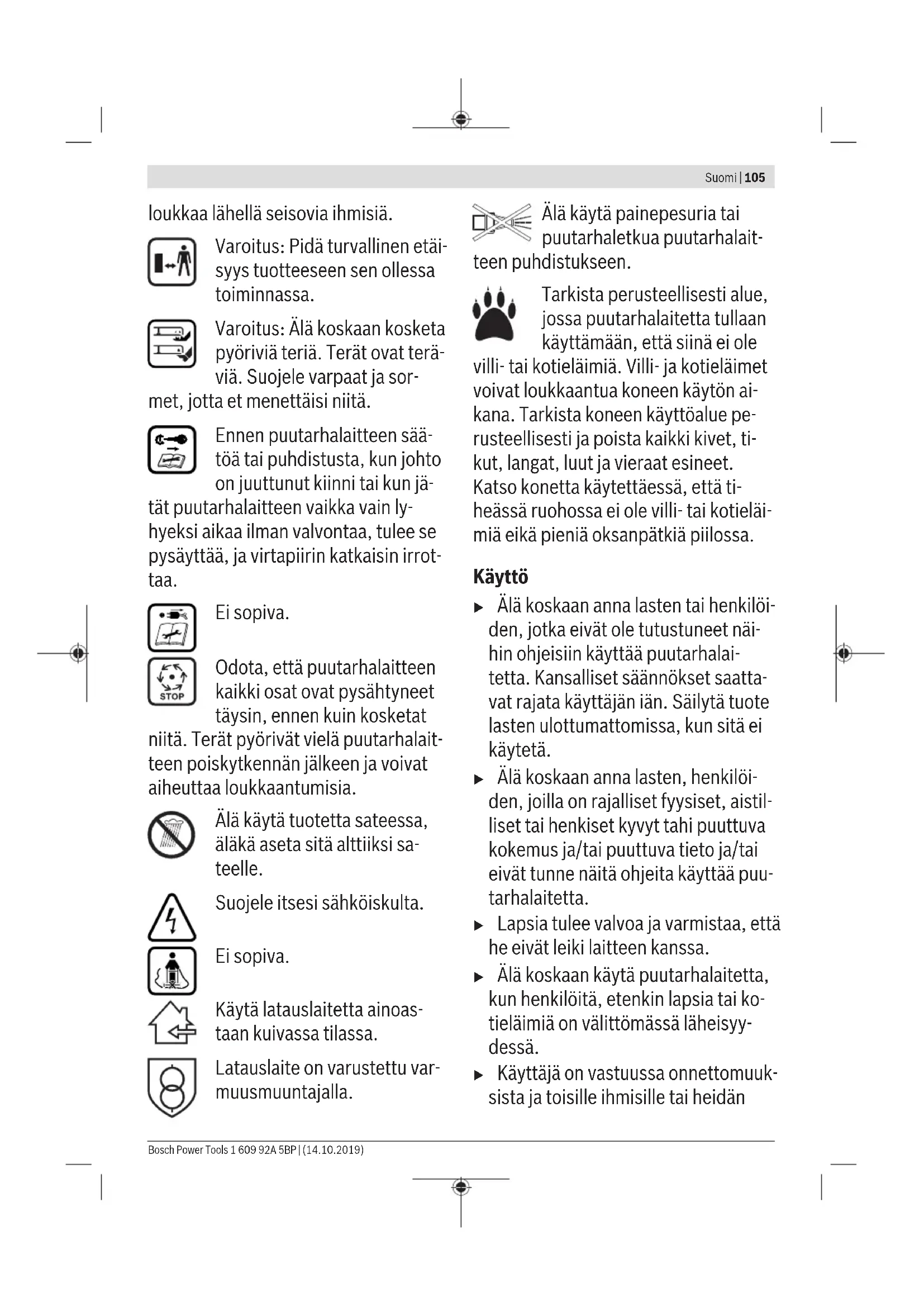 For å forlenge driftstiden kan du kjøpe et ekstra batteri hos et autorisert kundeservice for Bosch hageredskaper. Feilsøking Symptom Mulig årsak Løsning Motoren starter ikke Interne kabelforbindelser i hageredskapet er defekt Ta kontakt med Bosch kundeservice Utladet batteri Lad batteriet For kaldt/varmt batteri Varm opp/avkjøl batteriet For høyt gress Max. tillatt gresshøyde er 30 cm med den største innstillingen av klippehøyden Motorvernet er utløst La motoren avkjøle og innstill større klippehøyder Skillebryteren er ikke satt riktig/ikke komplett inn Sett den riktig inn Hageredskapet går rykkvis Interne kabelforbindelser i hageredskapet er defekt Ta kontakt med Bosch kundeservice Motorvernet er utløst La motoren avkjøle og innstill større klippehøyder Hageredskap etterlater et uregelmessig klippemønster og/eller motor arbeider tungt For liten klippehøyde Innstill en høyere klippehøyde Kniven er butt Skift ut kniv (se bilde J) Tetting mulig Slå av hageredskap og ta av skillebryter Sjekk hageredskapets underside og gjør den fri om nødvendig (bruk alltid arbeidshansker) Kniven er galt montert Monter kniven riktig Etter innkobling av hageredskapet dreier kniven seg ikke Knivene blokkeres av gress Slå av hageredskap og ta av strømkretsbryter Fjern tettingen (bruk alltid arbeidshansker) Løs knivmutter/-skrue Trekk fast knivmutter/-skrue (27Nm) Sterke vibrasjoner/ lyder Løs knivmutter/-skrue Trekk fast knivmutter/-skrue (27Nm) Skadet kniv Skift ut kniv (se bilde J) Batteri og ladeapparat Symptomer Mulig årsak Avhjelp Rød batteri- ladeindikator blinker Ingen opplading mulig Batteriet er ikke satt (riktig) inn Sett batteri riktig på ladeapparatet Batterikontaktene er tilsmusset Rengjør batterikontaktene; f.eks. ved hyppig innsetting og fjerning av batteriet, skift eventuelt ut batteriet Batteriet er defekt Skift ut batteriet Batteri-ladeindikatorer lyser ikke på ladeapparatet Strømstøpselet til ladeapparatet er ikke satt (riktig) inn Sett strømstøpselet (helt) inn i stikkontakten Bosch Power Tools 1 609 92A 5BP | (14.10.2019)104 | Suomi Symptomer Mulig årsak Avhjelp Stikkontakt, strømledning eller ladeapparat er defekt Sjekk strømspenningen, la ladeapparatet eventuelt kontrolleres av en autorisert kundeservice for Bosch-elektroverktøy Service og vedlikehold Stell av batteriet u OBS! Slå av hageredskapet, ta av skillebryteren og fjern batteriet samt gressoppsamleren før du utfører vedlikeholds- og rengjøringsarbeider. u Bruk alltid arbeidshansker når du håndterer eller arbeider i nærheten av de skarpe knivene. For å sikre en optimal bruk av batteriet, må du ta hensyn til følgende informasjoner og tiltak: – Beskytt batteriet mot fuktighet og vann. – Lagre hageredskapet og batteriet kun i temperaturområdet fra –20 °C og 50 °C. La hageredskapet f. eks. om sommeren ikke ligge i bilen. – Lagre batteri separat og ikke i hageredskapet. – Ikke la batteriet stå i hageredskapet ved direkte sol. – Den optimale temperaturen for oppbevaring av batteriet er 5 °C. – Rengjør ventilasjonssprekkene på batteriet regelmessig med en myk, ren og tørr pensel. En vesentlig kortere driftstid etter opplading er et tegn på at batteriet er oppbrukt og må skiftes ut. Kundeservice og kundeveiledning www.bosch-garden.com Ved alle forespørsler og reservedelsbestillinger må du oppgi det 10‑sifrede produktnummeret som er angitt på produktets typeskilt. Norsk Robert Bosch AS Postboks 350 1402 Ski Tel.: 64 87 89 50 Faks: 64 87 89 55 Transport Li-ion-batteriene i verktøyet underligger kravene for farlig gods. Batteriene kan transporteres på veier av brukeren uten ytterligere krav. Ved forsendelse som utføres av tredje personer (f.eks.: lufttransport eller spedisjon) må det oppfylles spesielle krav til emballasje og merking. Du må da konsultere en ekspert for farlig gods ved forberedelse av forsendelsen. Send batterier kun hvis huset ikke er skadet. Lim igjen de åpne kontaktene og pakk batteriet slik at det ikke beveger seg i emballasjen. Følg også eventuelle ytterligere nasjonale forskrifter. Deponering Hageredskaper, batterier, tilbehør og emballasje må leveres inn til miljøvennlig gjenvinning. Hagredskaper og batterier må ikke kastes i vanlig søppel! Kun for EU‑land: Iht. det europeiske direktivet 2012/19/EU om gamle elektriske og elektroniske maskiner og iht. det europeiske direktivet 2006/66/EF må defekte eller oppbrukte batterier/oppladbare batterier samles inn adskilt og leveres inn til en miljøvennlig resirkulering. Batterier/oppladbare batterier: Li-Ion: Ta hensyn til informasjonene i avsnittet Transport. Suomi Turvallisuusohjeita Huomio! Lue seuraavat ohjeet tar- kasti. Tutustu tuotteen käyttöele- mentteihin ja asianmukaiseen käyt- töön. Säilytä käyttöohje huolellisesti myöhempää käyttöä varten. Puutarhalaitteessa, latauslaitteessa ja akussa olevien tunnuskuvien selitykset Yleiset varoitusohjeet. Lue käyttöohje huolellisesti. Varmista, että sivulle sinkou- tuvat vieraat esineet eivät 1 609 92A 5BP | (14.10.2019) Bosch Power ToolsSuomi | 105 loukkaa lähellä seisovia ihmisiä. Varoitus: Pidä turvallinen etäi- syys tuotteeseen sen ollessa toiminnassa. Varoitus: Älä koskaan kosketa pyöriviä teriä. Terät ovat terä- viä. Suojele varpaat ja sor- met, jotta et menettäisi niitä. Ennen puutarhalaitteen sää- töä tai puhdistusta, kun johto on juuttunut kiinni tai kun jä- tät puutarhalaitteen vaikka vain ly- hyeksi aikaa ilman valvontaa, tulee se pysäyttää, ja virtapiirin katkaisin irrot- taa. Ei sopiva. Odota, että puutarhalaitteen kaikki osat ovat pysähtyneet täysin, ennen kuin kosketat niitä. Terät pyörivät vielä puutarhalait- teen poiskytkennän jälkeen ja voivat aiheuttaa loukkaantumisia. Älä käytä tuotetta sateessa, äläkä aseta sitä alttiiksi sa- teelle. Suojele itsesi sähköiskulta. Ei sopiva. Käytä latauslaitetta ainoas- taan kuivassa tilassa. Latauslaite on varustettu