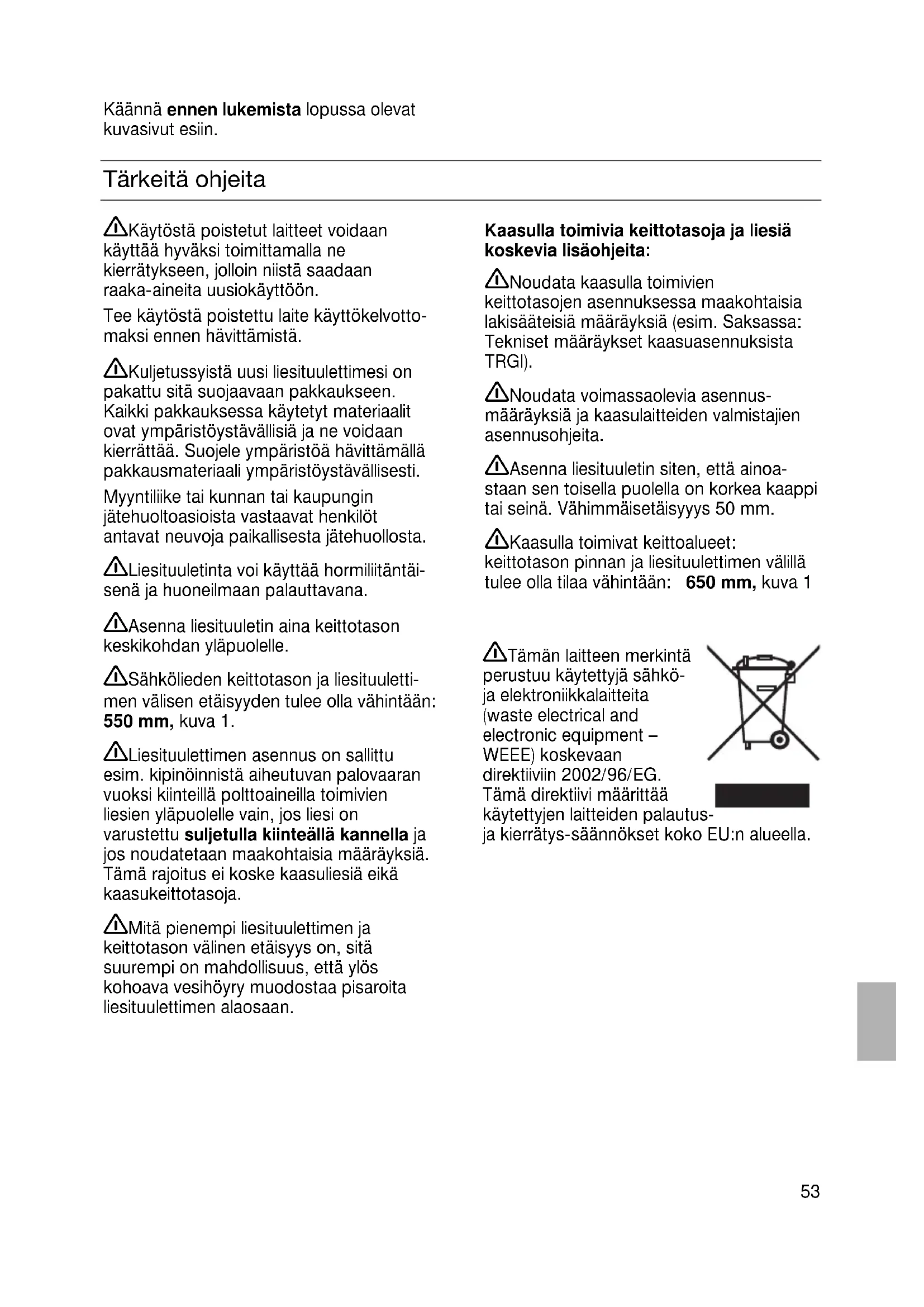0 lyser trykkes tasten i tillegg inntil indikasjonen C eller ~ lyser. Deretter slippes tasten igjen. Avluftsdrift til resirkulasjonsdrift: ❑ Indikasjonen C slukkes etter kort tid. Den elektroniske styringen er innstilt på resirkulasjonsdrift. Resirkulasjonsdrift til avluftsdrift: ❑ Indikasjonen ~ slukkes etter kort tid. Den elektroniske styringen er innstilt på avluftsdrift.53 Tärkeitä ohjeita Kaasulla toimivia keittotasoja ja liesiä koskevia lisäohjeita: Noudata kaasulla toimivien keittotasojen asennuksessa maakohtaisia lakisääteisiä määräyksiä (esim. Saksassa: Tekniset määräykset kaasuasennuksista TRGI). Noudata voimassaolevia asennus- määräyksiä ja kaasulaitteiden valmistajien asennusohjeita. Asenna liesituuletin siten, että ainoa- staan sen toisella puolella on korkea kaappi tai seinä. Vähimmäisetäisyyys 50 mm. Kaasulla toimivat keittoalueet: keittotason pinnan ja liesituulettimen välillä tulee olla tilaa vähintään: 650 mm, kuva 1 Käytöstä poistetut laitteet voidaan käyttää hyväksi toimittamalla ne kierrätykseen, jolloin niistä saadaan raaka-aineita uusiokäyttöön. Tee käytöstä poistettu laite käyttökelvotto- maksi ennen hävittämistä. Kuljetussyistä uusi liesituulettimesi on pakattu sitä suojaavaan pakkaukseen. Kaikki pakkauksessa käytetyt materiaalit ovat ympäristöystävällisiä ja ne voidaan kierrättää. Suojele ympäristöä hävittämällä pakkausmateriaali ympäristöystävällisesti. Myyntiliike tai kunnan tai kaupungin jätehuoltoasioista vastaavat henkilöt antavat neuvoja paikallisesta jätehuollosta. Liesituuletinta voi käyttää hormiliitäntäi- senä ja huoneilmaan palauttavana. Asenna liesituuletin aina keittotason keskikohdan yläpuolelle. Sähkölieden keittotason ja liesituuletti- men välisen etäisyyden tulee olla vähintään: 550 mm, kuva 1. Liesituulettimen asennus on sallittu esim. kipinöinnistä aiheutuvan palovaaran vuoksi kiinteillä polttoaineilla toimivien liesien yläpuolelle vain, jos liesi on varustettu suljetulla kiinteällä kannella ja jos noudatetaan maakohtaisia määräyksiä. Tämä rajoitus ei koske kaasuliesiä eikä kaasukeittotasoja. Mitä pienempi liesituulettimen ja keittotason välinen etäisyys on, sitä suurempi on mahdollisuus, että ylös kohoava vesihöyry muodostaa pisaroita liesituulettimen alaosaan. Käännä ennen lukemista lopussa olevat kuvasivut esiin. Tämän laitteen merkintä perustuu käytettyjä sähkö- ja elektroniikkalaitteita (waste electrical and electronic equipment – WEEE) koskevaan direktiiviin 2002/96/EG. Tämä direktiivi määrittää käytettyjen laitteiden palautus- ja kierrätys-säännökset koko EU:n alueella.54 Ennen asennusta Toiminta hormiliitäntäisenä kuva 2 Poistoilma johdetaan ylös ilmanvaihto- hormin kautta.