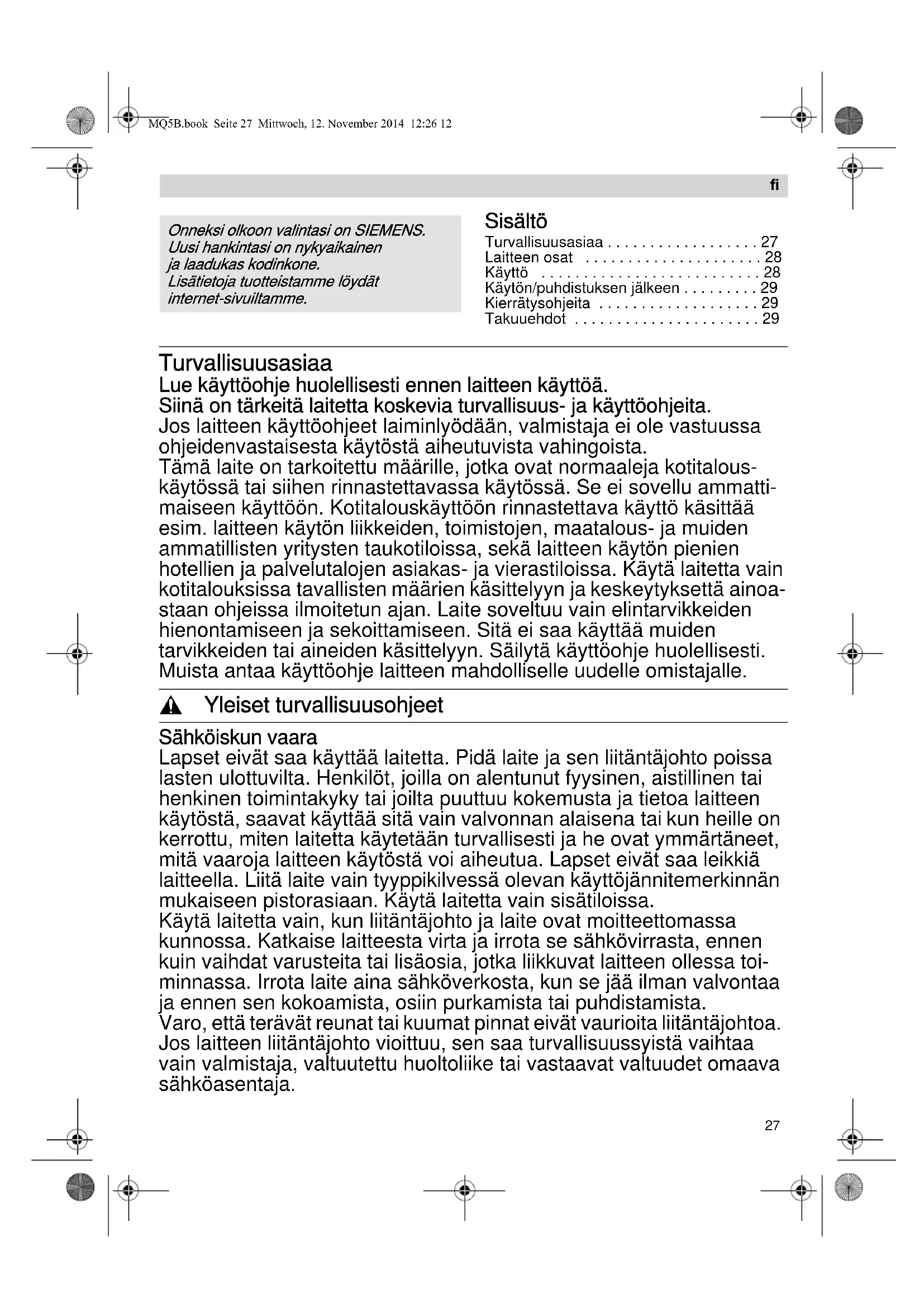 - Takuuehdot Turvallisuusasiaa Lue käyttöohje huolellisesti ennen laitteen käyttöä. Siinä on tärkeitä laitetta koskevia turvallisuus- ja käyttöohjeita. Jos laitteen käyttöohjeet laiminlyödään, valmistaja ei ole vastuussa ohjeidenvastaisesta käytöstä aiheutuvista vahingoista. Tämä laite on tarkoitettu määrille, jotka ovat normaaleja kotitalous- käytössä tai siihen rinnastettavassa käytössä. Se ei sovellu ammatti- maiseen käyttöön. Kotitalouskäyttöön rinnastettava käyttö käsittää esim. laitteen käytön liikkeiden, toimistojen, maatalous- ja muiden ammatillisten yritysten taukotiloissa, sekä laitteen käytön pienien hotellien ja palvelutalojen asiakas- ja vierastiloissa. Käytä laitetta vain kotitalouksissa tavallisten määrien käsittelyyn ja keskeytyksettä ainoa- staan ohjeissa ilmoitetun ajan. Laite soveltuu vain elintarvikkeiden hienontamiseen ja sekoittamiseen. Sitä ei saa käyttää muiden tarvikkeiden tai aineiden käsittelyyn. Säilytä käyttöohje huolellisesti. Muista antaa käyttöohje laitteen mahdolliselle uudelle omistajalle. , Yleiset turvallisuusohjeet Sähköiskun vaara Lapset eivät saa käyttää laitetta. Pidä laite ja sen liitäntäjohto poissa lasten ulottuvilta. Henkilöt, joilla on alentunut fyysinen, aistillinen tai henkinen toimintakyky tai joilta puuttuu kokemusta ja tietoa laitteen käytöstä, saavat käyttää sitä vain valvonnan alaisena tai kun heille on kerrottu, miten laitetta käytetään turvallisesti ja he ovat ymmärtäneet, mitä vaaroja laitteen käytöstä voi aiheutua. Lapset eivät saa leikkiä laitteella. Liitä laite vain tyyppikilvessä olevan käyttöjännitemerkinnän mukaiseen pistorasiaan. Käytä laitetta vain sisätiloissa. Käytä laitetta vain, kun liitäntäjohto ja laite ovat moitteettomassa kunnossa. Katkaise laitteesta virta ja irrota se sähkövirrasta, ennen kuin vaihdat varusteita tai lisäosia, jotka liikkuvat laitteen ollessa toi- minnassa. Irrota laite aina sähköverkosta, kun se jää ilman valvontaa ja ennen sen kokoamista, osiin purkamista tai puhdistamista. Varo, että terävät reunat tai kuumat pinnat eivät vaurioita liitäntäjohtoa. Jos laitteen liitäntäjohto vioittuu, sen saa turvallisuussyistä vaihtaa vain valmistaja, valtuutettu huoltoliike tai vastaavat valtuudet omaava sähköasentaja. Onneksi olkoon valintasi on SIEMENS. Uusi hankintasi on nykyaikainen ja laadukas kodinkone. Lisätietoja tuotteistamme löydät internet-sivuiltamme. MQ5B.book Seite 27 Mittwoch, 12. November 2014 12:26 1228 p. 29