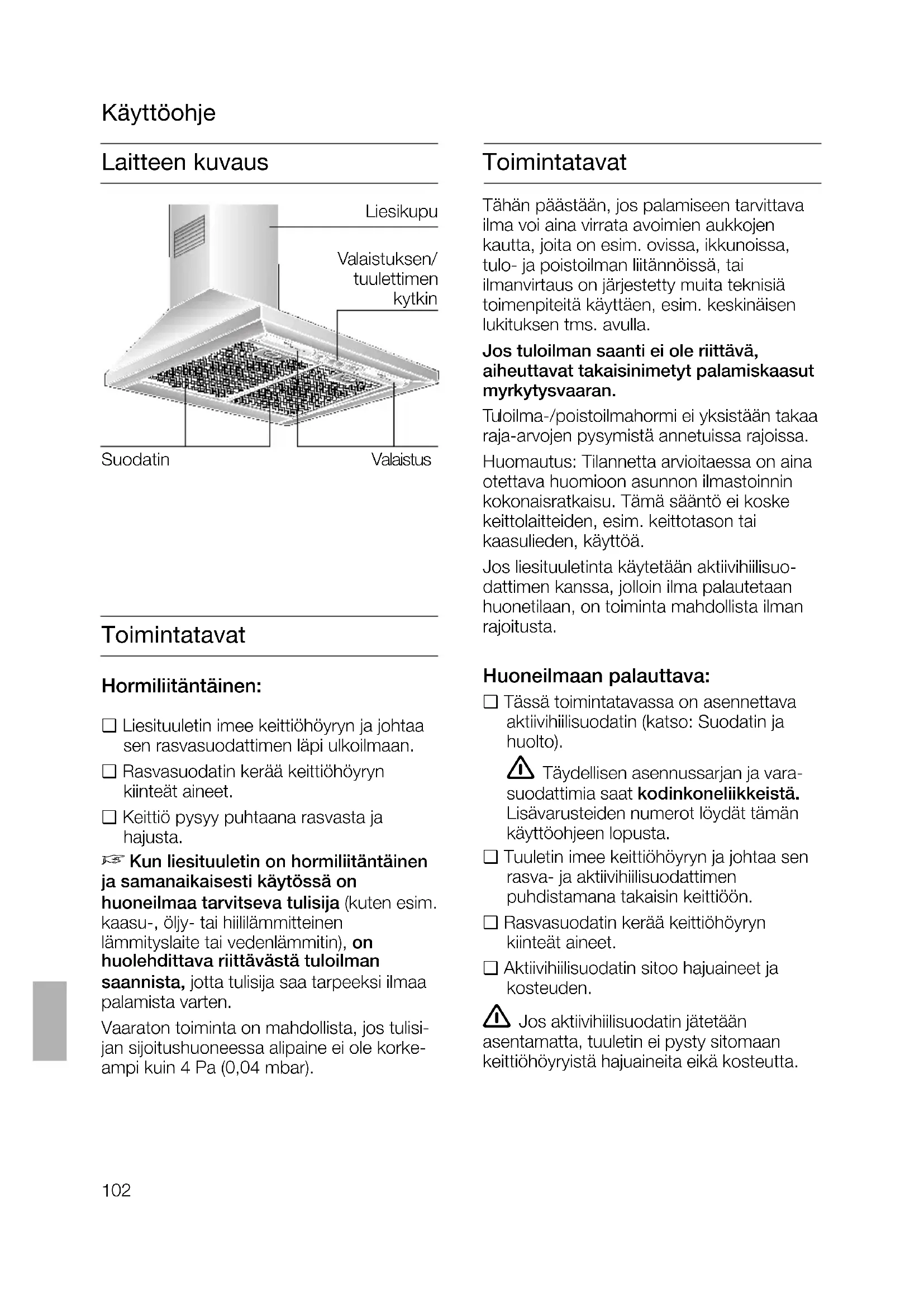 siden av holdevinkelen.102 Laitteen kuvaus Toimintatavat Hormiliitäntäinen: ❑ Liesituuletin imee keittiöhöyryn ja johtaa sen rasvasuodattimen läpi ulkoilmaan. ❑ Rasvasuodatin kerää keittiöhöyryn kiinteät aineet. ❑ Keittiö pysyy puhtaana rasvasta ja hajusta.