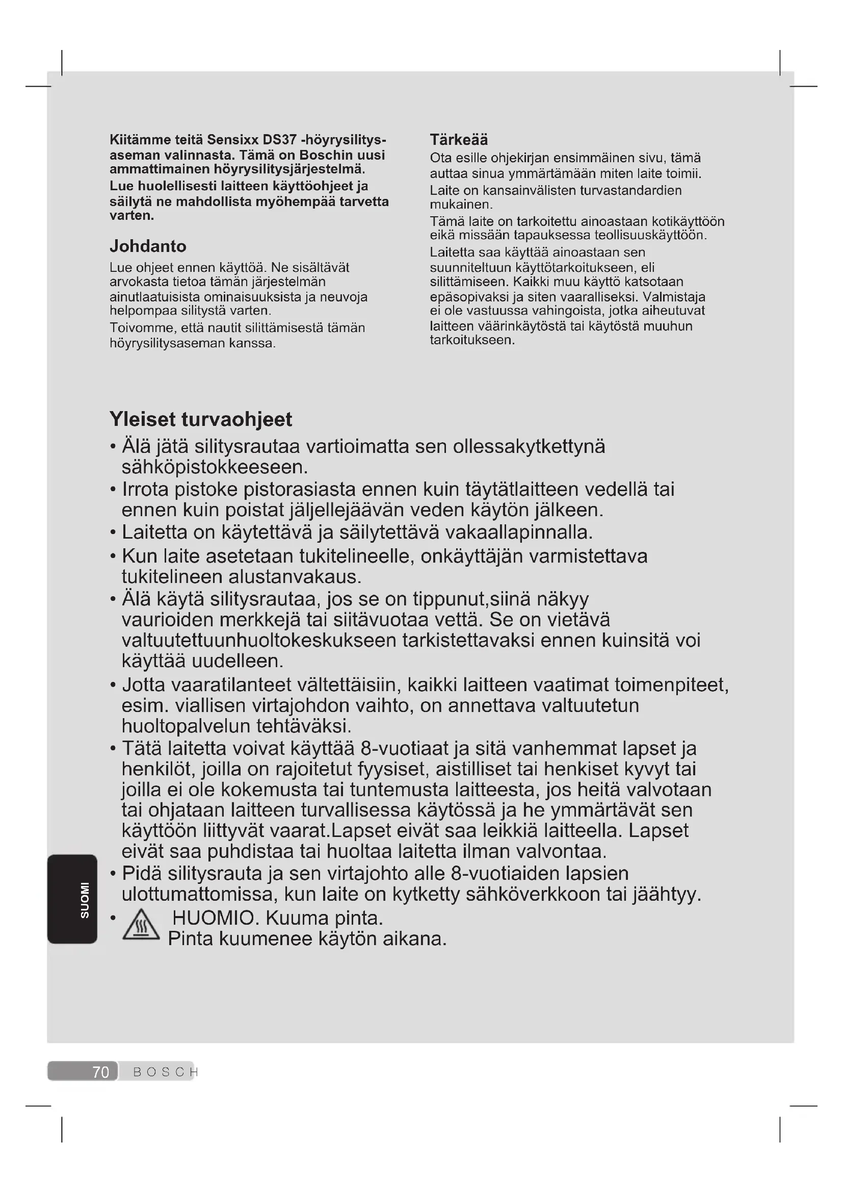 KiitämmeteitäSensixxDS37-höyrysilitys- asemanvalinnasta.TämäonBoschinuusi ammattimainenhöyrysilitysjärjestelmä. Luehuolellisestilaitteenkäyttöohjeetja säilytänemahdollistamyöhempäätarvetta varten. Johdanto Lue ohjeet ennen käyttöä. Ne sisältävät arvokasta tietoa tämän järjestelmän ainutlaatuisista ominaisuuksista ja neuvoja helpompaa silitystä varten. Toivomme, että nautit silittämisestä tämän höyrysilitysaseman kanssa. Tärkeää Ota esille ohjekirjan ensimmäinen sivu, tämä auttaa sinua ymmärtämään miten laite toimii. Laite on kansainvälisten turvastandardien mukainen. Tämä laite on tarkoitettu ainoastaan kotikäyttöön eikä missään tapauksessa teollisuuskäyttöön. Laitetta saa käyttää ainoastaan sen suunniteltuun käyttötarkoitukseen, eli silittämiseen. Kaikki muu käyttö katsotaan epäsopivaksi ja siten vaaralliseksi. Valmistaja ei ole vastuussa vahingoista, jotka aiheutuvat laitteen väärinkäytöstä tai käytöstä muuhun tarkoitukseen. Yleisetturvaohjeet