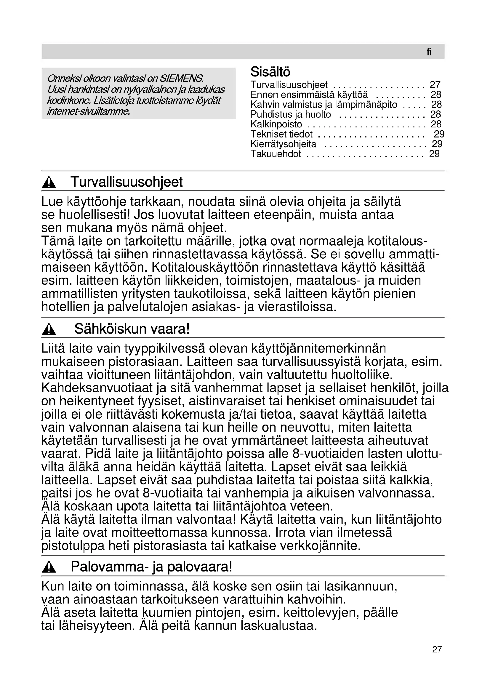 Onneksi olkoon valintasi on SIEMENS. Uusi hankintasi on nykyaikainen ja laadukas kodinkone. Lisätietoja tuotteistamme löydät internet-sivuiltamme.28 , Tukehtumisvaara! Älä anna lasten leikkiä pakkausmateriaalilla. Käyttöohje on tarkoitettu eri malleille: – Perusmallissa (kuva 6a) on vain virtakytkin,– Mallissa (kuva 6b) on lisäksi kuppimäärän valitsin,Kaikissa malleissa on automaattinen virran-katkaisu »auto off« (energiansäästö), joka katkaisee laitteesta virran noin 40 minuutin kuluttua. Ennen ensimmäistä käyttöä Huuhtele keitin kahteen kertaan keittämällä siinä 9 kupillista vettä. Jos huomaat laitteesta lähtevän vaaratonta uutuuden hajua.Jos huomaat laitteesta lähtevän vaaratonta uutuuden hajua, keitä siinä laimennettua etikkaliuosta (2 kupillista etikkaa ja 6 kupil-lista vettä); keitä sen jälkeen keittimessä kaksi kertaa 9 kupillista vettä. Kahvin valmistus ja lämpimänäpito Kuvat 1 − 5Täytä vesisäiliö vain puhtaalla vedellä. Älä missään tapauksessa keitä laitteessa maitoa tai valmiita juomia kuten teetä tai kahvia! (Maku muuttuu uudelleen keitet-täessä.)Aseta suodatinpaperi 1x4 suodatinosaan.Käytä puolikarkeaksi jauhettua kahvia (suositus noin 7 g kupillista kohti). Kun keität vain pari kupillista, annostele hieman enemmän kahvijauhetta kuin monta kupillista valmistettaessa. Parasta on kuitenkin keittää vähintään kolme isoa kupillista, jotta kahvista tulee sopivan kuumaa ja vahvuista.= n. 125 ml = n. 85 mlLämpölevy pysyy virrankatkaisun jälkeen vielä jonkin aikaa lämpimänä.Anna kahvinkeittimen jäähtyä viisi minuuttia, ennen kuin täytät sen uudelleen vedellä.Voit käyttää kahvinkeitintä myös teen valmistamiseen. Kuppimäärän valitsin Voit valita kahvin vahvuuden ja aromin aset-tamalla valitsimen asentoon 3–6 (3–6 kupillista) tai 7–10 (7–10 kupillista). Puhdistus ja huolto Sähköiskun vaara! Irrota pistotulppa pistorasiasta ennen laitteen puhdistusta. Älä koskaan upota laitetta veteen tai pese sitä astianpesukoneessa. Älä käytä höyrypuhdistinta. Pese käytön jälkeen aina kaikki keittimen osat, jotka joutuvat kosketuksiin kahvin kanssa. Keittimeen jäänyt kahvi vaikuttaa uuden kahvin makuun.Voit pestä astianpesukoneessa kaikki irrotet-tavat osat, mutta älä sijoita niitä lämpövas-tuksen yläpuolelle tai niin, että ne jäävät puristuksiin (muoto saattaa muuttua).Pyyhi rungon ulkopinta puhtaaksi kostealla liinalla. Älä käytä hankaavia puhdistusmenetelmiä. Kalkinpoisto Poista kalkki säännöllisesti, mutta viimei-stään silloin, kun– keittoaika pitenee,– höyryä muodostuu tavallista enemmän,– keittimen ääni voimistuu.Annostele kalkinpoistoaine valmistajan ohjeiden mukaan ja kaada liuos vesisäiliöön.Anna liuoksen seistä 5 minuuttia. Käynnistä sitten keitin, katkaise virta minuutin kuluttua ja anna aineen vaikuttaa 10 minuuttia. Toista toimenpiteet vähintään kolme kertaa (kalkkimäärän mukaan useammin). Anna jäljelle jääneen liuoksen valua keittimen läpi.Keitä sitten keittimessä kaksi kertaa 9 kupil-lista puhdasta vettä.Jos mallissa on kuppimäärän valitsin, aseta se kalkinpoiston ajaksi asentoon 3–6 kupillista.Huuhdo kaikki irrotettavat osat huolellisesti. fi29 Kalkinpoistosuositus Poista kalkki 6 viikon välein veden kovuuden ollessa normaali ja käytettäessä keitintä päivittäin. Jos käytät etikka tai sitruunapohjaisia kalkinpoistoaineita, poista kalkki 3 viikon välein. Tekniset tiedot Kierrätysohjeita Tässä laitteessa on sähkö- ja elektroniik-kalaiteromusta annetun EU-direktiivin 2012/19/EY mukainen merkintä (waste electrical and electronic equipment – WEEE). Direktiivi antaa puitteet käytöstä poistettujen laitteiden palautusoikeudesta ja hyödyntä- misestä ja se koskee kaikkia EU-maita. Tarkempia tietoja kierrätysmahdollisuuksista saat koneen myyjältä sekä kaupungin tai kunnan virastosta, jätehuoltoasioista vastaavilta henkilöiltä. Takuuehdot Tälle laitteelle ovat voimassa maahantuojan myöntämät takuuehdot. Täydelliset takuuehdot saat myyntiliikkeeltä, josta olet ostanut laitteen. Takuutapauksessa on näytettävä ostokuitti.