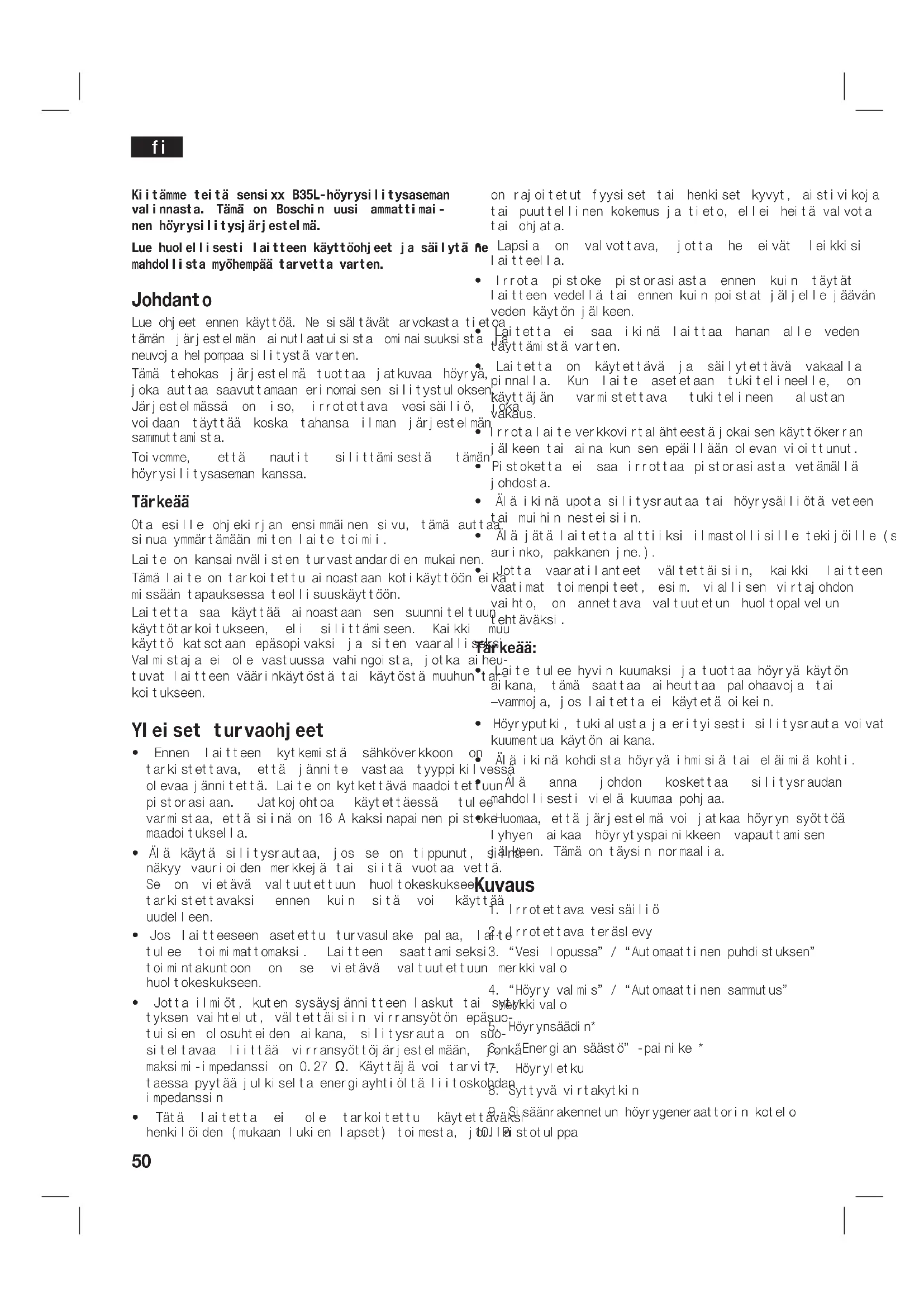 Kiitämme teitä sensixx B35L-höyrysilitysaseman valinnasta. Tämä on Boschin uusi ammattimai- nen höyrysilitysjärjestelmä. Lue huolellisesti laitteen käyttöohjeet ja säilytä ne mahdollista myöhempää tarvetta varten. Johdanto Lue ohjeet ennen käyttöä. Ne sisältävät arvokasta tietoa tämän järjestelmän ainutlaatuisista ominaisuuksista ja neuvoja helpompaa silitystä varten. Tämä tehokas järjestelmä tuottaa jatkuvaa höyryä, joka auttaa saavuttamaan erinomaisen silitystuloksen. Järjestelmässä on iso, irrotettava vesisäiliö, joka voidaan täyttää koska tahansa ilman järjestelmän sammuttamista. Toivomme, että nautit silittämisestä tämän höyrysilitysaseman kanssa. Tärkeää Ota esille ohjekirjan ensimmäinen sivu, tämä auttaa sinua ymmärtämään miten laite toimii. Laite on kansainvälisten turvastandardien mukainen. Tämä laite on tarkoitettu ainoastaan kotikäyttöön eikä missään tapauksessa teollisuuskäyttöön. Laitetta saa käyttää ainoastaan sen suunniteltuun käyttötarkoitukseen, eli silittämiseen. Kaikki muu käyttö katsotaan epäsopivaksi ja siten vaaralliseksi. Valmistaja ei ole vastuussa vahingoista, jotka aiheu- tuvat laitteen väärinkäytöstä tai käytöstä muuhun tar- koitukseen. Yleiset turvaohjeet Ennen laitteen kytkemistä sähköverkkoon on tarkistettava, että jännite vastaa tyyppikilvessä olevaa jännitettä. Laite on kytkettävä maadoitettuun pistorasiaan. Jatkojohtoa käytettäessä tulee varmistaa, että siinä on 16 A kaksinapainen pistoke maadoituksella. Älä käytä silitysrautaa, jos se on tippunut, siinä näkyy vaurioiden merkkejä tai siitä vuotaa vettä. Se on vietävä valtuutettuun huoltokeskukseen tarkistettavaksi ennen kuin sitä voi käyttää uudelleen. Jos laitteeseen asetettu turvasulake palaa, laite tulee toimimattomaksi. Laitteen saattamiseksi toimintakuntoon on se vietävä valtuutettuun huoltokeskukseen. Jotta ilmiöt, kuten sysäysjännitteen laskut tai syty- tyksen vaihtelut, vältettäisiin virransyötön epäsuo- tuisien olosuhteiden aikana, silitysrauta on suo- siteltavaa liittää virransyöttöjärjestelmään, jonka maksimi-impedanssi on 0.27 Ω. Käyttäjä voi tarvit- taessa pyytää julkiselta energiayhtiöltä liitoskohdan impedanssin Tätä laitetta ei ole tarkoitettu käytettäväksi henkilöiden (mukaan lukien lapset) toimesta, joilla on rajoitetut fyysiset tai henkiset kyvyt, aistivikoja tai puuttellinen kokemus ja tieto, ellei heitä valvota tai ohjata. Lapsia on valvottava, jotta he eivät leikkisi laitteella. Irrota pistoke pistorasiasta ennen kuin täytät laitteen vedellä tai ennen kuin poistat jäljelle jäävän veden käytön jälkeen. Laitetta ei saa ikinä laittaa hanan alle veden täyttämistä varten. Laitetta on käytettävä ja säilytettävä vakaalla pinnalla. Kun laite asetetaan tukitelineelle, on käyttäjän varmistettava tukitelineen alustan vakaus. Irrota laite verkkovirtalähteestä jokaisen käyttökerran jälkeen tai aina kun sen epäillään olevan vioittunut. Pistoketta ei saa irrottaa pistorasiasta vetämällä johdosta. Älä ikinä upota silitysrautaa tai höyrysäiliötä veteen tai muihin nesteisiin. Älä jätä laitetta alttiiksi ilmastollisille tekijöille (sade, aurinko, pakkanen jne.). Jotta vaaratilanteet vältettäisiin, kaikki laitteen vaatimat toimenpiteet, esim. viallisen virtajohdon vaihto, on annettava valtuutetun huoltopalvelun tehtäväksi. Tärkeää: Laite tulee hyvin kuumaksi ja tuottaa höyryä käytön aikana, tämä saattaa aiheuttaa palohaavoja tai –vammoja, jos laitetta ei käytetä oikein. Höyryputki, tukialusta ja erityisesti silitysrauta voivat kuumentua käytön aikana. Älä ikinä kohdista höyryä ihmisiä tai eläimiä kohti. Älä anna johdon koskettaa silitysraudan mahdollisesti vielä kuumaa pohjaa. Huomaa, että järjestelmä voi jatkaa höyryn syöttöä lyhyen aikaa höyrytyspainikkeen vapauttamisen jälkeen. Tämä on täysin normaalia. Kuvaus