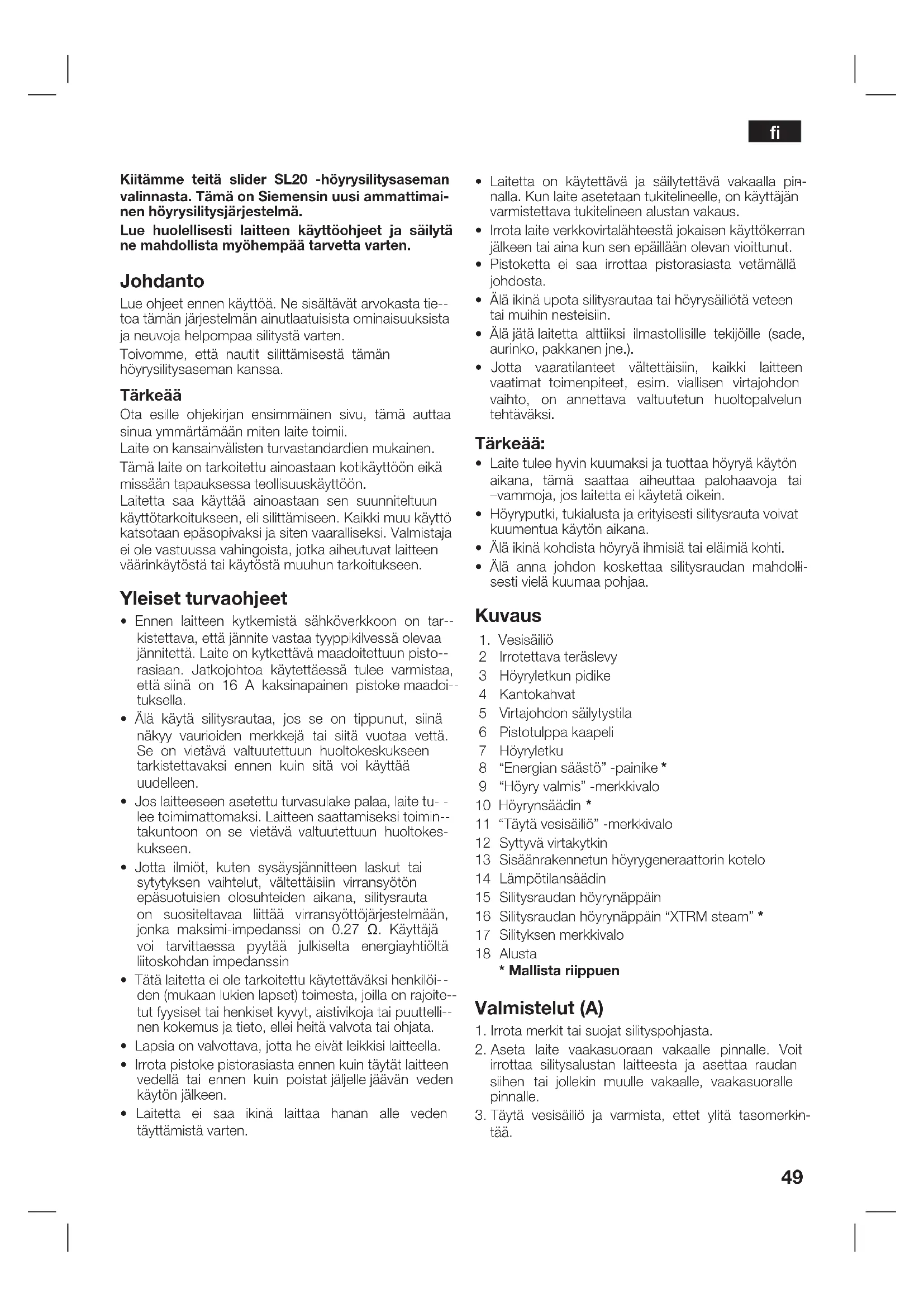 Kiitämme teitä slider SL20 -höyrysilitysaseman valinnasta. Tämä on Siemensin uusi ammattimai-