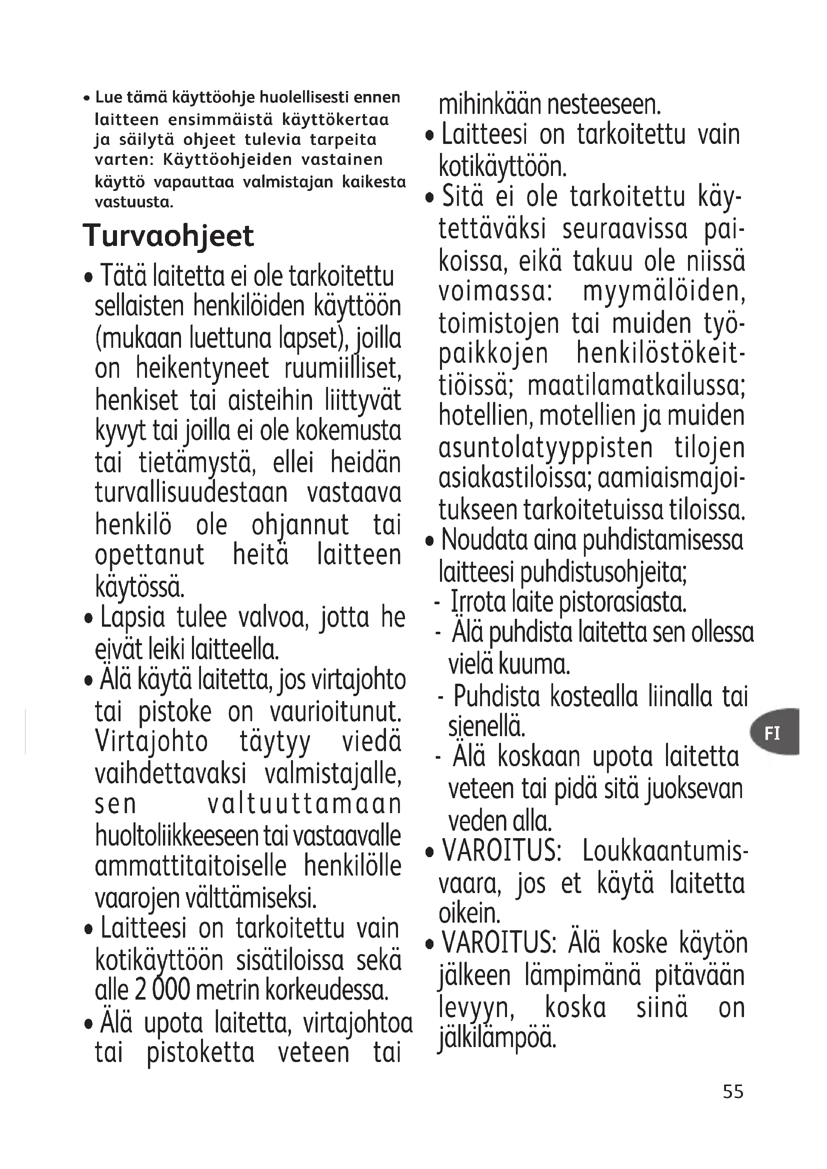 - Tätä laitetta voivat käyttää vähintään 8-vuotiaat lapset edellyttäen, että he ovat aikuisen valvonnassa ja ovat saaneet ohjausta laitteen turvallisessa käytössä, ja he ymmärtävät siihen liittyvät vaarat. Lapset eivät saa puhdistaa tai tehdä kunnossapitotoimenpiteitä, jos he eivät ole yli 8-vuotiaita ja aikuisen valvonnan alla.