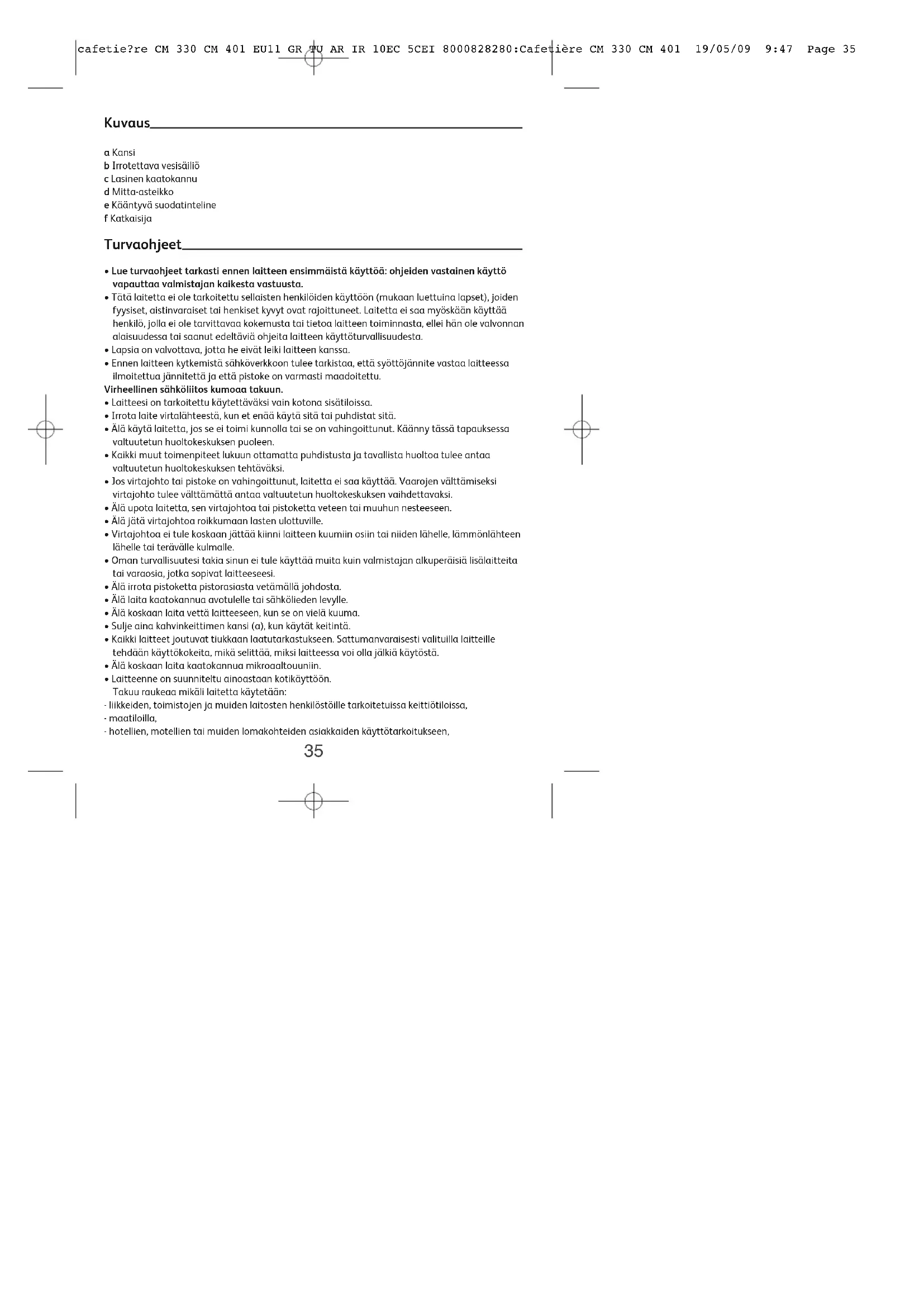 cafetie?re CM 330 CM 401 EU11 GR TU AR IR 10EC 5CEI 8000828280:Cafetière CM 330 CM 401 19/05/09 9:47 Page 34Kuvaus a Kansi b Irrotettava vesisäiliö c Lasinen kaatokannu d Mitta-asteikko e Kääntyvä suodatinteline f Katkaisija Turvaohjeet