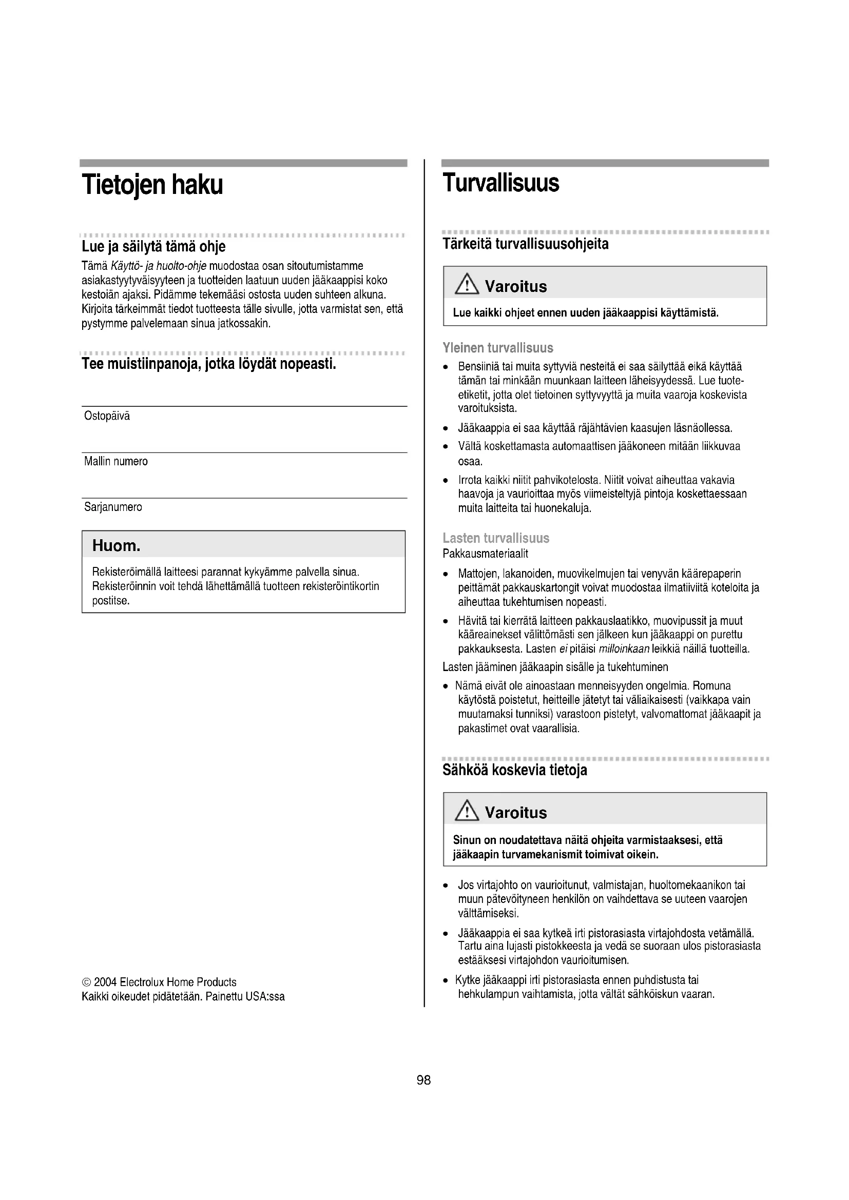 © 2004 Electrolux Home Products Kaikki oikeudet pidätetään. Painettu USA:ssa Turvallisuus Tärkeitä turvallisuusohjeita Varoitus Lue kaikki ohjeet ennen uuden jääkaappisi käyttämistä. Yleinen turvallisuus