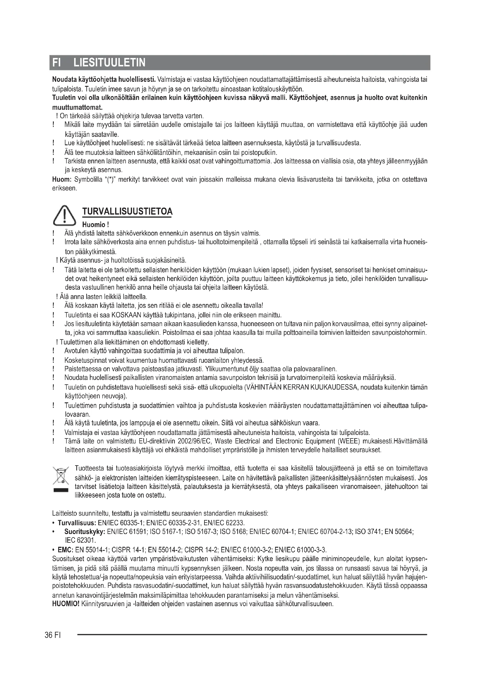 - EMC: EN 55014-1; CISPR 14-1; EN 55014-2; CISPR 14-2; EN/IEC 61000-3-2; EN/IEC 61000-3-3. Suositukset oikeaa käyttöä varten ympäristövaikutusten vähentämiseksi: Kytke liesikupu päälle miniminopeudelle, kun aloitat kypsen- tämisen, ja pidä sitä päällä muutama minuutti kypsennyksen jälkeen. Nosta nopeutta vain, jos tilassa on runsaasti savua tai höyryä, ja käytä tehostettua/-ja nopeutta/nopeuksia vain erityistarpeessa. Vaihda aktiivihiilisuodatin/-suodattimet, kun haluat säilyttää hyvän hajujen- poistotehokkuuden. Puhdista rasvasuodatin/-suodattimet, kun haluat säilyttää hyvän rasvansuodatustehokkuuden. Käytä tässä oppaassa annetun kanavointijärjestelmän maksimiläpimittaa tehokkuuden parantamiseksi ja melun vähentämiseksi. HUOMIO! Kiinnitysruuvien ja -laitteiden ohjeiden vastainen asennus voi vaikuttaa sähköturvallisuuteen.37FI KÄYTTÖ Tuuletin on tarkoitettu käytettäväksi joko imukupuversiona ulkoisella poistolla tai suodatinversiona Sisäilmaa kierrättäen. Imukupuversio Höyry poistuu ulos liitoslaippaan kiinnitetyn poistoputken kautta. Poistoputken on oltava halkaisijaltaan samankokoinen kuin liitosrengas. Huomio! Poistoputki ei kuulu varustukseen ja se on ostettava erikseen. Vaakasuorassa osassa putken on taivuttava hieman ylöspäin (noin 10°), siten että ilma kulkeutuu helpommin ulos. Jos tuulettimessa on hiilisuodattimet, ne on irrotettava. Liitä liesituuletin poistoputkiin sekä seinän poistoaukkoihin, joiden halkaisija on yhtä suuri kuin ilman ulostuloaukossa (liitäntälaipassa). Halkaisijaltaan pienempien poistoputkien ja seinän poistoaukkojen käyttö aiheuttaa imutehon pienentymistä ja meluisuuden huomattavan lisäyksen. Kieltäydytään siten kaikesta vastuusta kyseisessä tapauksessa. ! Käytä mahdollisimman lyhyttä putkea. ! Käytä putkea, jossa on mahdollisimman vähän mutkia ( max taivutus: 90°) ! Älä tee suuria muutoksia putkiston alueella. ! Käytä sisäpinnaltaan mahdollisimman sileää putkea. ! Putkimateriaalin on oltava normien mukaista. Suodatinversio Suodatetusta ilmasta poistuu rasva ja pahat hajut ennen kuin se palautuu takaisin huoneistoon. Kun tuuletinta käytetään tässä toiminta- mallissa, siihen on asennettava aktiivihiili lisäsuodatinjärjestelmä. ASENNUS Lieden keittotason tukipinnan ja keittiötuulettimen alimman osan välinen minimietäisyys on oltava vähintään 55cm sähköliesien osalta ja 65cm kaasu- ja sekaliesien osalta. Jos kaasulieden käyttöohjeissa vaaditaan suurempi etäisyys, on se otettava huomioon. Sähköliitäntä Verkon jännitteen on oltava sama kuin tuulettimen sisäpuolella olevassa tyyppikilvessä ilmoitettu jännite. Jos laitteessa on pistoke, liitä tuuletin voimassaolevien normien mukaiseen pistorasiaan, joka sijaitsee sellaisessa paikassa, että siihen pääsee käsiksi myös asennuk- sen jälkeen. Jos laitteessa ei ole pistoketta (suora liitos verkkoon) tai pistoke ei ole sellaisessa paikassa että siihen pääsee käsiksi myös asennuksen jälkeen, käytä normien mukaista kaksinapaista katkaisijaa, jolla varmistetaan että laite saadaan kokonaan irti sähköverkosta, jos ylijännite kategoria on III, asennussääntöjen mukaisesti. Huomio! Tarkista aina, että verkkokaapeli on asennettu oikealla tavalla ennen kuin yhdistät tuulettimen sähköverkkoon ja tarkistat että se toimii oikein. Tuulettimessa on erityinen sähköjohto; jos johto rikkoutuu, pyydä uusi johto tekniseltä tuelta. Asennus Hyvin painava tuote, liesituulettimen siirtäminen ja asennus vaatii ainakin kaksi henkilöä. Ennen asennuksen aloittamista: