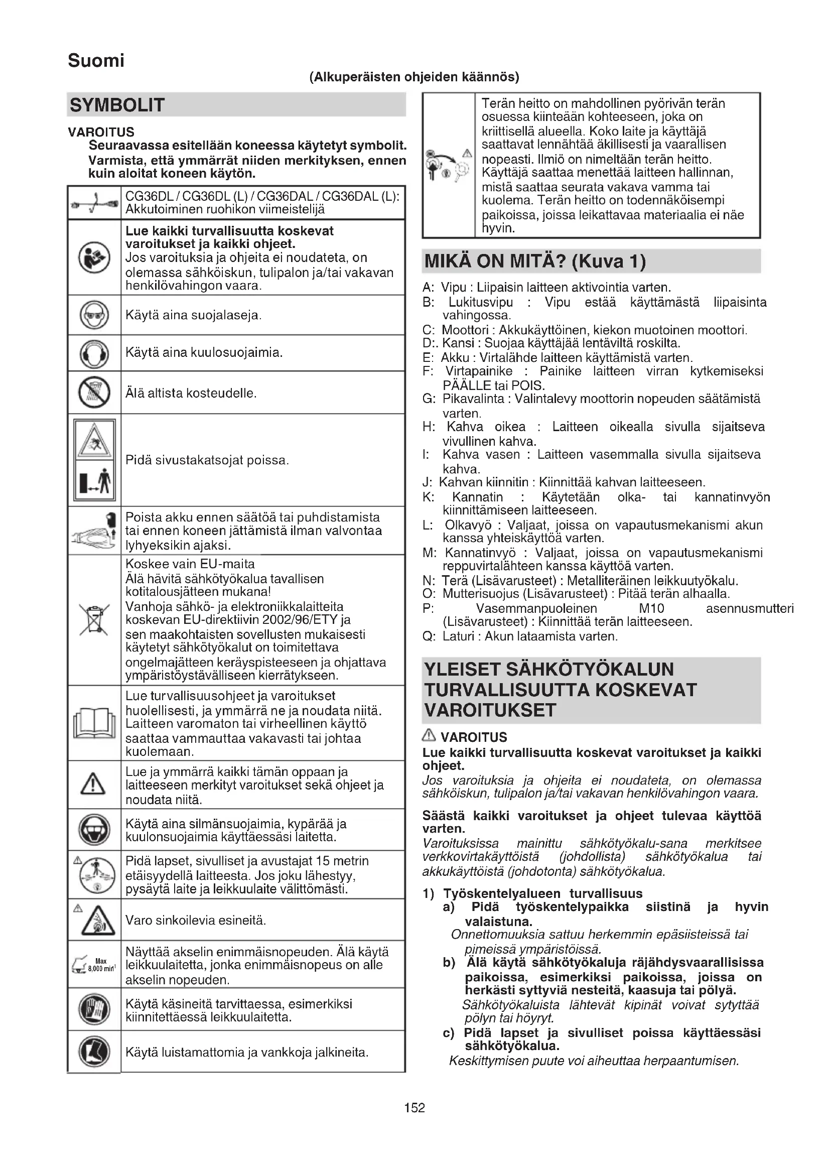 a) Pidä työskentelypaikka siistinä ja hyvin valaistuna. Onnettomuuksia sattuu herkemmin epäsiisteissä tai pimeissä ympäristöissä. b) Älä käytä sähkötyökaluja räjähdysvaarallisissa paikoissa, esimerkiksi paikoissa, joissa on herkästi syttyviä nesteitä, kaasuja tai pölyä. Sähkötyökaluista lähtevät kipinät voivat sytyttää pölyn tai höyryt. c) Pidä lapset ja sivulliset poissa käyttäessäsi sähkötyökalua. Keskittymisen puute voi aiheuttaa herpaantumisen. SYMBOLIT VAROITUS Seuraavassa esitellään koneessa käytetyt symbolit. Varmista, että ymmärrät niiden merkityksen, ennen kuin aloitat koneen käytön. CG36DL / CG36DL (L) / CG36DAL / CG36DAL (L): Akkutoiminen ruohikon viimeistelijä Lue kaikki turvallisuutta koskevat varoitukset ja kaikki ohjeet. Jos varoituksia ja ohjeita ei noudateta, on olemassa sähköiskun, tulipalon ja/tai vakavan henkilövahingon vaara. Käytä aina suojalaseja. Käytä aina kuulosuojaimia. Älä altista kosteudelle. Pidä sivustakatsojat poissa. Poista akku ennen säätöä tai puhdistamista tai ennen koneen jättämistä ilman valvontaa lyhyeksikin ajaksi. Koskee vain EU-maita Älä hävitä sähkötyökalua tavallisen kotitalousjätteen mukana! Vanhoja sähkö- ja elektroniikkalaitteita koskevan EU-direktiivin 2002/96/ETY ja sen maakohtaisten sovellusten mukaisesti käytetyt sähkötyökalut on toimitettava ongelmajätteen keräyspisteeseen ja ohjattava ympäristöystävälliseen kierrätykseen. Lue turvallisuusohjeet ja varoitukset huolellisesti, ja ymmärrä ne ja noudata niitä. Laitteen varomaton tai virheellinen käyttö saattaa vammauttaa vakavasti tai johtaa kuolemaan. Lue ja ymmärrä kaikki tämän oppaan ja laitteeseen merkityt varoitukset sekä ohjeet ja noudata niitä. Käytä aina silmänsuojaimia, kypärää ja kuulonsuojaimia käyttäessäsi laitetta. Pidä lapset, sivulliset ja avustajat 15 metrin etäisyydellä laitteesta. Jos joku lähestyy, pysäytä laite ja leikkuulaite välittömästi. Varo sinkoilevia esineitä. Max 8,000 min