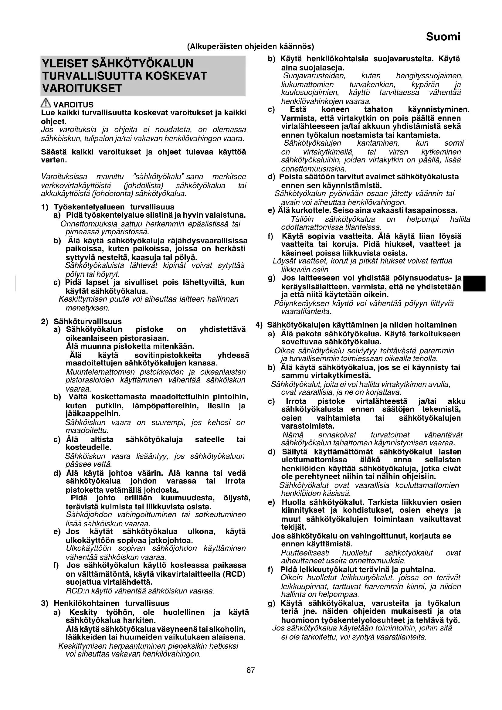 TURVALLISUUTTA KOSKEVAT VAROITUKSET VAROITUS Lue kaikki turvallisuutta koskevat varoitukset ja kaikki ohjeet. Jos varoituksia ja ohjeita ei noudateta, on olemassa sähköiskun, tulipalon ja/tai vakavan henkilövahingon vaara. Säästä kaikki varoitukset ja ohjeet tulevaa käyttöä varten. Varoituksissa mainittu ”sähkötyökalu”-sana merkitsee verkkovirtakäyttöistä (johdollista) sähkötyökalua tai akkukäyttöistä (johdotonta) sähkötyökalua.