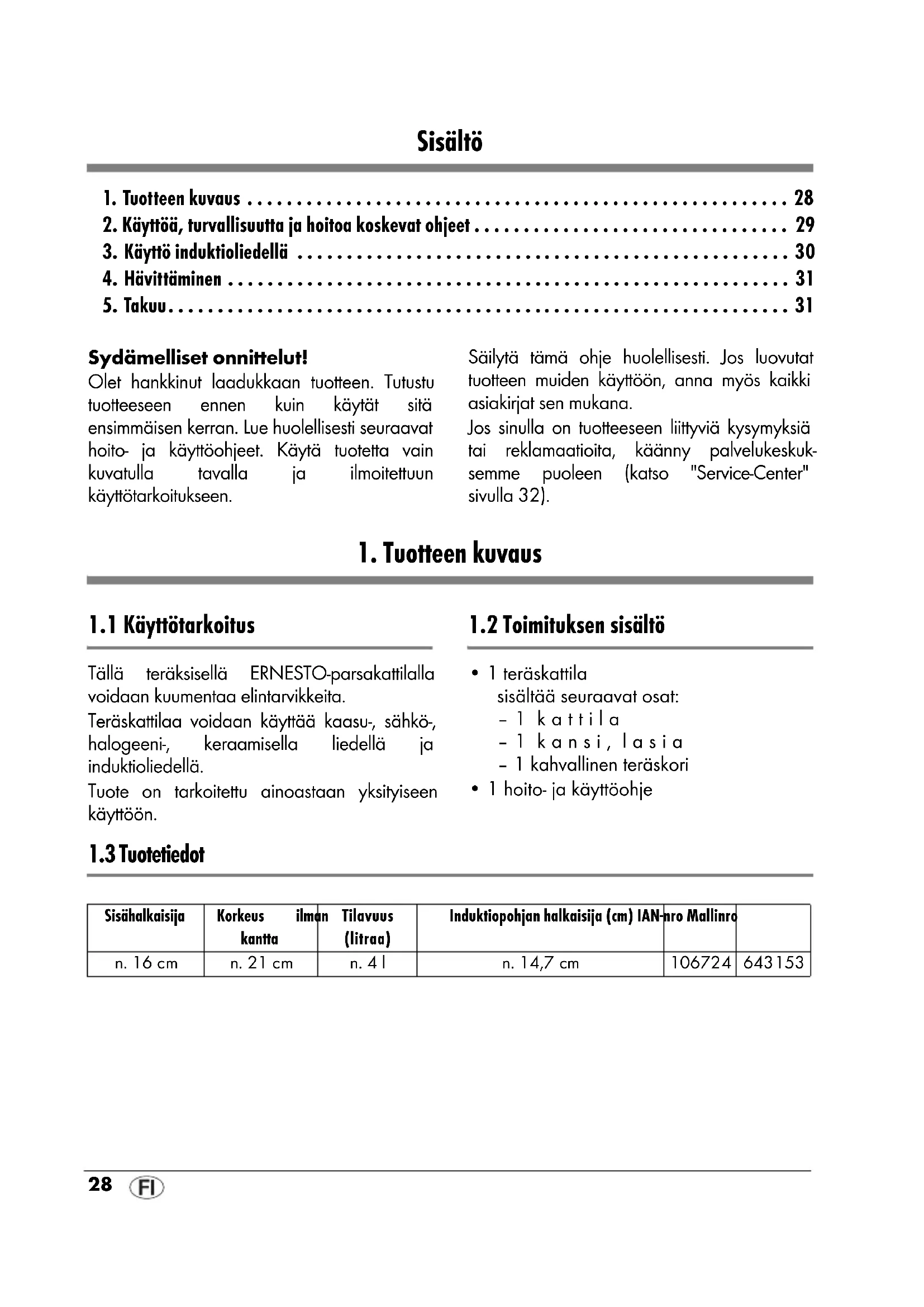 3. Käyttö induktioliedellä . . . . . . . . . . . . . . . . . . . . . . . . . . . . . . . . . . . . . . . . . . . . . . . . . . 30 4. Hävittäminen . . . . . . . . . . . . . . . . . . . . . . . . . . . . . . . . . . . . . . . . . . . . . . . . . . . . . . . . . 31 5. Takuu. . . . . . . . . . . . . . . . . . . . . . . . . . . . . . . . . . . . . . . . . . . . . . . . . . . . . . . . . . . . . . . 31 Sydämelliset onnittelut! Olet hankkinut laadukkaan tuotteen. Tutustu tuotteeseen ennen kuin käytät sitä ensimmäisen kerran. Lue huolellisesti seuraavat hoito- ja käyttöohjeet. Käytä tuotetta vain kuvatulla tavalla ja ilmoitettuun käyttötarkoitukseen. Säilytä tämä ohje huolellisesti. Jos luovutat tuotteen muiden käyttöön, anna myös kaikki asiakirjat sen mukana. Jos sinulla on tuotteeseen liittyviä kysymyksiä tai reklamaatioita, käänny palvelukeskuk- semme puoleen (katso "Service-Center" sivulla32).