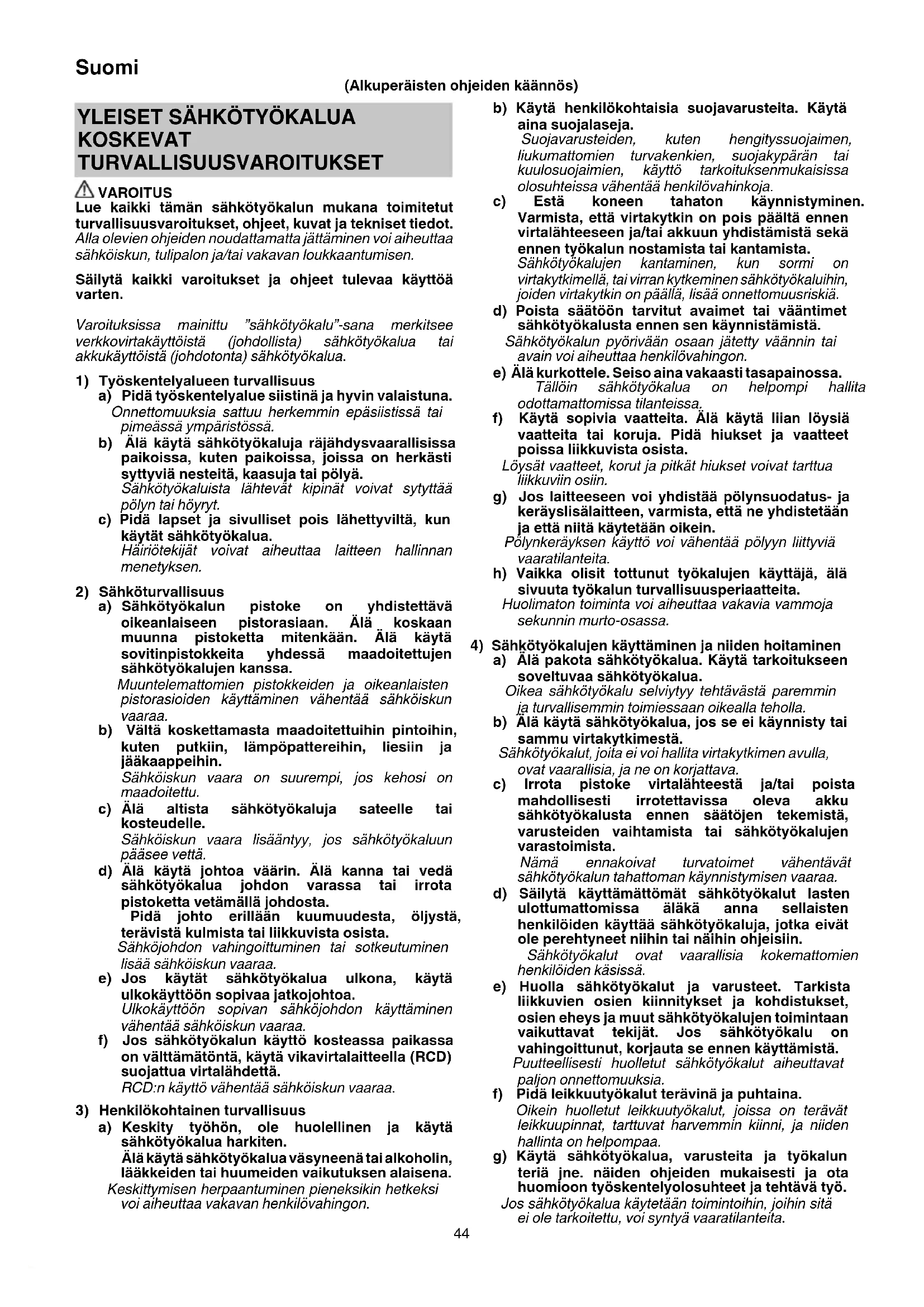a) Anna sähkötyökalu huollettavaksi valtuutetulle teknikolle, joka käyttää alkuperäisiä osia vastaavia varaosia. Tämä pitää sähkötyökalun turvallisena. TURVATOIMET Pidä lapset ja mielentilaltaan epävakaat henkilöt poissa laitteen lähettyviltä. Kun työkalua ei käytetä, se on säilytettävä poissa lasten ja mielentilaltaan epävakaiden henkilöiden ulottuvilta. PORAVASARAN TURVALLISUUTTA KOSKEVIA VAROITUKSIA Kaikkia toimintoja koskevat turvaohjeet