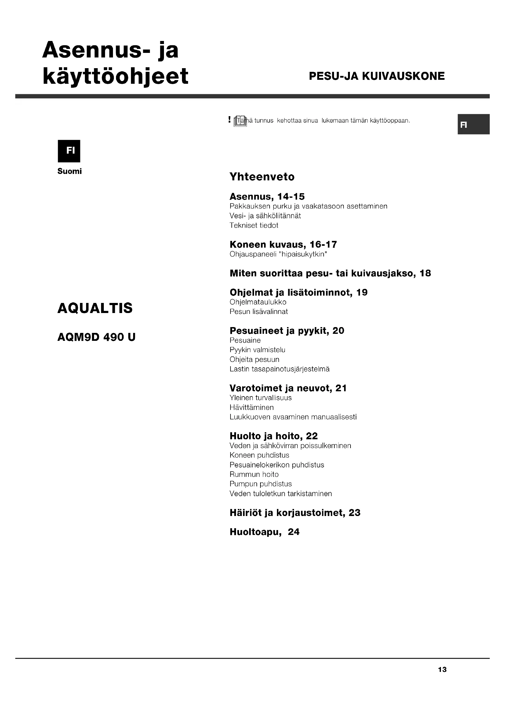 Suomi Yhteenveto Asennus, 14-15 Pakkauksen purku ja vaakatasoon asettaminenVesi- ja sähköliitännätTekniset tiedot Koneen kuvaus, 16-17 Ohjauspaneeli "hipaisukytkin" Miten suorittaa pesu- tai kuivausjakso, 18 Ohjelmat ja lisätoiminnot, 19 OhjelmataulukkoPesun lisävalinnat Pesuaineet ja pyykit, 20 PesuainePyykin valmisteluOhjeita pesuunLastin tasapainotusjärjestelmä Varotoimet ja neuvot, 21 Yleinen turvallisuusHävittäminenLuukkuoven avaaminen manuaalisesti Huolto ja hoito, 22 Veden ja sähkövirran poissulkeminenKoneen puhdistusPesuainelokerikon puhdistusRummun hoitoPumpun puhdistusVeden tuloletkun tarkistaminen Häiriöt ja korjaustoimet, 23 Huoltoapu, 24