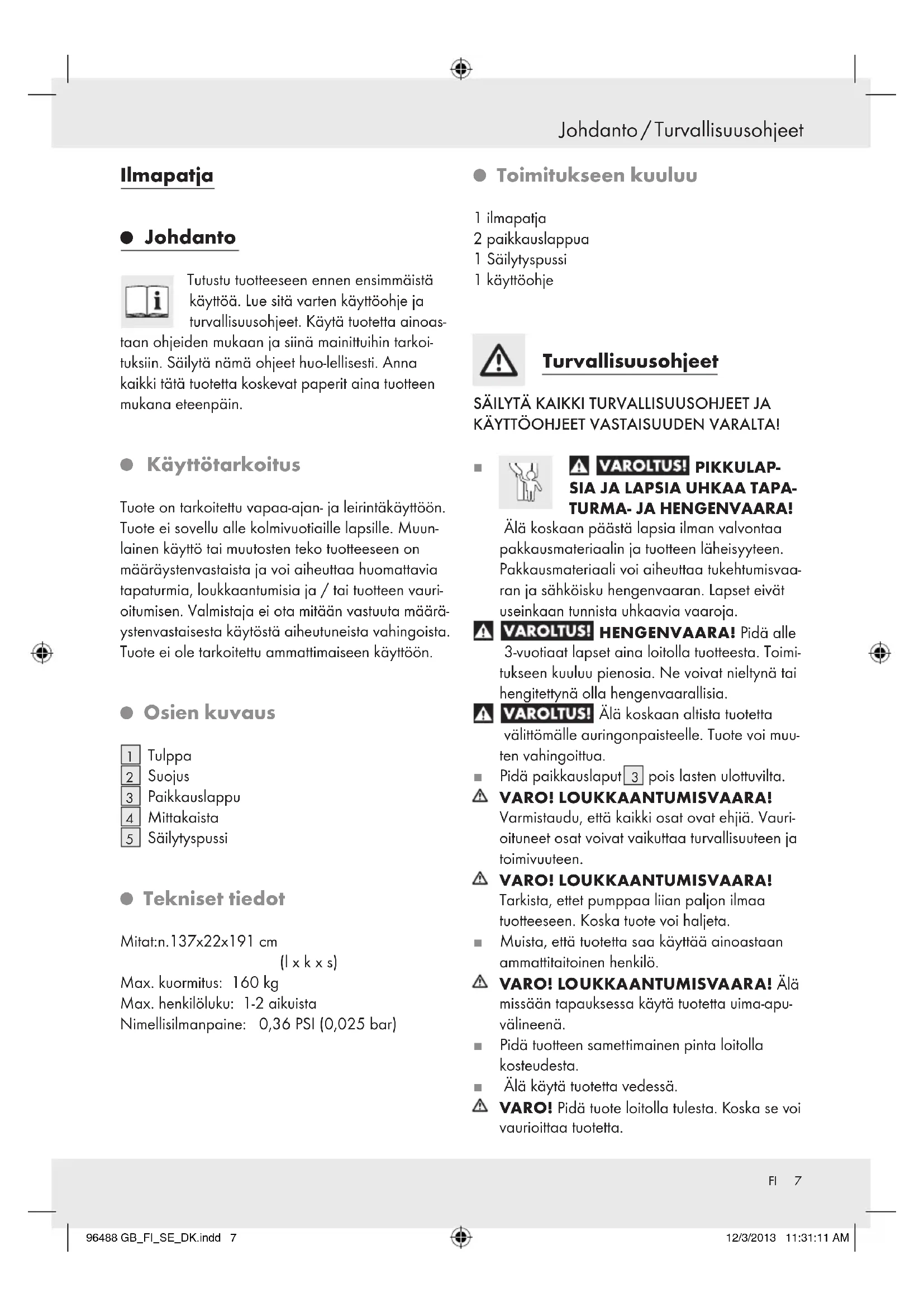 pois lasten ulottuvilta. VARO! LOUKKAANTUMISVAARA! Varmistaudu, että kaikki osat ovat ehjiä. Vauri- oituneet osat voivat vaikuttaa turvallisuuteen ja toimivuuteen. VARO! LOUKKAANTUMISVAARA! Tarkista, ettet pumppaa liian paljon ilmaa tuotteeseen. Koska tuote voi haljeta. J Muista, että tuotetta saa käyttää ainoastaan ammattitaitoinen henkilö. VARO! LOUKKAANTUMISVAARA! Älä missään tapauksessa käytä tuotetta uima-apu- välineenä. J Pidä tuotteen samettimainen pinta loitolla kosteudesta. J Älä käytä tuotetta vedessä. VARO! Pidä tuote loitolla tulesta. Koska se voi vaurioittaa tuotetta. 96488 GB_FI_SE_DK.indd 7 12/3/2013 11:31:11 AM8 FI Turvallisuusohjeet / Käyttö / Huolto